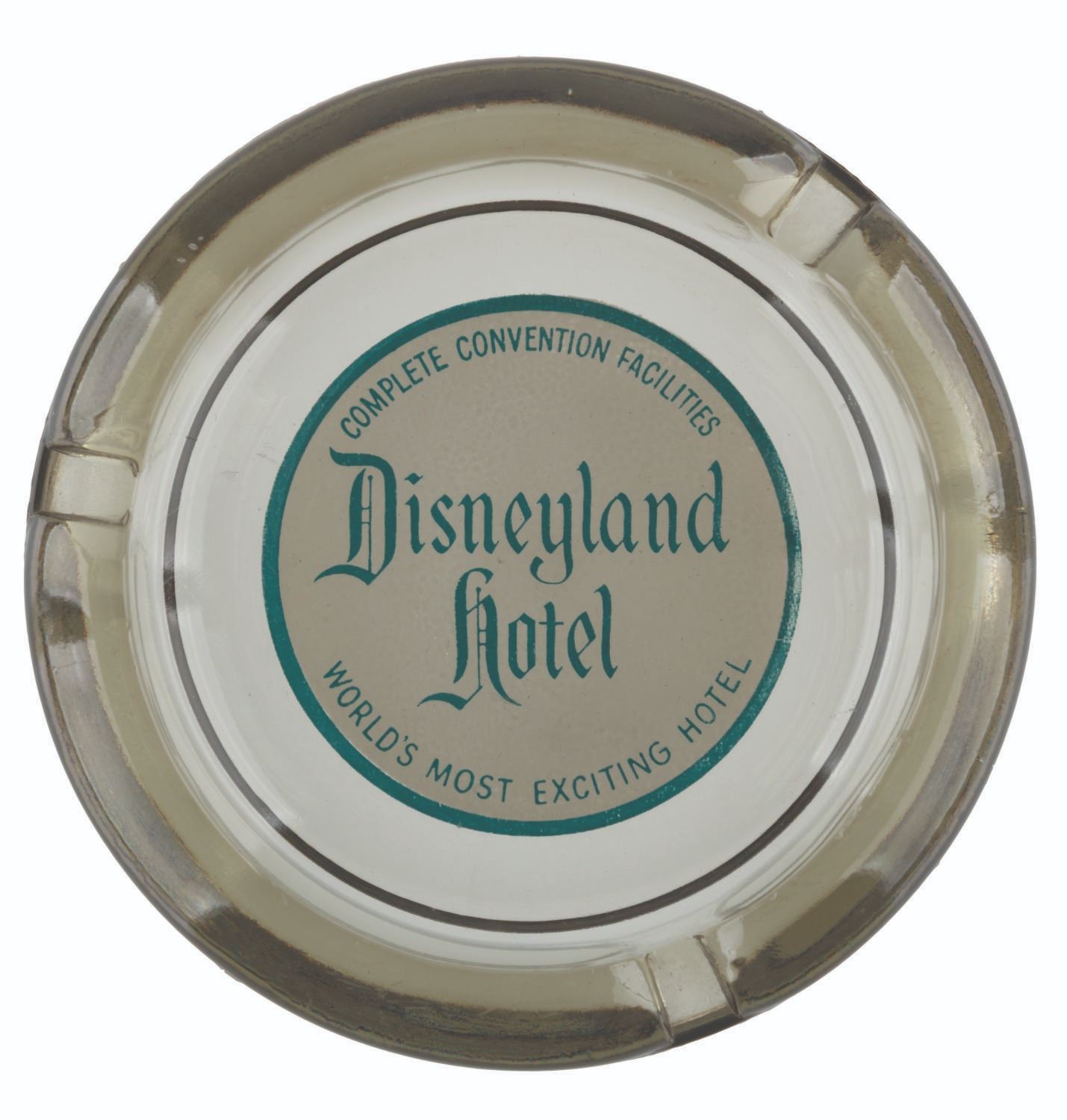 (Disneyland Hotel, 1960s) An elegant early smoked glass ashtray from the Disneyland Hotel. The well features the hotel logo and tagline "The World's Most Exciting Hotel," with "Complete Convention Facilities." Measuring 4.25" in diameter, the ashtray displays in very good condition with scratches, cracks, wear, and discoloration from age.