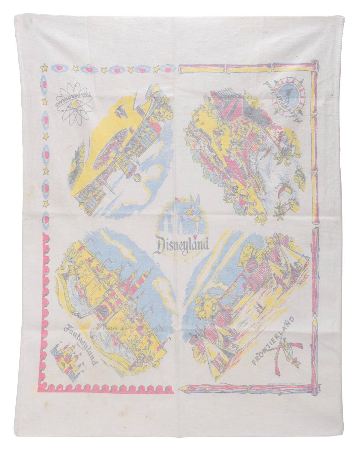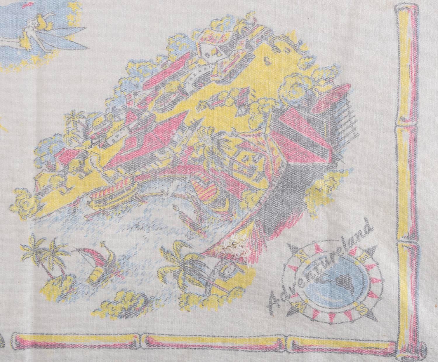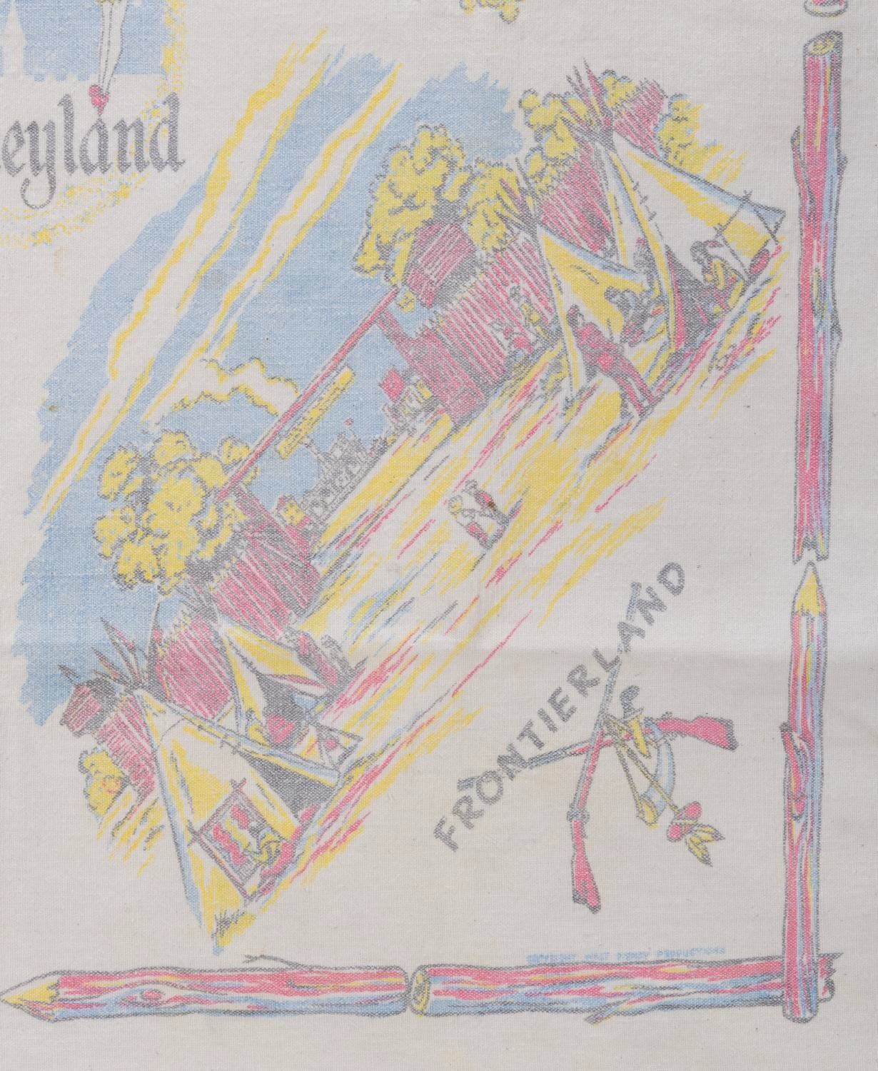 (Disneyland, 1955) A heavy linen tablecloth themed for the five original lands of Disneyland. Measuring 29.5" x 38", the tablecloth is in fair condition, with fading throughout, a 1" tear in the Adventureland image, a small puncture near Tomorrowland, and some staining to the edges.