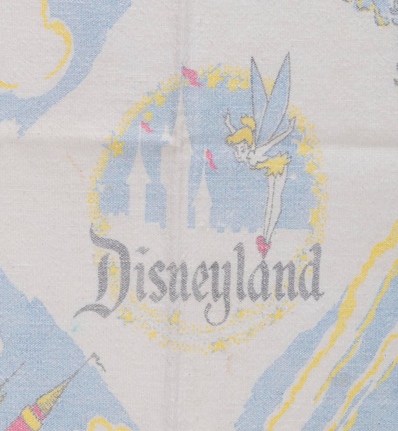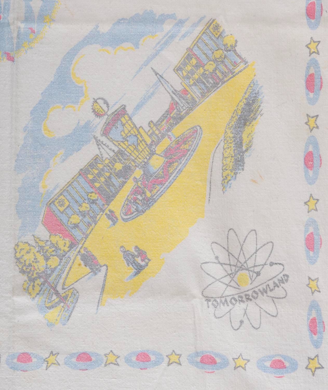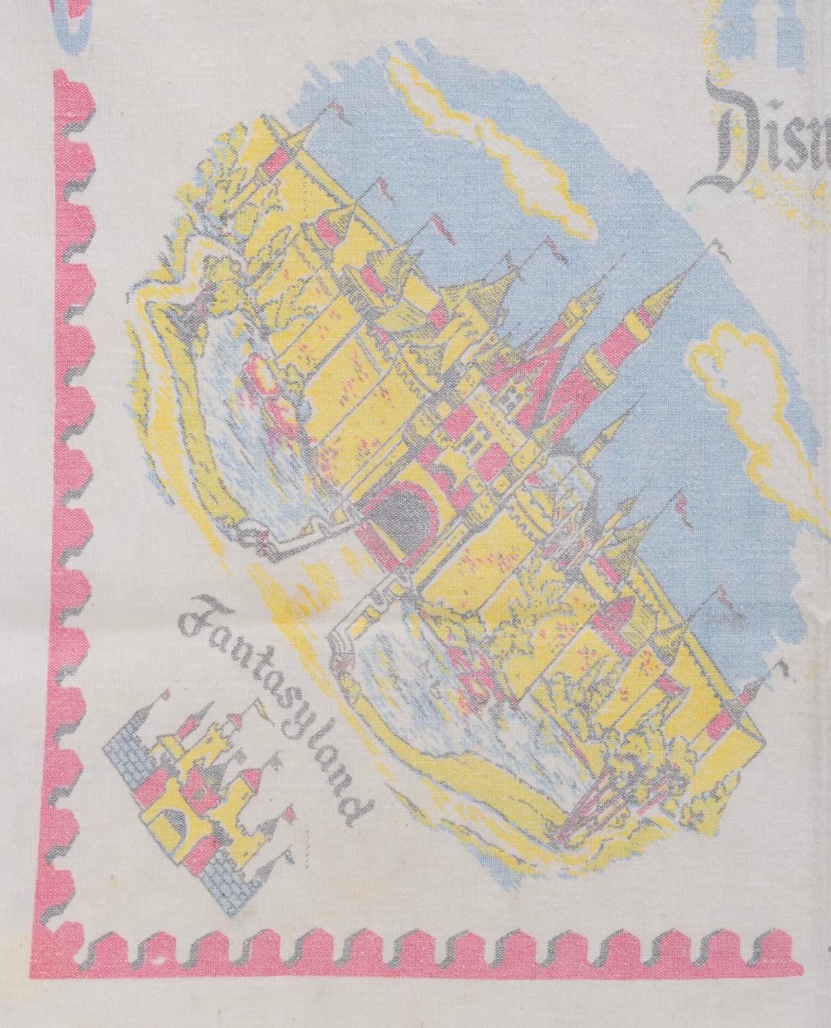 (Disneyland, 1955) A heavy linen tablecloth themed for the five original lands of Disneyland. Measuring 29.5" x 38", the tablecloth is in fair condition, with fading throughout, a 1" tear in the Adventureland image, a small puncture near Tomorrowland, and some staining to the edges.