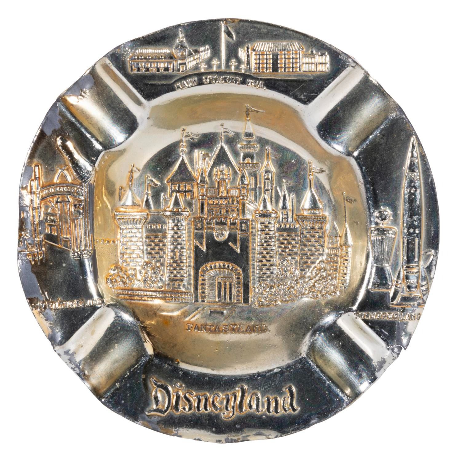 (Disneyland, 1950s-60s) A metal souvenir ashtray from Disneyland featuring Sleeping Beauty Castle and the Park lands. Measuring 4.5” in diameter, the ashtray is in good condition with discoloration from age, scuffs, wear to the metal coating, and warping from use.