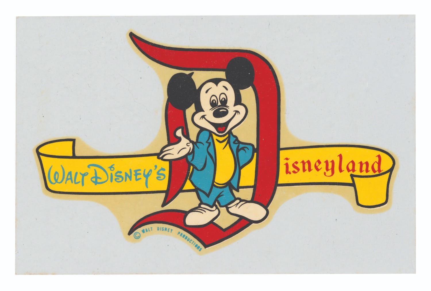 (Disneyland, 1960s-70s) An unused Disneyland decal featuring Mickey Mouse. Measuring 3.25” x 5”, the decal is in very good condition with spots of discoloration to the reverse.