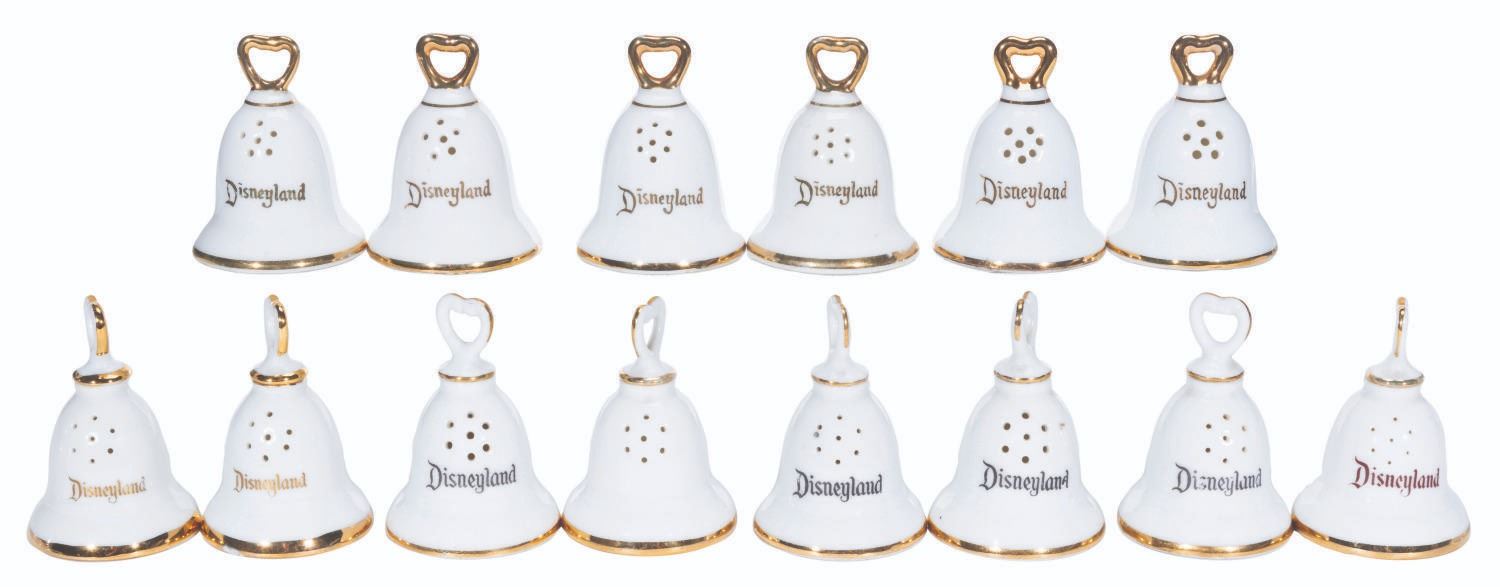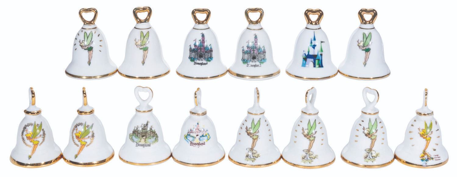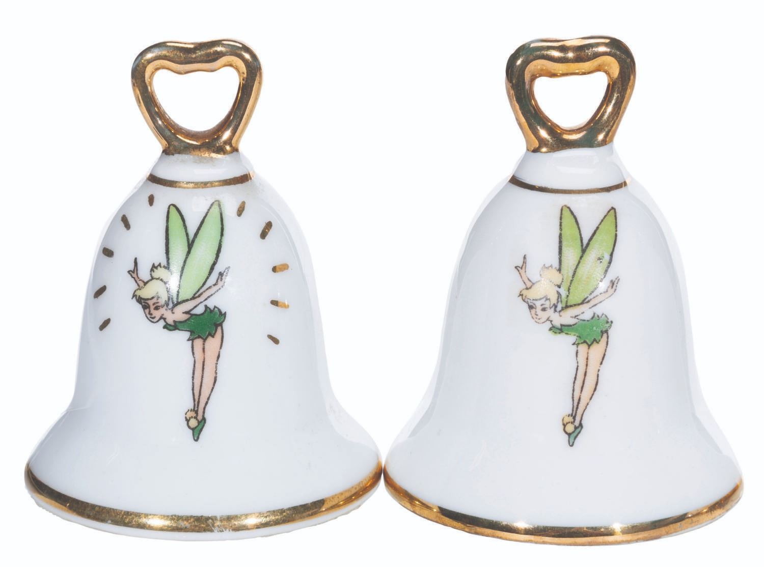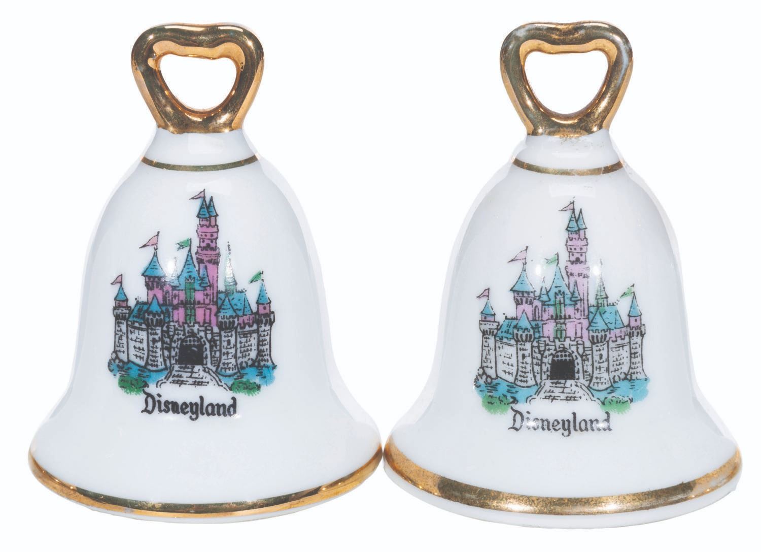 (Disneyland, 1960s-70s) A collection of 14 Disneyland souvenir salt and pepper shakers. 10 of these bell-shaped shakers feature Tinker Bell and 4 feature Sleeping Beauty Castle, all with an elegant gold-rim finish. One of the Tinker Bell shakers was created by famed Disney ceramic maker Eleanore Welborn and bears her name on the bottom. Measuring 2” in diameter and 2.5” tall, the ceramic shakers are in good to very good condition with light wear, stains, and scuffs.