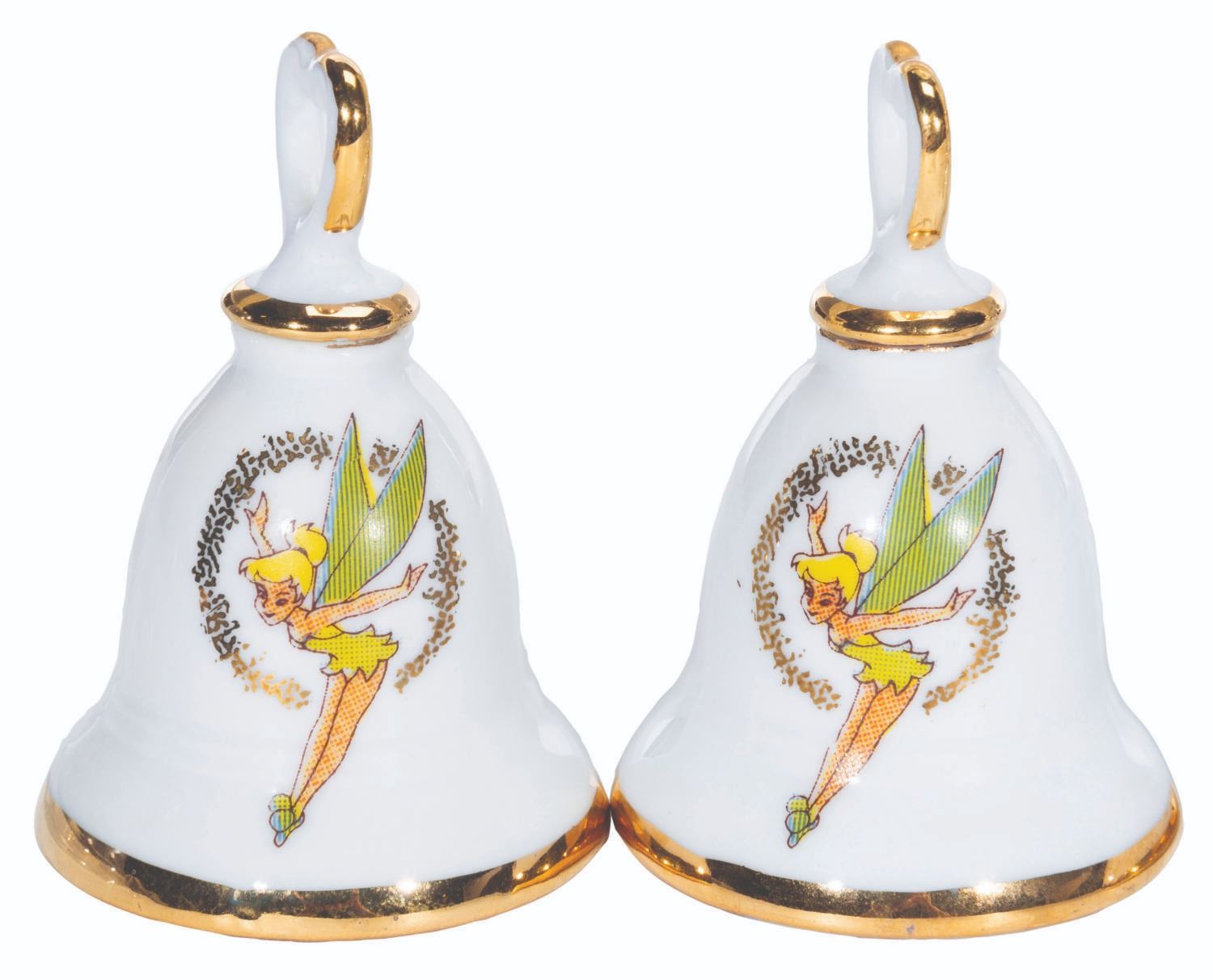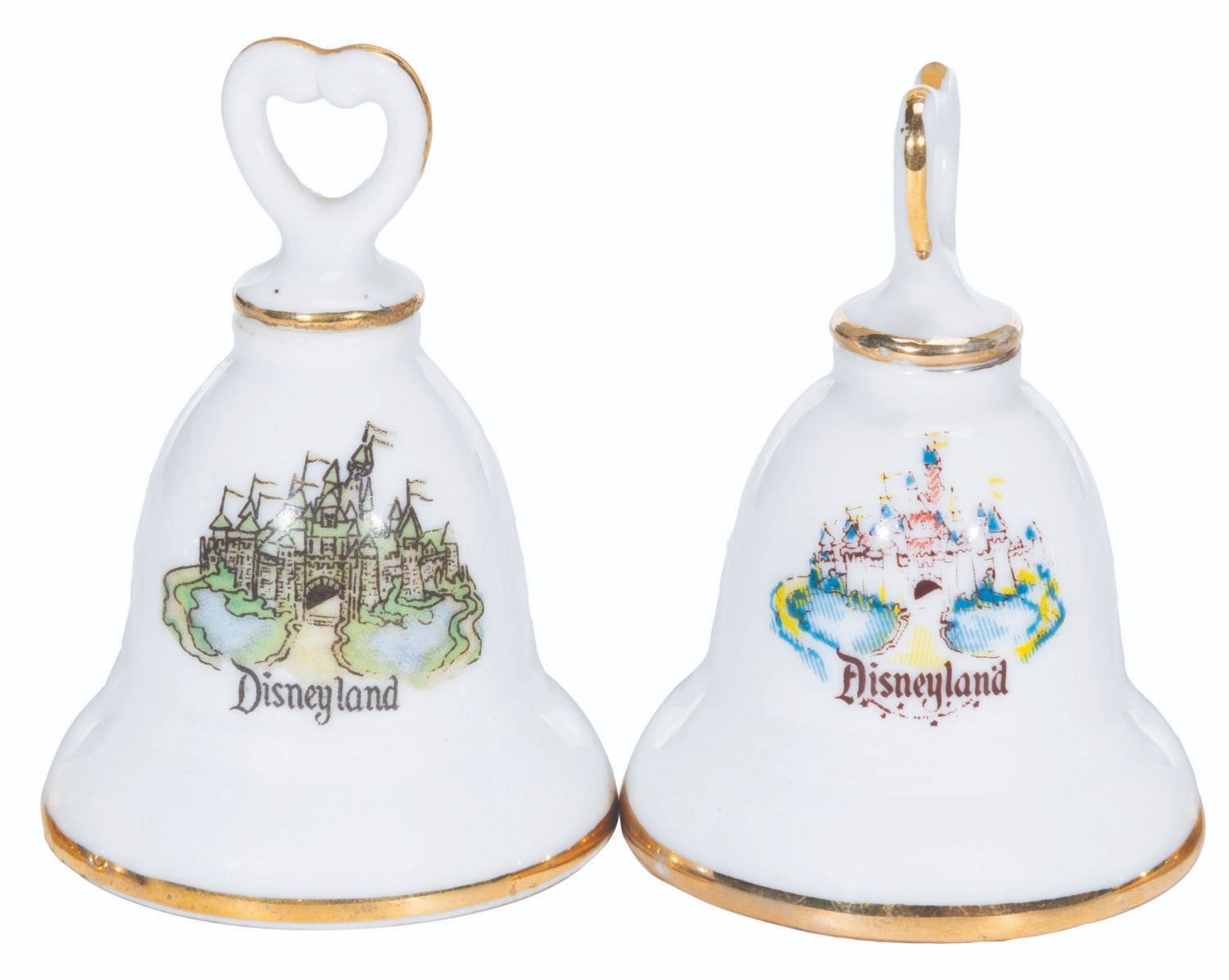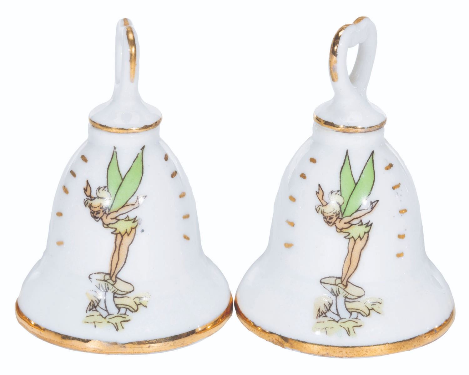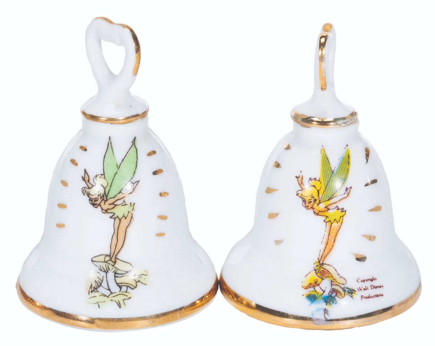 (Disneyland, 1960s-70s) A collection of 14 Disneyland souvenir salt and pepper shakers. 10 of these bell-shaped shakers feature Tinker Bell and 4 feature Sleeping Beauty Castle, all with an elegant gold-rim finish. One of the Tinker Bell shakers was created by famed Disney ceramic maker Eleanore Welborn and bears her name on the bottom. Measuring 2” in diameter and 2.5” tall, the ceramic shakers are in good to very good condition with light wear, stains, and scuffs.
