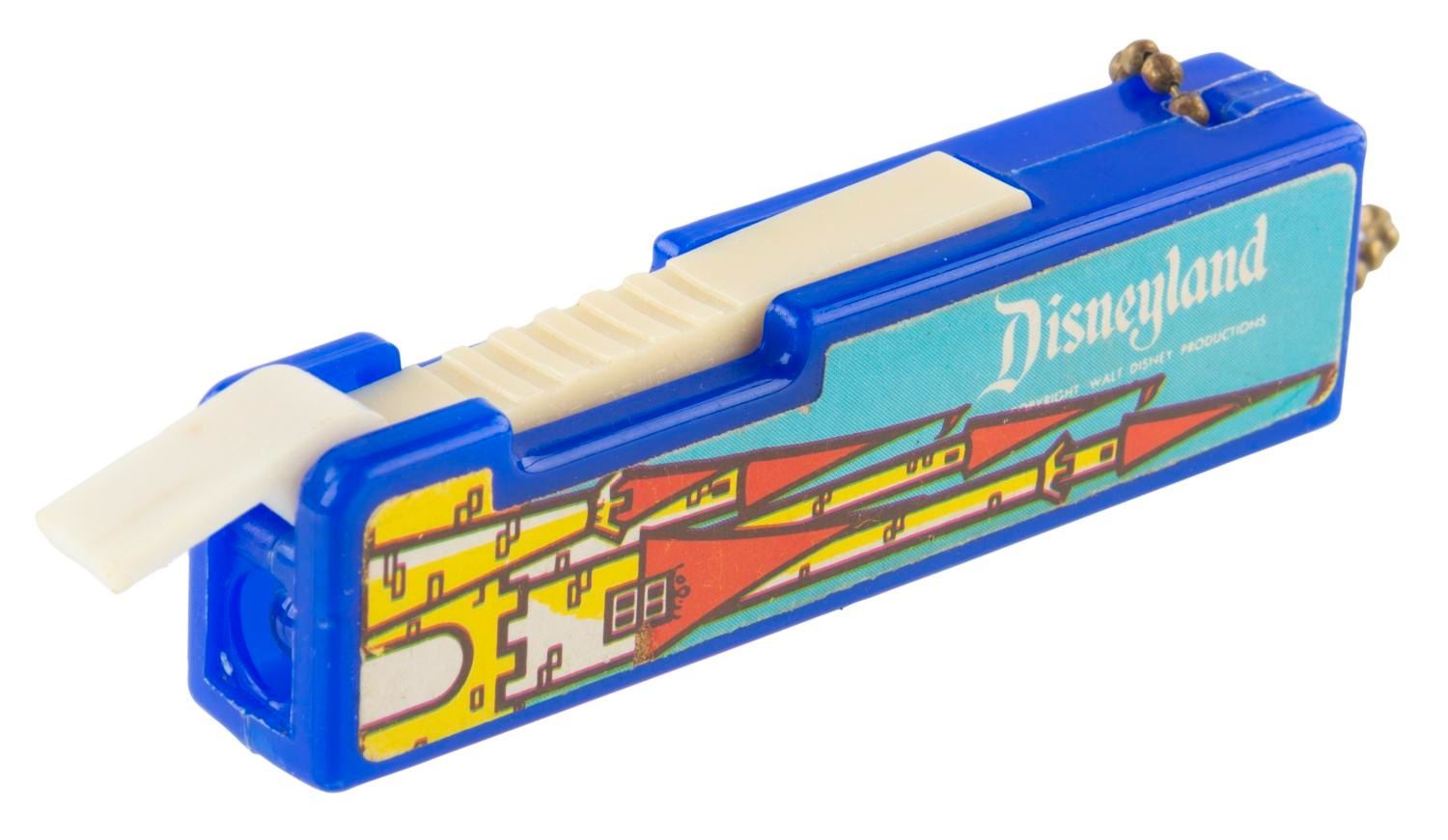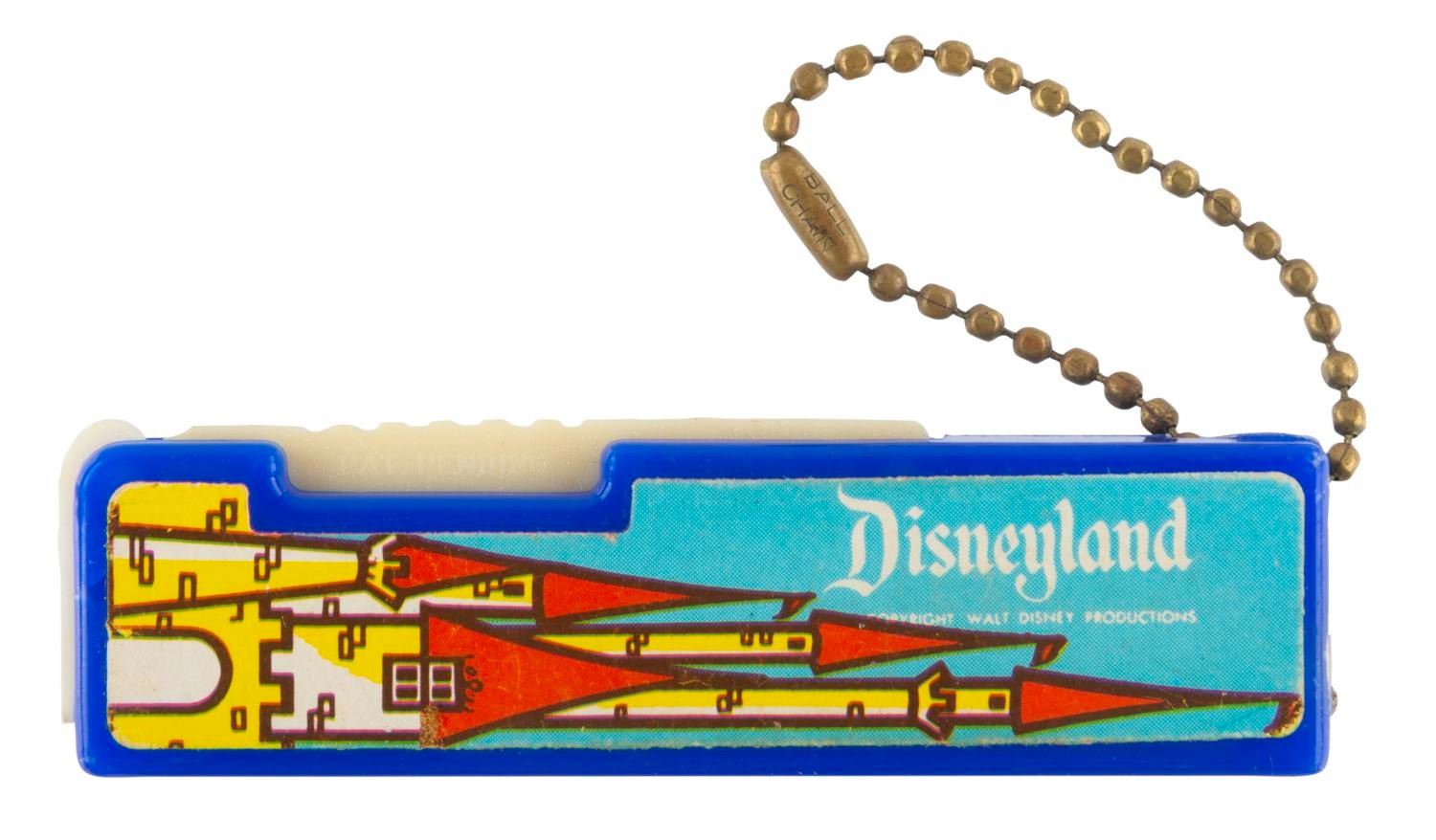 (Disneyland, 1950s-60s) A souvenir of Disneyland keychain flashlight. When tested, the flashlight did not work, needing a new battery or service to function. Measuring 3” x 0.5” x 0.5”, the flashlight is in very good condition with light wear.
