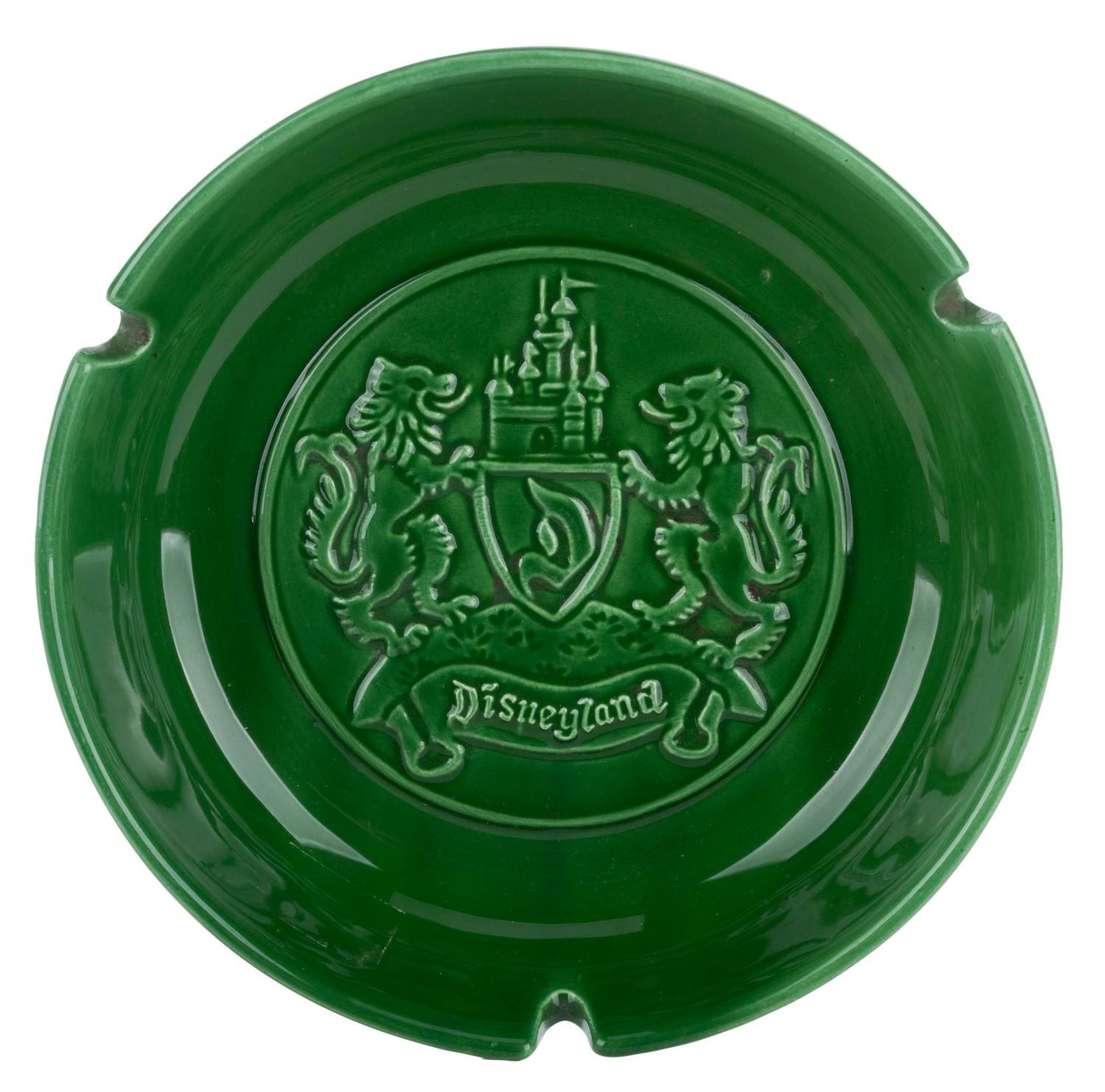 (Disneyland, 1950s) An early souvenir ashtray of Disneyland with the original box. The ceramic ashtray features the official crest of the Park in relief at its center and retains a Disneyland Walt Disney Productions stamp on the reverse. Measuring 6.5" in diameter and 1.5” tall, the ashtray is in fine condition.