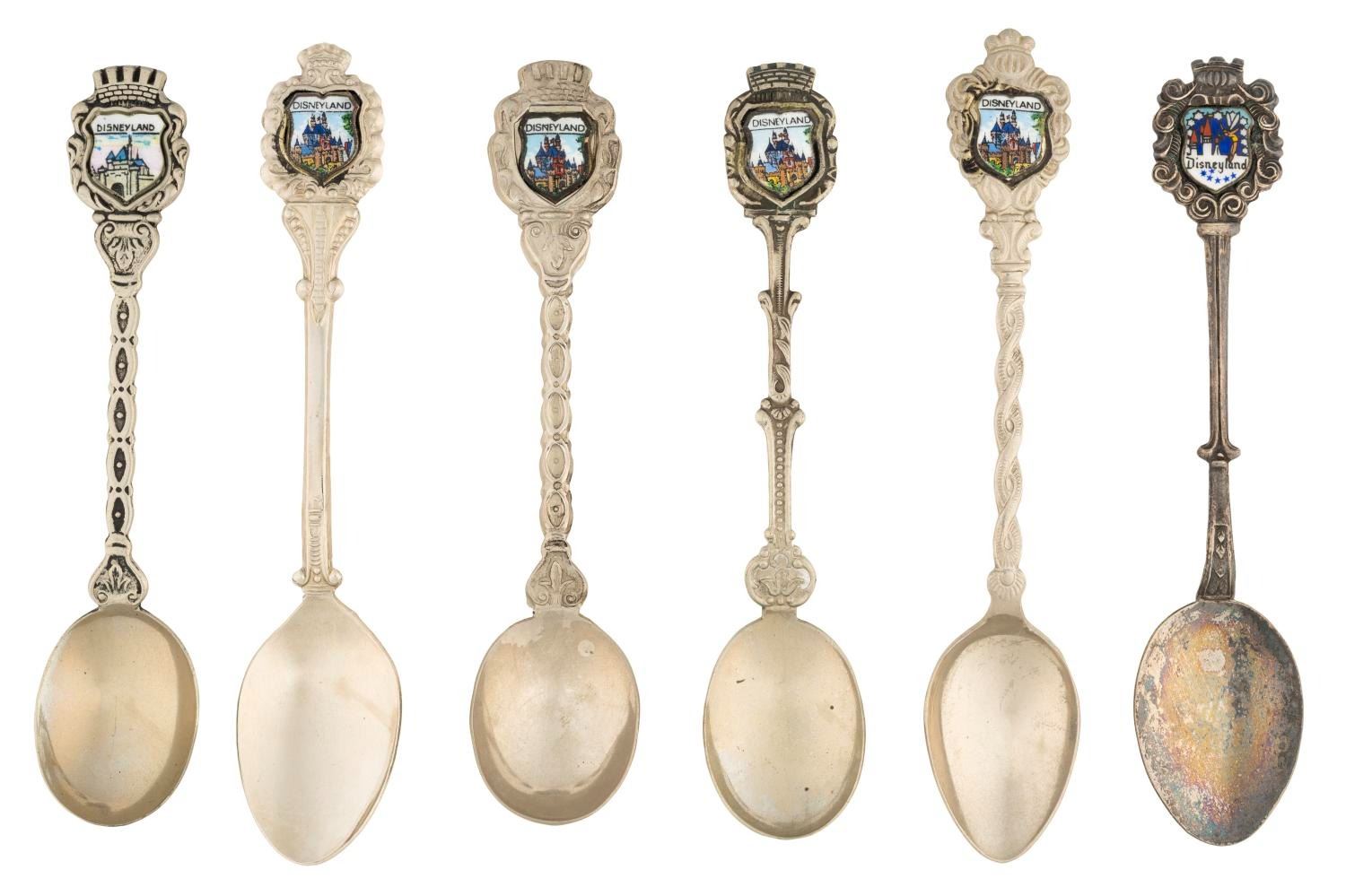 (Disneyland, 1950s-60s) A collection of six classically designed spoons including two teaspoons and four Demi-Tasse spoons, each tooled with bass relief and picturesque cloisonne settings of Disneyland and Sleeping Beauty Castle. These were manufactured both in Germany and by Klepa Arts of Holland. Measuring 4.75" long and shorter, each metal alloy and silver-plated spoon is in very good-to-good condition with minor wear, discoloration, and tarnish.