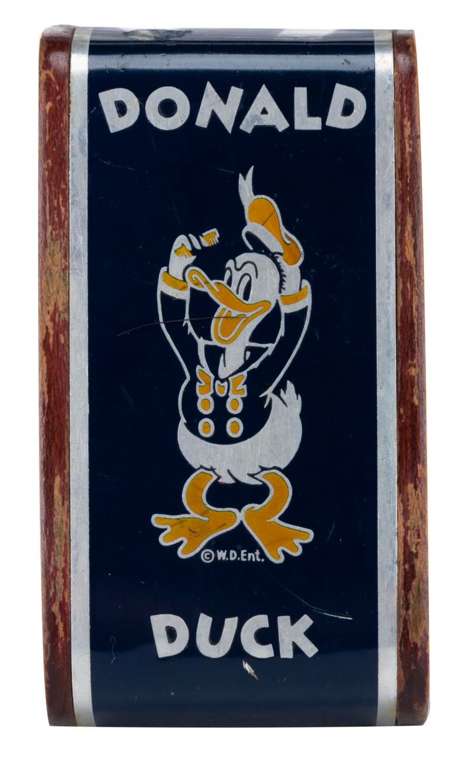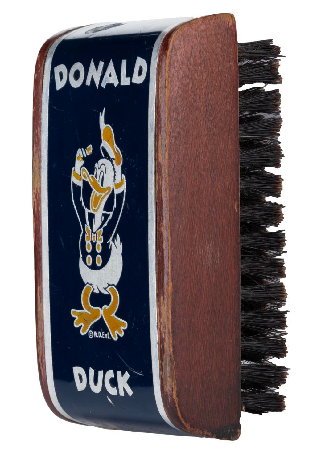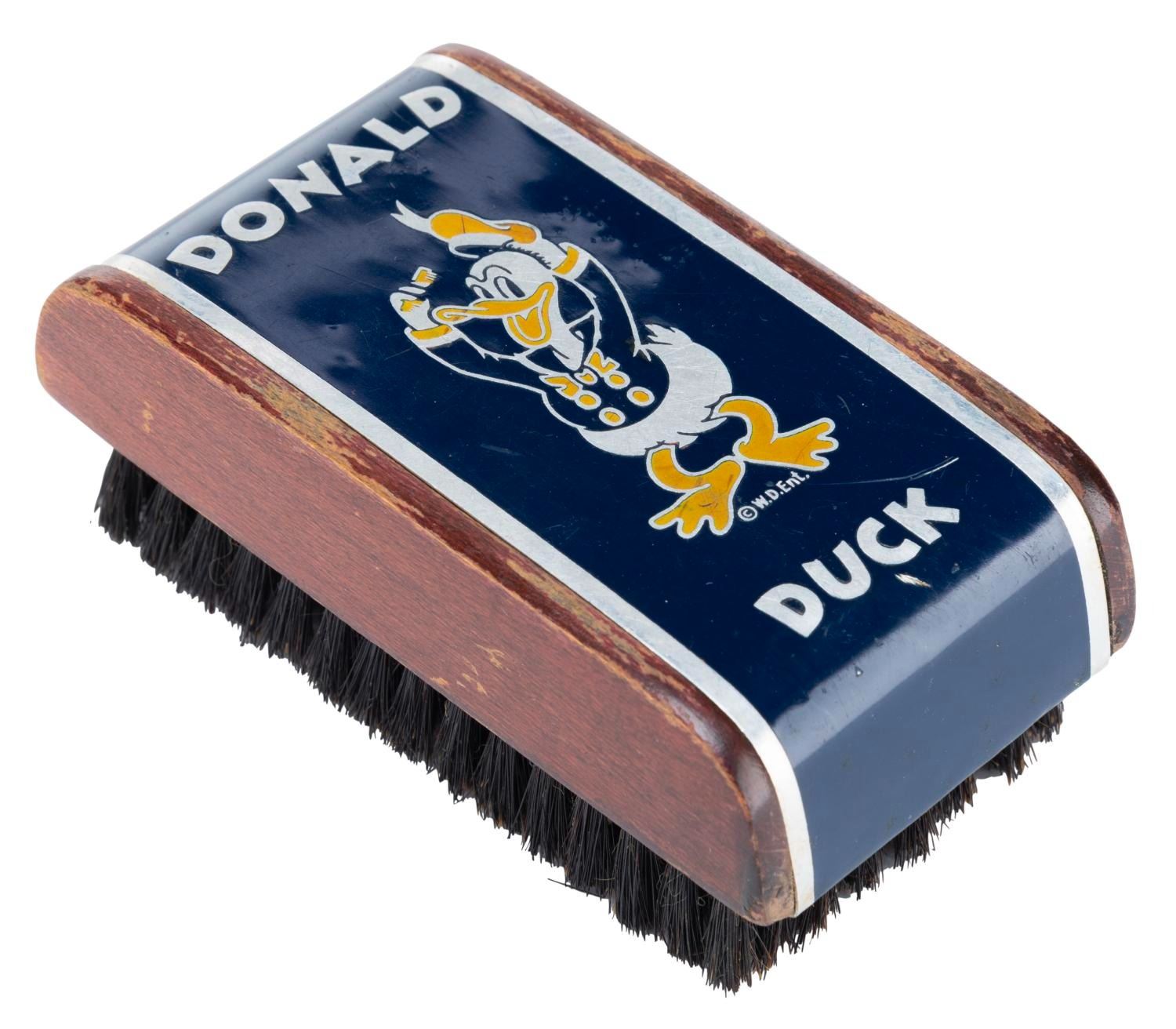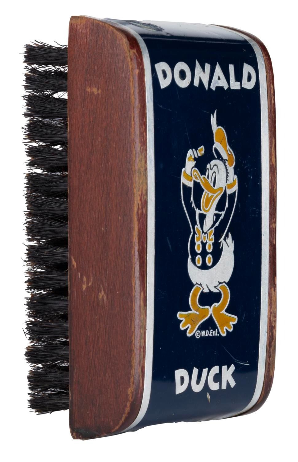 (Disney, 1930s) An early wooden and metal brush featuring Donald Duck. Measuring 1.75" x 3.5" x 1.5", the brush is in very good condition with light wear from use.