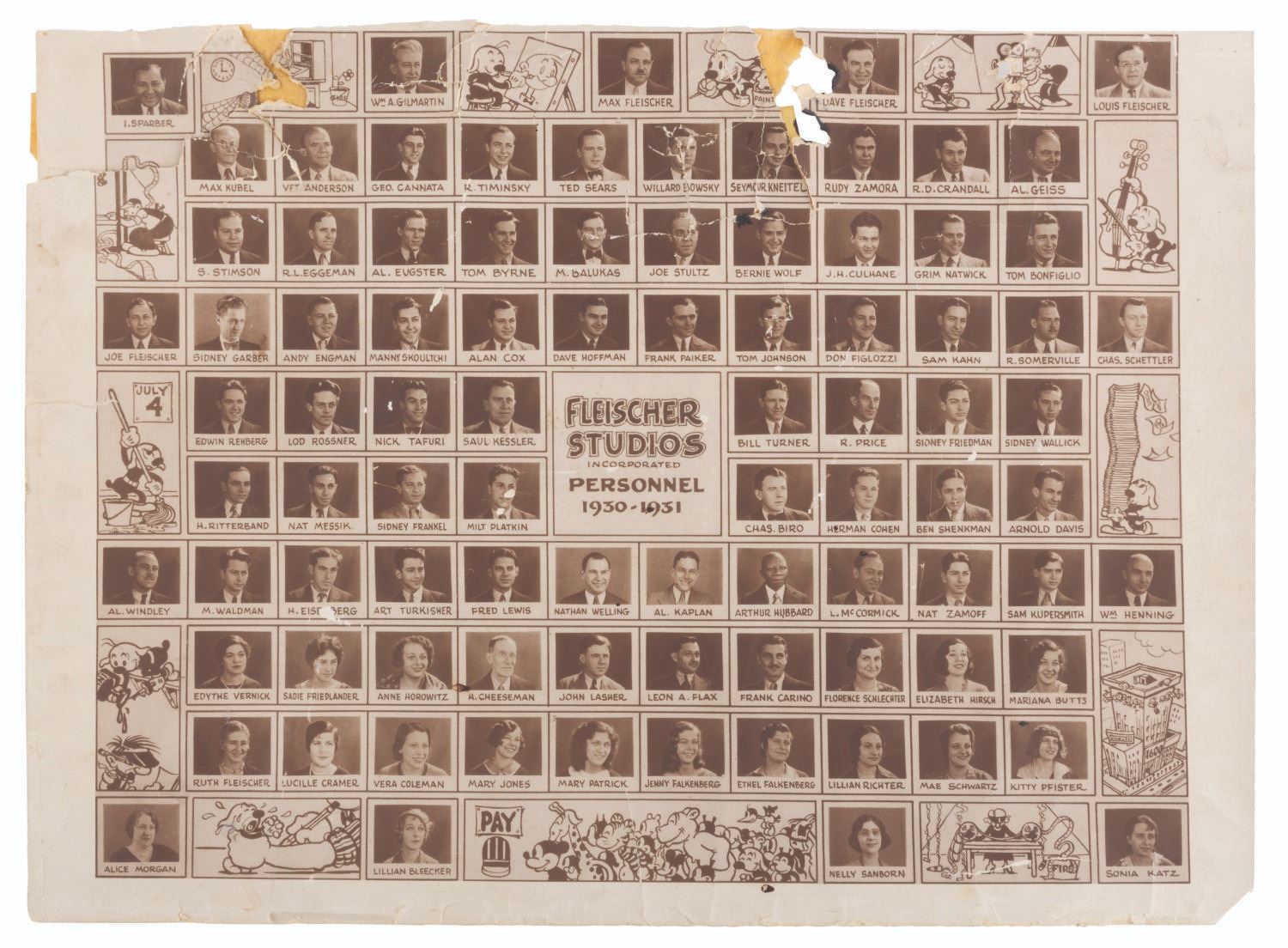 (Fleischer, 1930-31) A Fleischer Studios Incorporated personnel list from 1930-31 featuring the names and photos of 93 staff members. Included are acclaimed animators Ted Sears, Seymour Kneitel, and Grim Natwick. Measuring 12.25" x 17", the list is in fair condition, mounted to different sheets of paper, with heavy creasing, cracking, paper loss, holes, discoloration, and soiling.