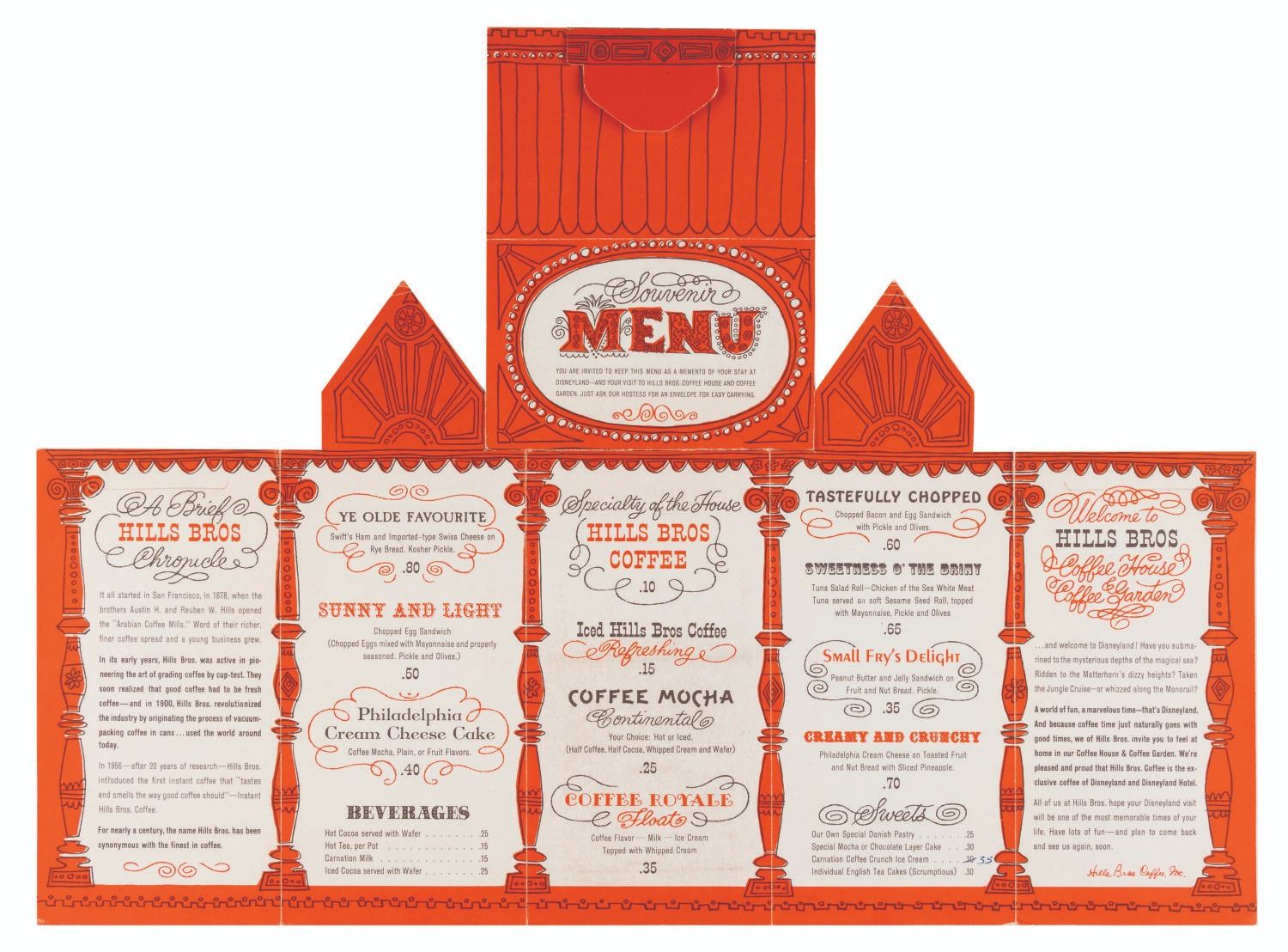 (Disneyland, 1950s-1960s) A souvenir menu from Hills. Bros. Coffee House and Coffee Garden, which was located on Main Street, U.S.A. beginning in 1958. The beautifully illustrated foldable menu can be turned into a paper model of the restaurant. Measuring 13” x 15.75”, the menu is in good condition with wear along the intended folds, creases on the spires, a price adjustment written in pen, and ink smudges.