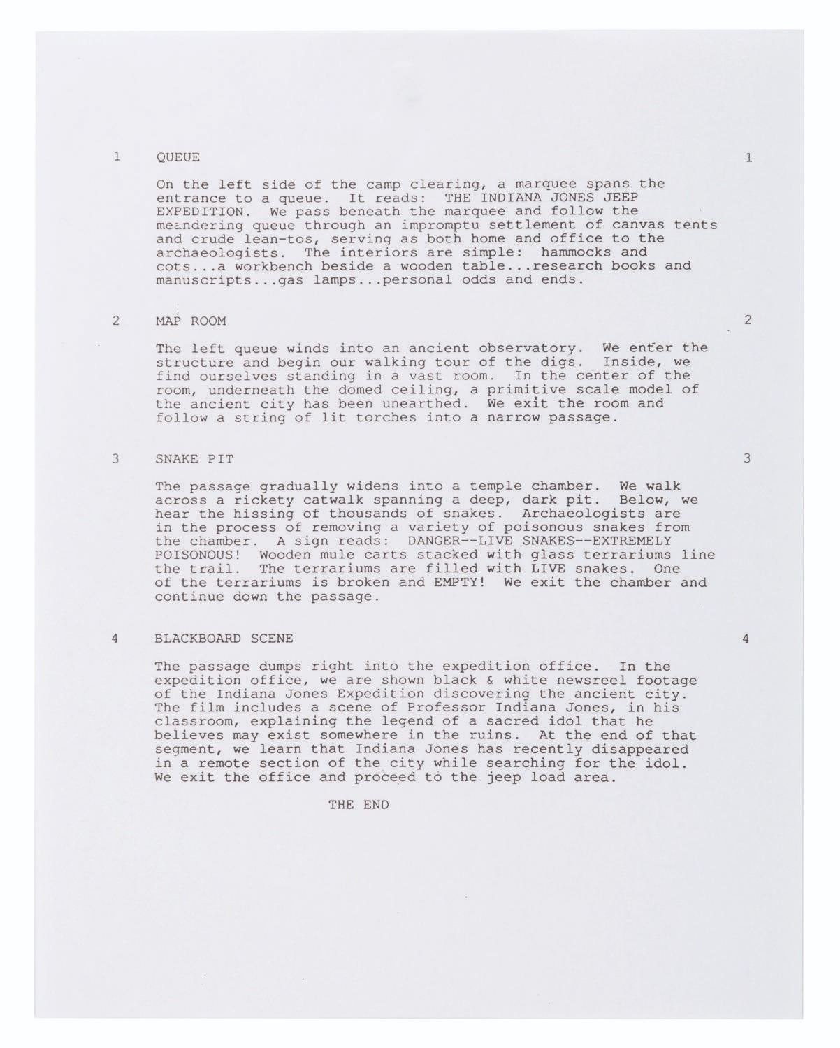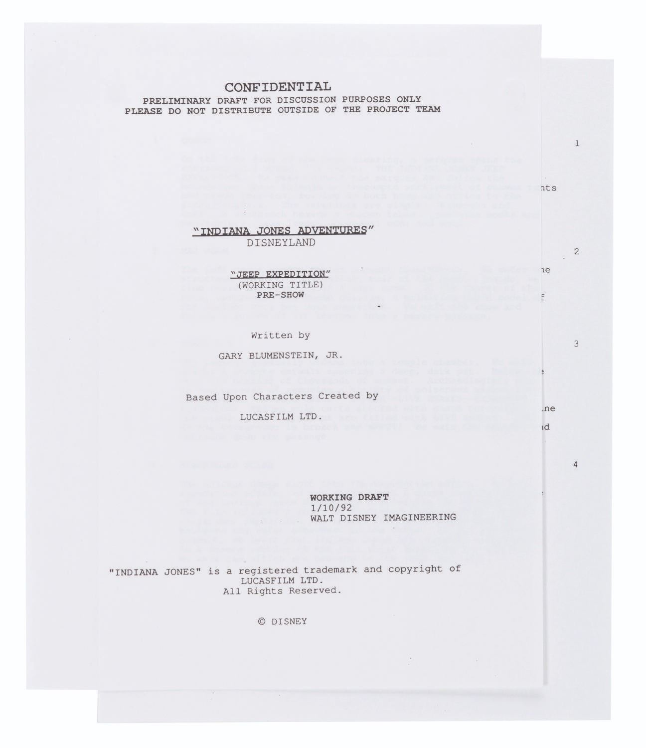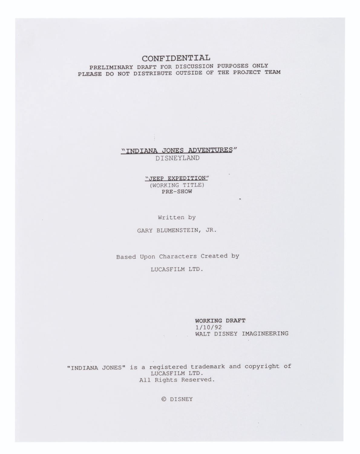 (Disneyland, 1992) A confidential working draft script for the "Indiana Jones Adventures " pre-show. Consisting of a title page and one-page story outline, the script details four scenes: the queue, map room, snake pit, and blackboard scene, the last of which would feature a newsreel starring Indy himself. Several elements from this script, with the working title "Jeep Expedition, " would be incorporated into the final attraction, eventually titled Indiana Jones Adventure: Temple of the Forbidden Eye. Measuring 8.5 " x 11 ", the script is in very good condition with light handling wear, printer ink spots, and staple holes at the top left corner.