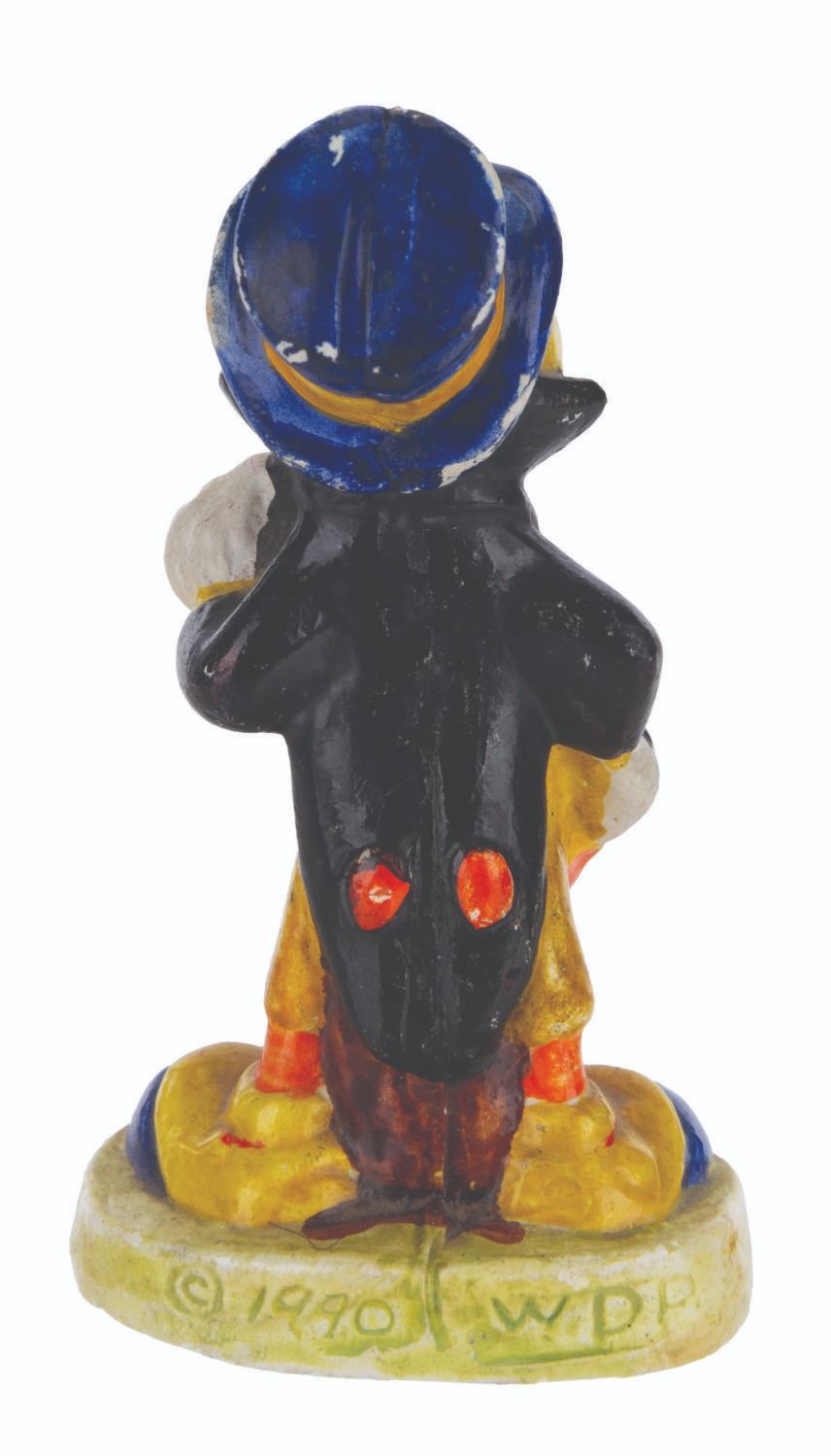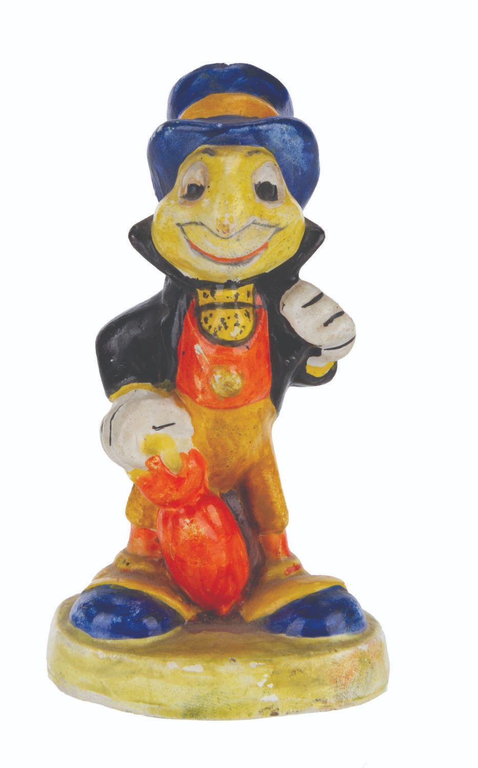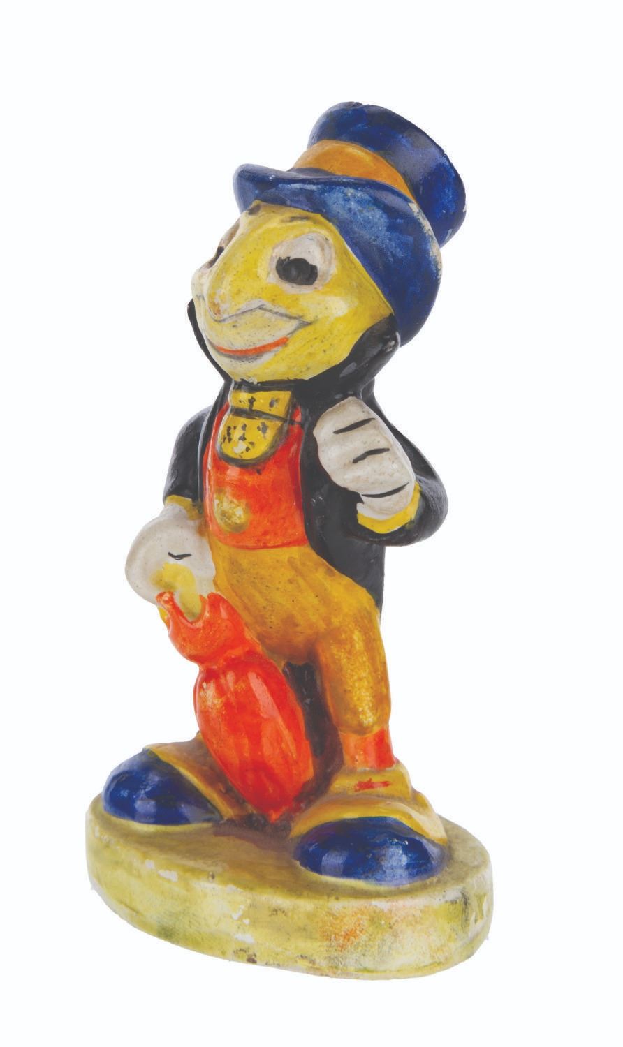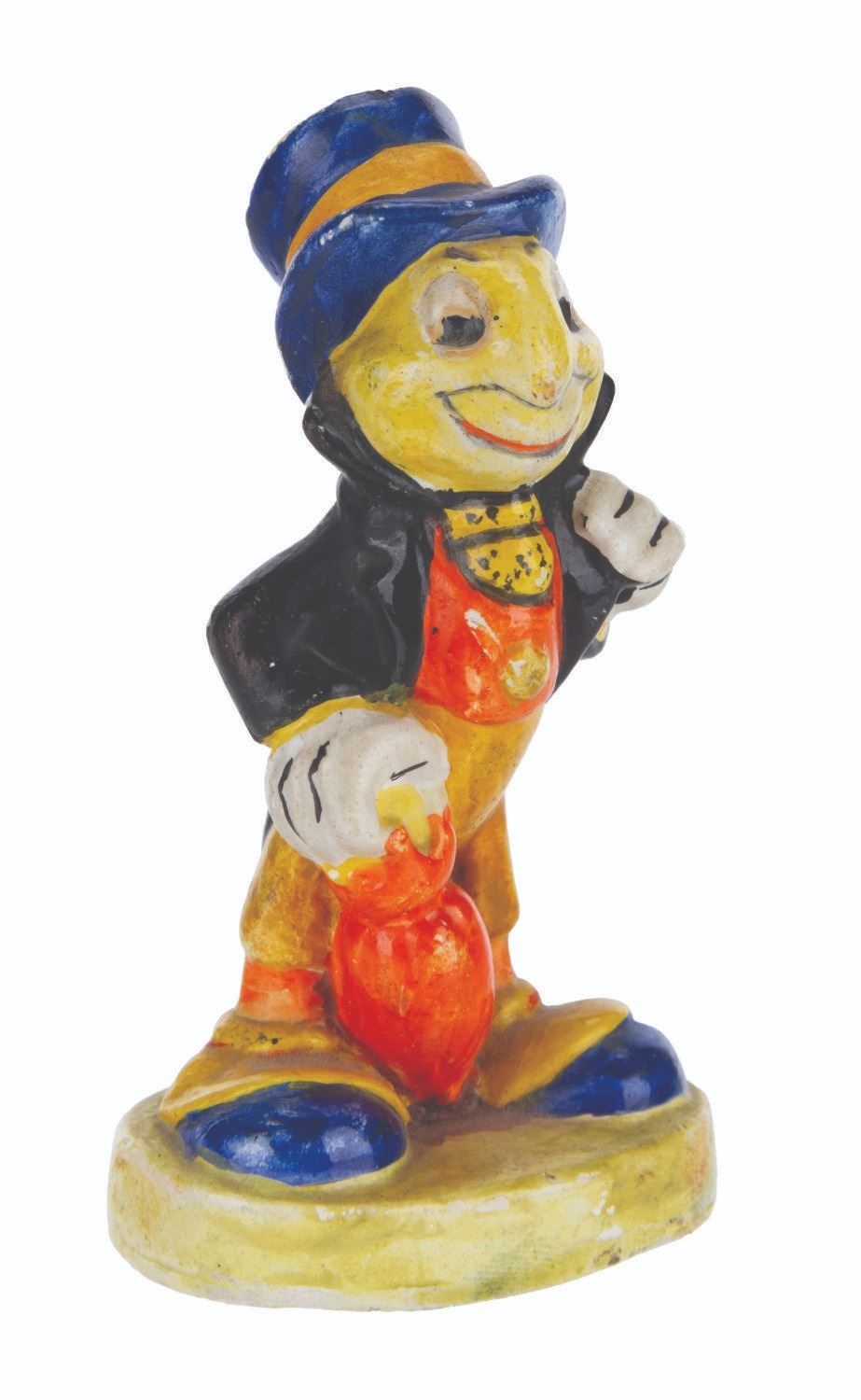 (Disney, 1940) A plaster Jiminy Cricket from “Pinocchio” figure dating to the film’s original release. Standing 3.25” tall, the figurine is in good condition, with small scuffs to the paint throughout.