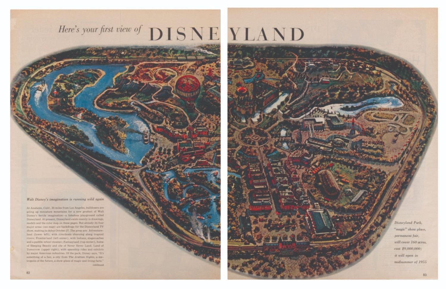 (LOOK, 1950s) A rare and early LOOK Magazine article entitled "Here's Your First View of Disneyland," published on November 2, 1954. This example of an early press release about Disneyland features a colorful two-page spread of Peter Ellenshaw's aerial overview of Disneyland. Measuring 8.5" x 11", the pages have been removed from the original magazine and displays in good condition with light creases, tears, color fading, and wear from age.