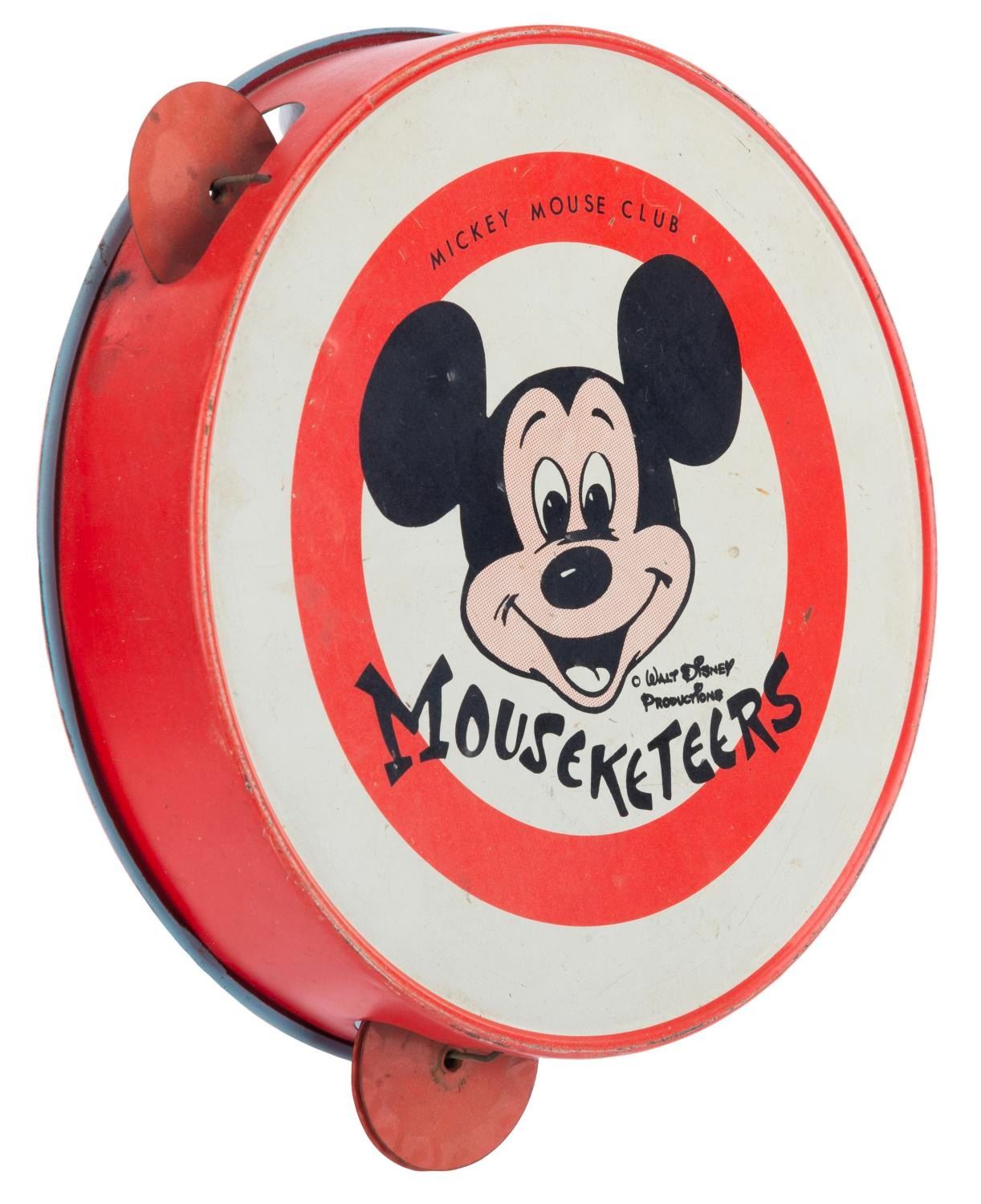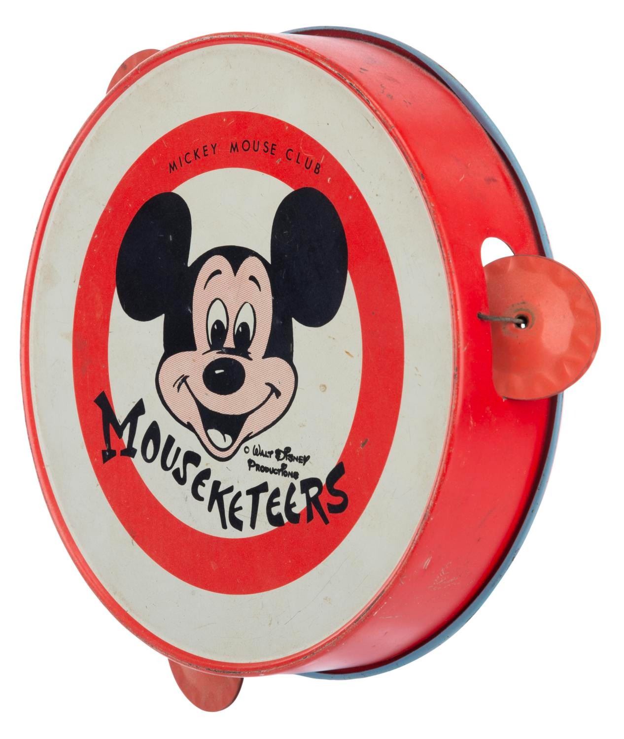 (Disney, 1950s-60s) An early Mickey Mouse Club toy tambourine. Measuring 6.5" in diameter, the metal tambourine is in good working condition with scuffs, smudges, scratches, oxidation, discoloration throughout, and small dents on the front.