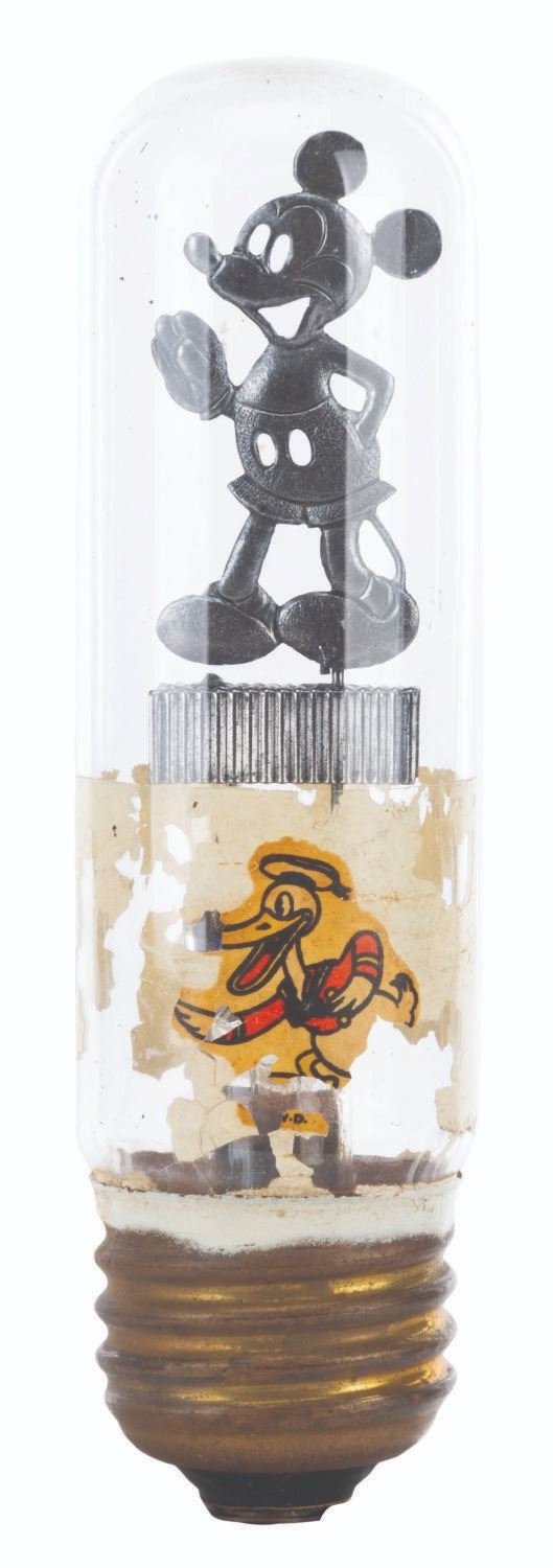 (Aerolux, 1930s) An Aerolux filament light bulb featuring a die-cut Mickey Mouse inside and remnants of its original Donald Duck adhesive on the exterior. Measuring 4" tall and 1" in diameter, the light bulb is in good condition with heavy sticker loss, adhesive residue, light wear, and oxidation from age.