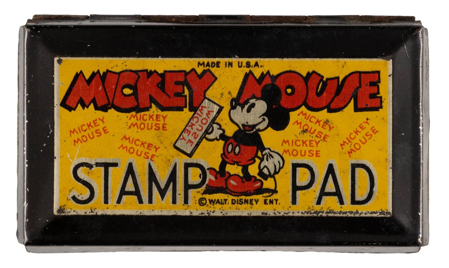 (Disney, 1930s) A Mickey Mouse Stamp Pad. Measuring 3" x 1.75" x .50", the tin-lithographic stamp pad box displays in good condition, exhibiting scuffs and wear to the outside, oxidation on the inside, and a dried pad from age.