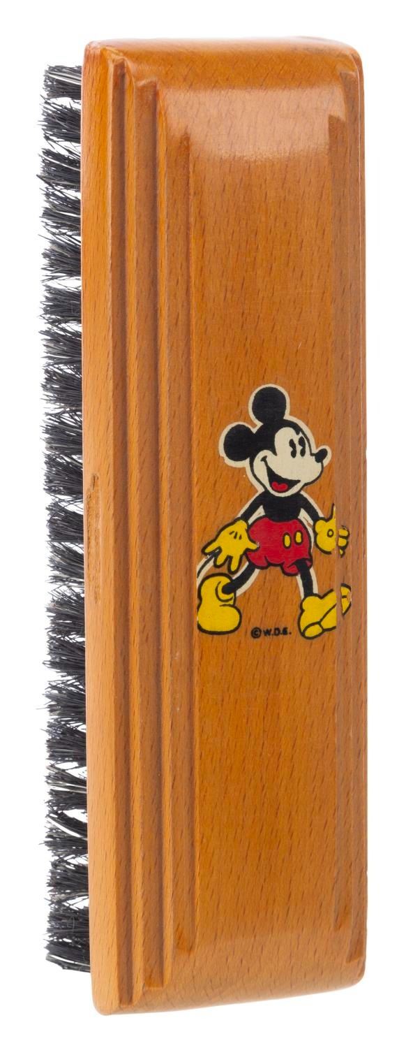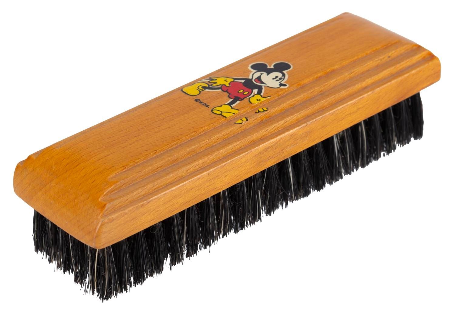 (Henry L. Hughes Co., 1930s) A wooden shoe brush with a decal of Mickey Mouse. Measuring 5” x 1.5” x 1.25”, the brush is in very good to fine condition with very light wear, and a small strip of the Mickey decal missing from his foot and hand.