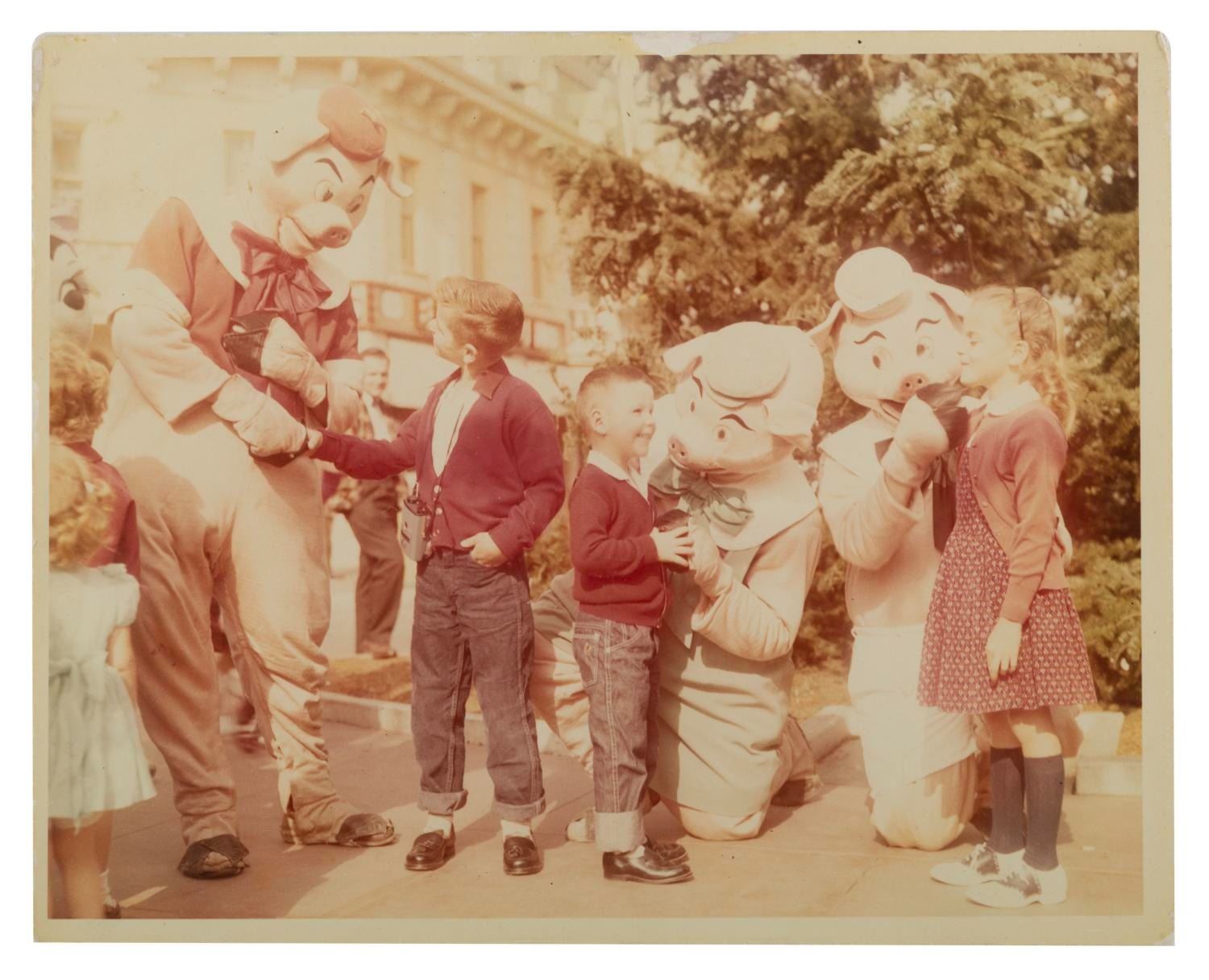 (Disneyland, 1955-59) An early photograph taken at Disneyland of children with the Three Little Pigs walk-around characters. Measuring 8” x 10” the photograph is in good condition with a 0.5” area of paper loss at the top, edge wear, dulled corners, and discoloration from age.