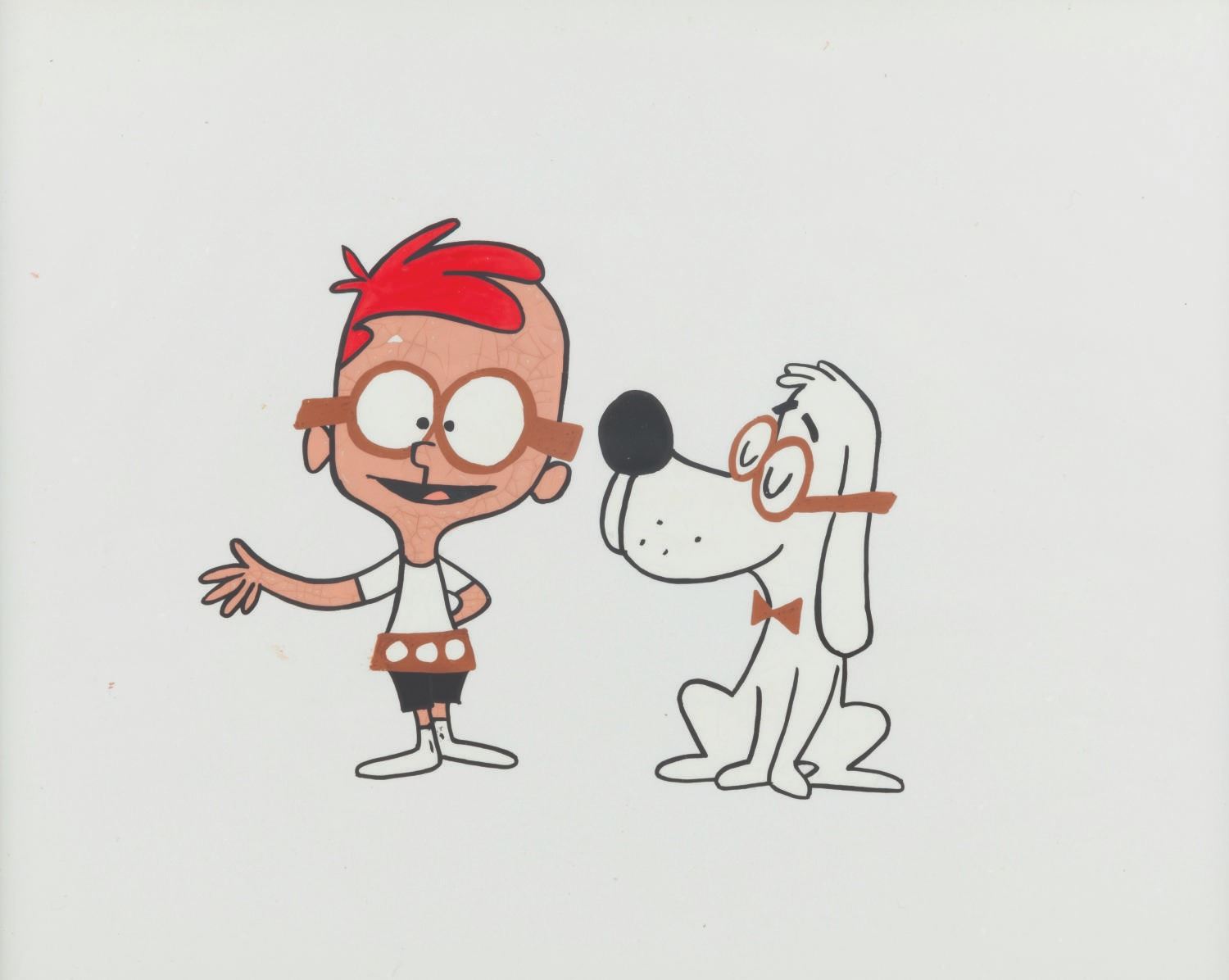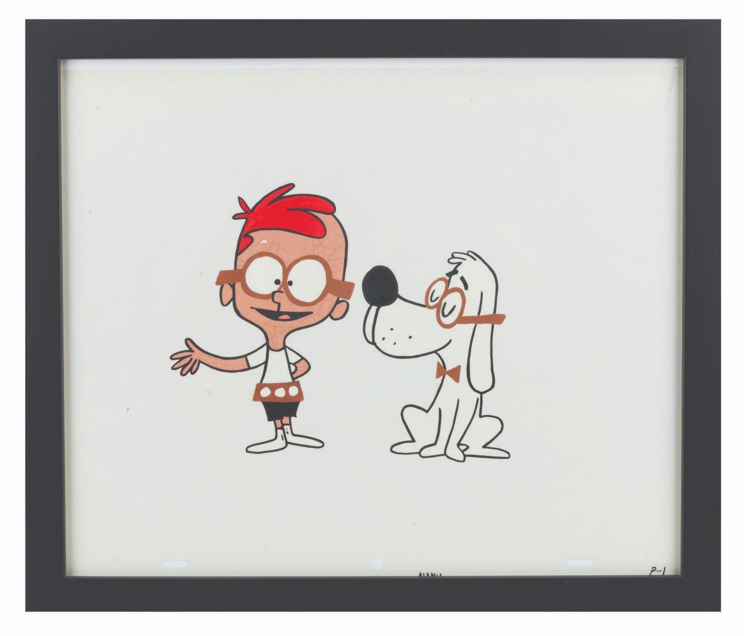(Ward, 1959) An original production cel of Mr. Peabody and Sherman from the first episode of the “Peabody’s Improbable History” segment from “Rocky and His Friends.” In this early cel, Sherman wears a time-travel belt instead of using the Wayback Machine, and both he and Mr. Peabody wear brown eyeglasses instead of the black glasses seen in later episodes. With an image size of 5.25” x 7” on a 10.5” x 12.5” cel in an 11.75” x 13.75” frame, the cel displays in good condition with a 0.25” area of paint loss above Sherman’s right eye, and both of his shoes and paint cracking throughout due to the production’s use of acrylic paint rather than cel vinyl paint.