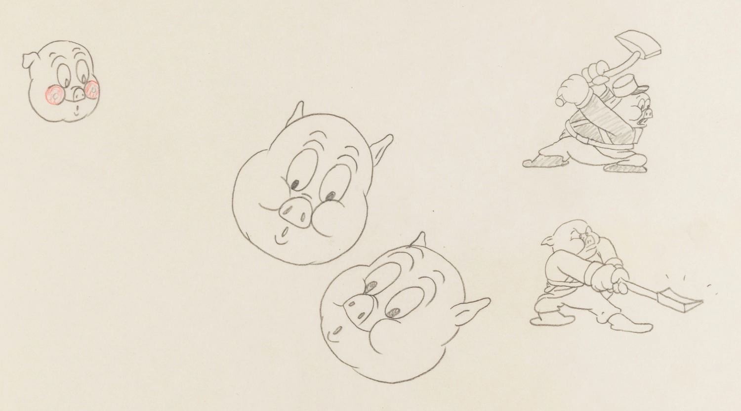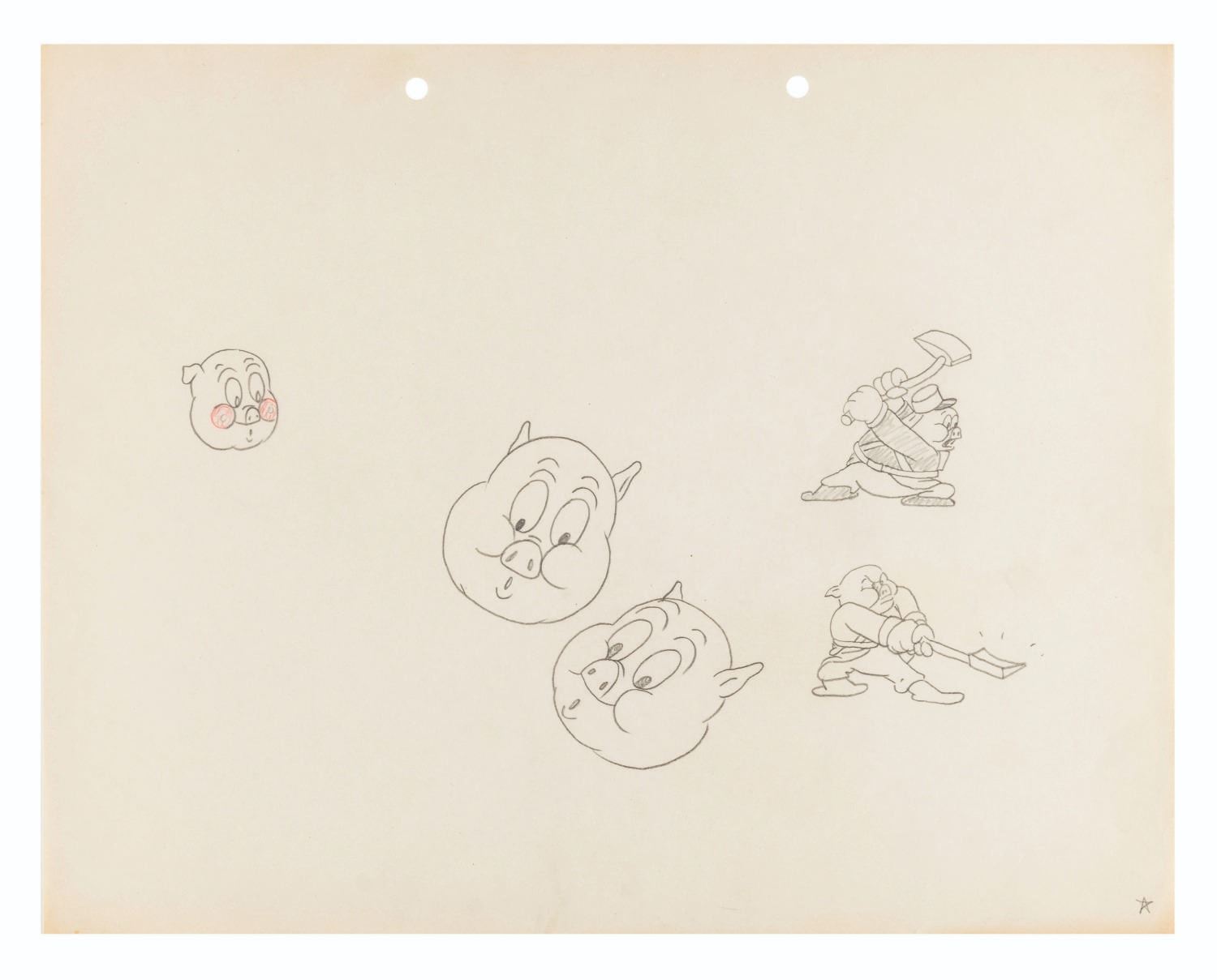 (Warner Bros. 1936) A page of Porky Pig character sketches from the production of "Little Beau Porky." The sheet includes two images of Porky in his outfit from that film, and three expression studies. Accomplished in graphite and colored pencil with image sizes measuring from 1" x 1" to 2" x 2.25" on 9.5" x 12" animation paper, this piece is in very good condition with soft creases, discoloration and edge wear, and very light spotting along the bottom edge.