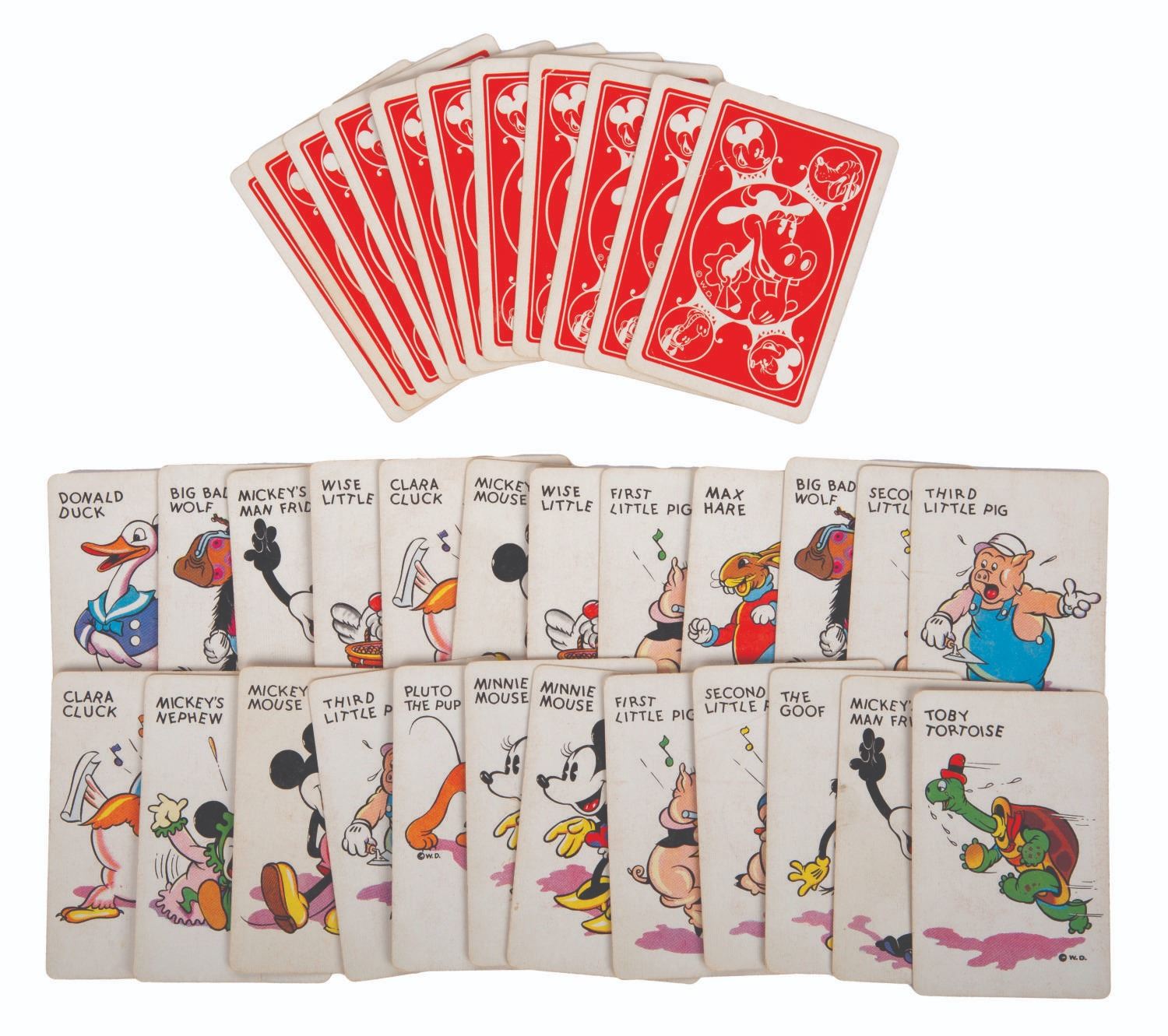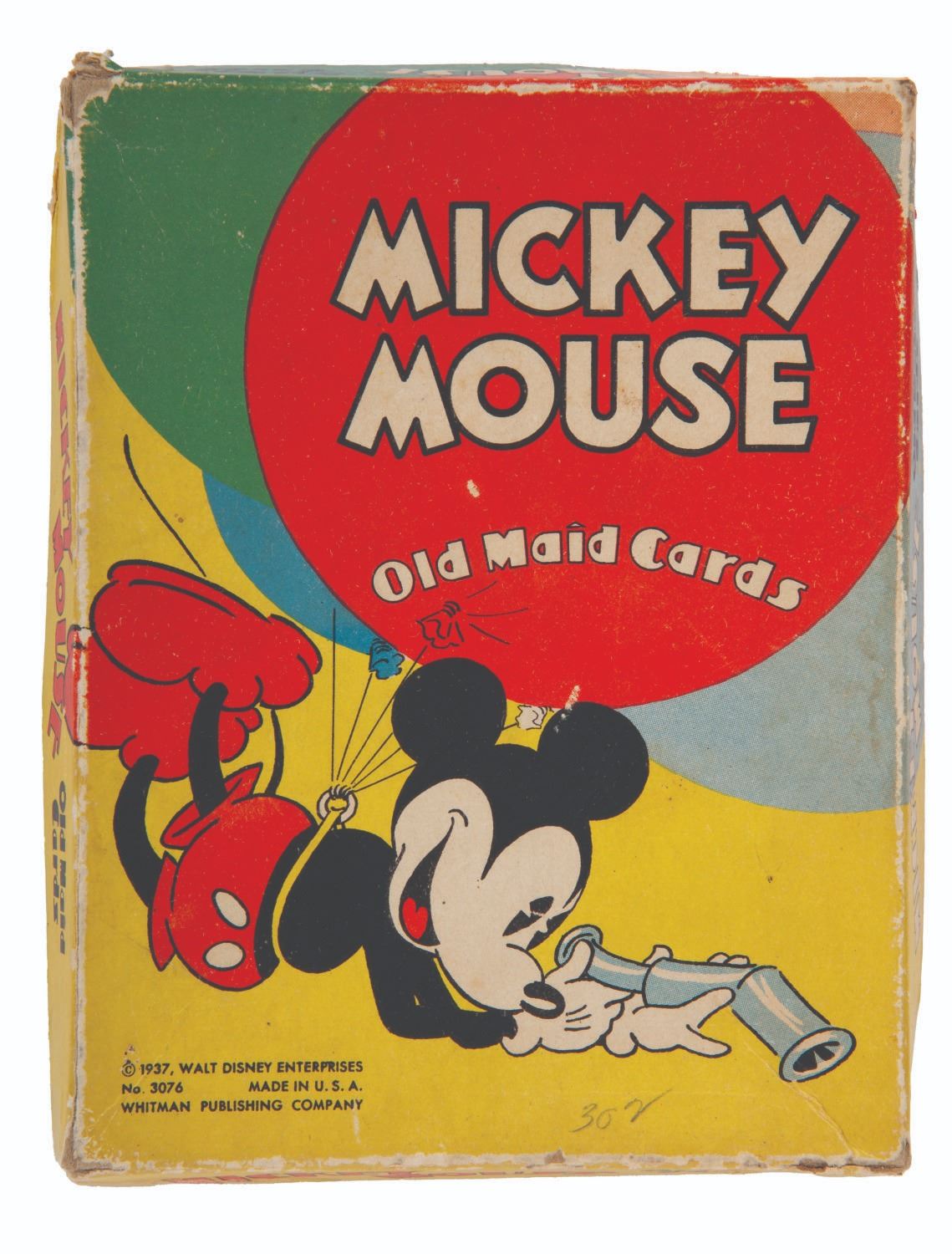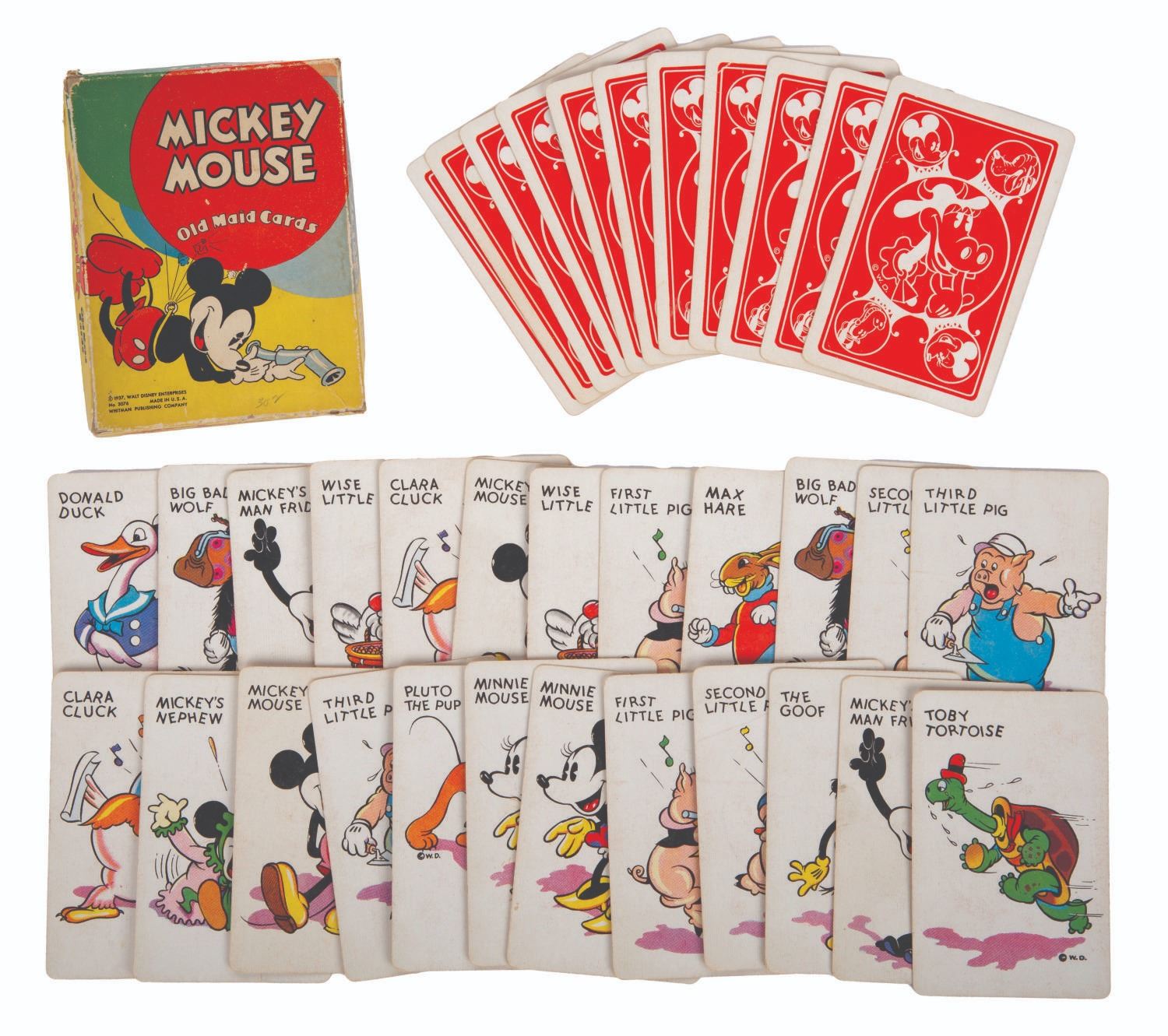 (Whitman Publishing Co., 1935) A boxed set of Mickey Mouse Old Maid Cards featuring early iterations of Donald Duck and other characters. The set contains 35 cards plus the Instructions card. Measuring 6.5" x 5" and 1" deep, the box and contents are in good overall condition, with creases and wear to the edges and corners of the box.