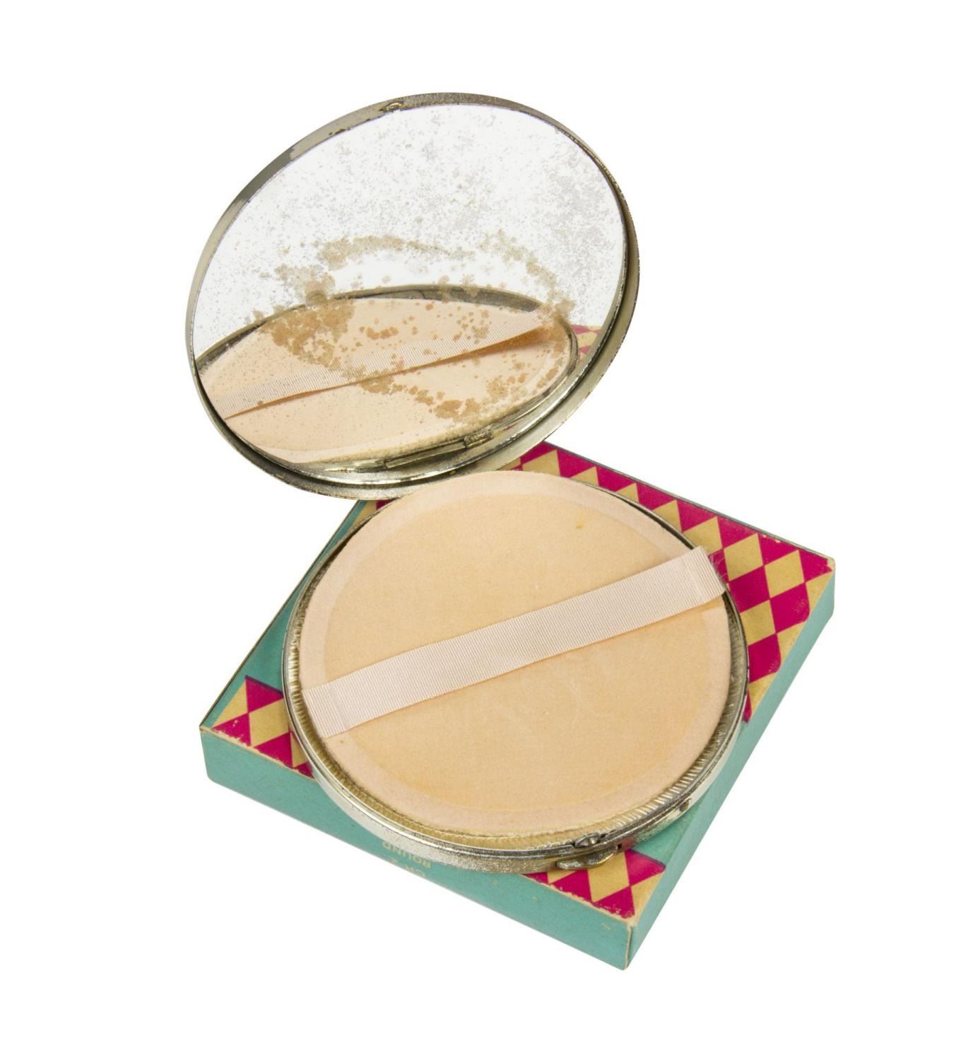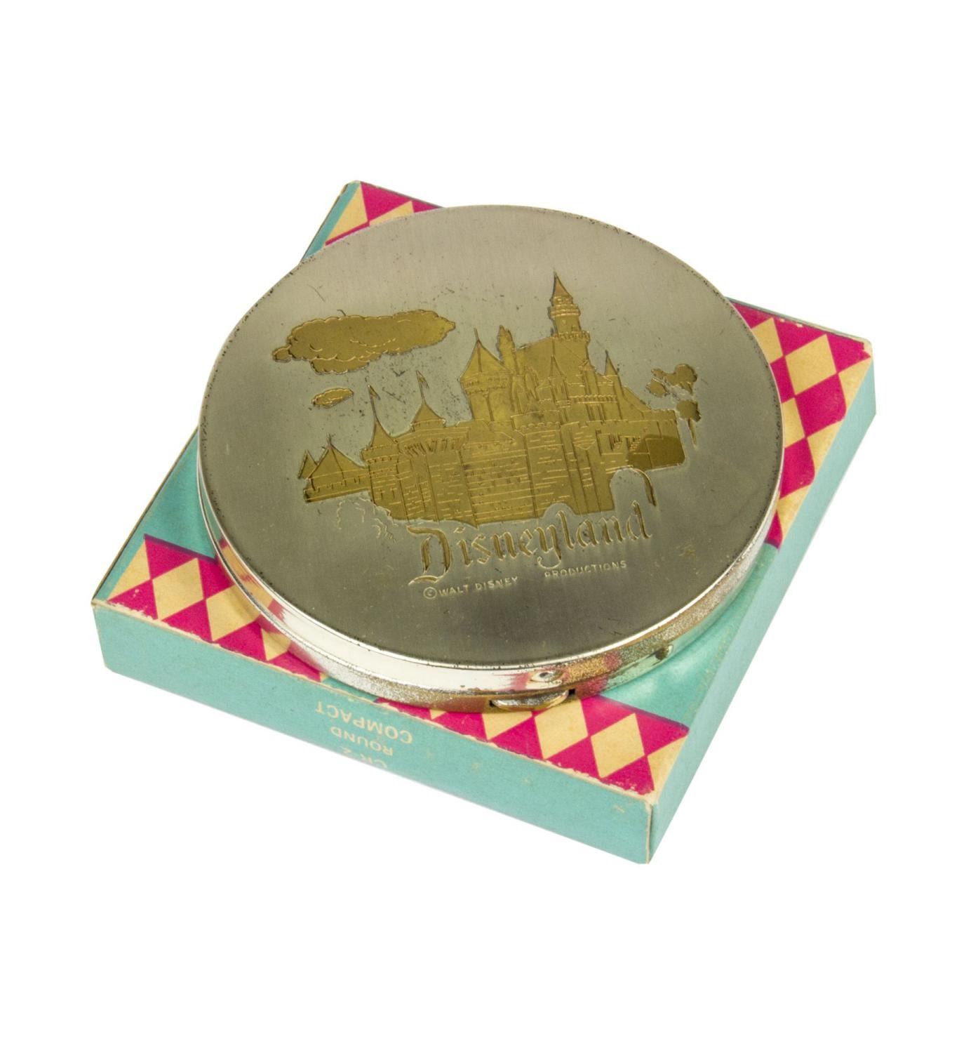 (Disneyland, 1955) A circular Disneyland souvenir compact featuring a gold relief of Sleeping Beauty Castle, with the original box. The compact is complete with the inner mirror, gauze-sifter, and powder puff. Measuring 3.5” in diameter and 0.5” thick, the compact is in very good condition with minor surface wear and spots of tarnishing to the mirror.