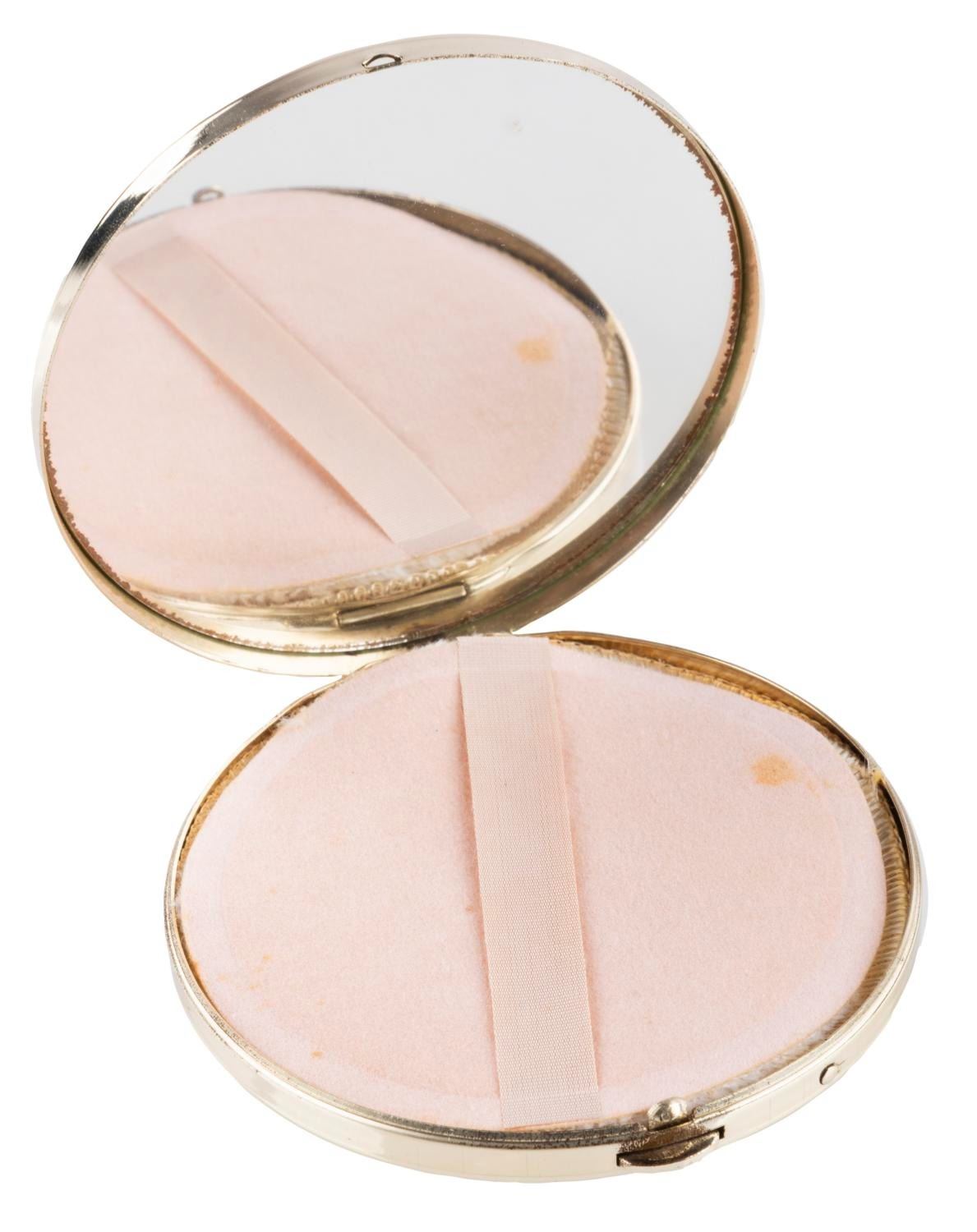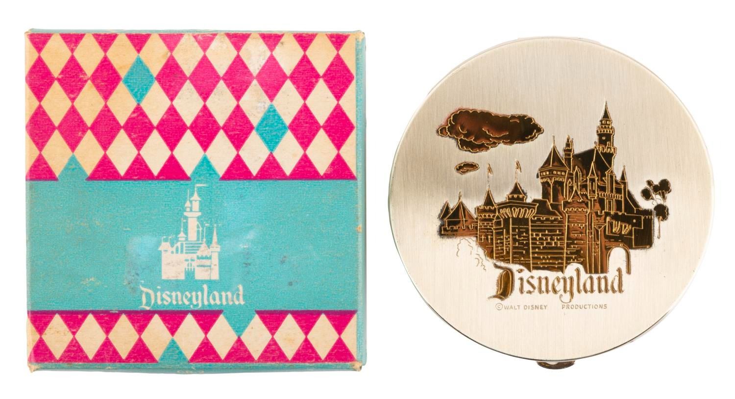 (Disneyland, 1955) A circular Disneyland souvenir compact featuring a gold relief of Sleeping Beauty Castle, with the original box. The compact is complete with the inner mirror, gauze-sifter, and powder puff. Measuring 3.5" in diameter, the compact is in very good condition with spotting to the gauze sifter from age. The box is in good condition with typical wear from handling and age.
