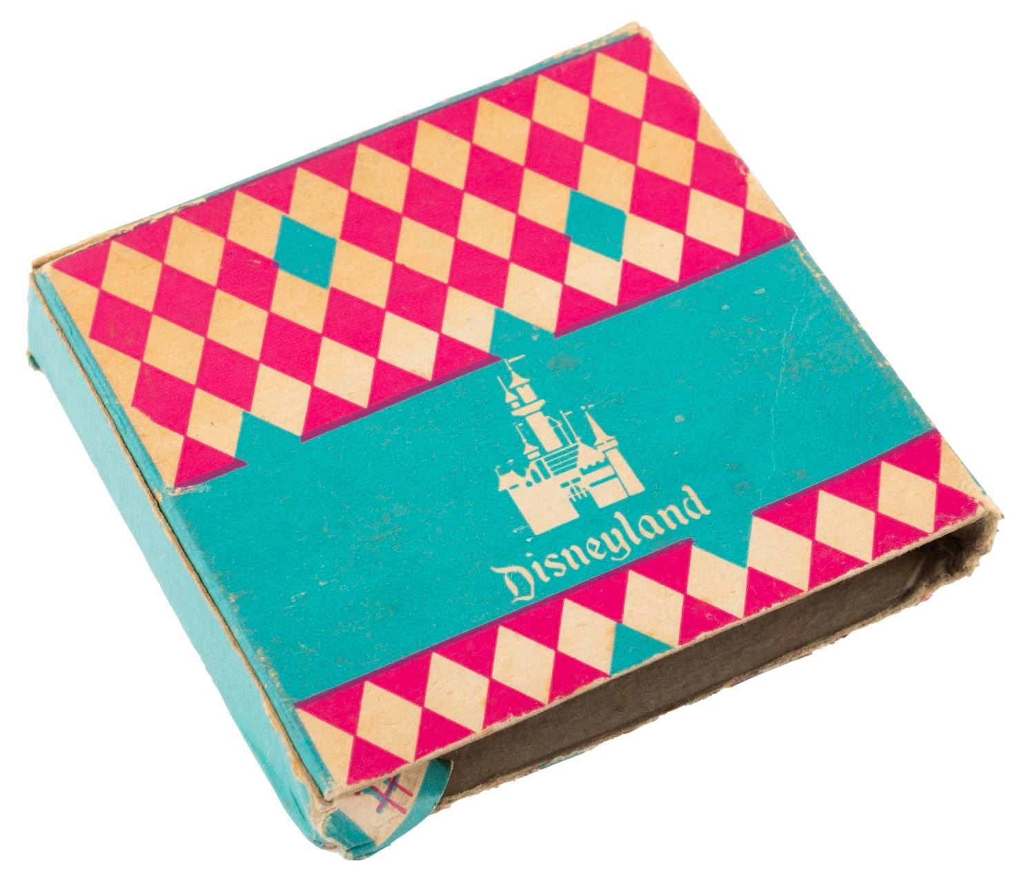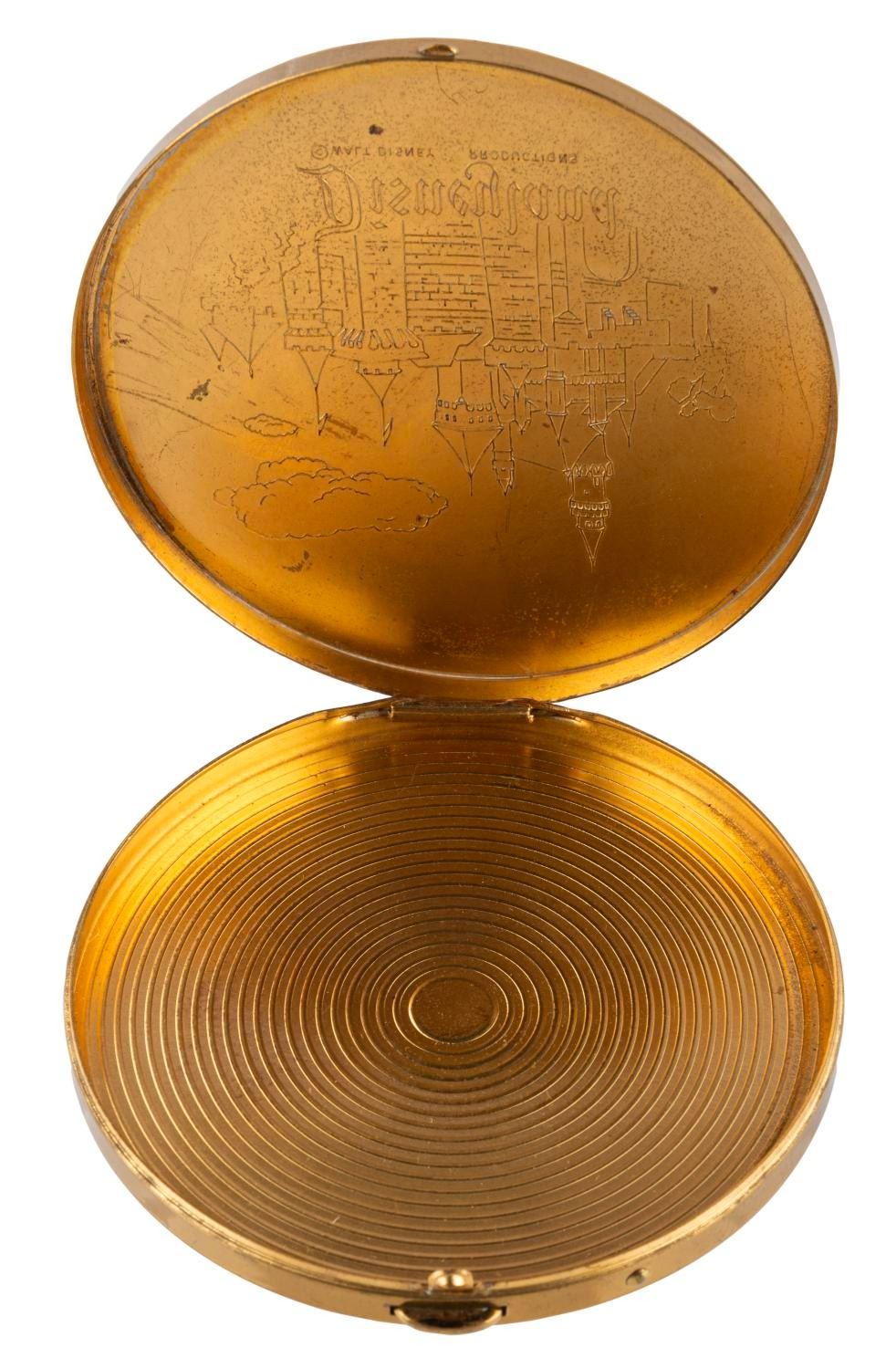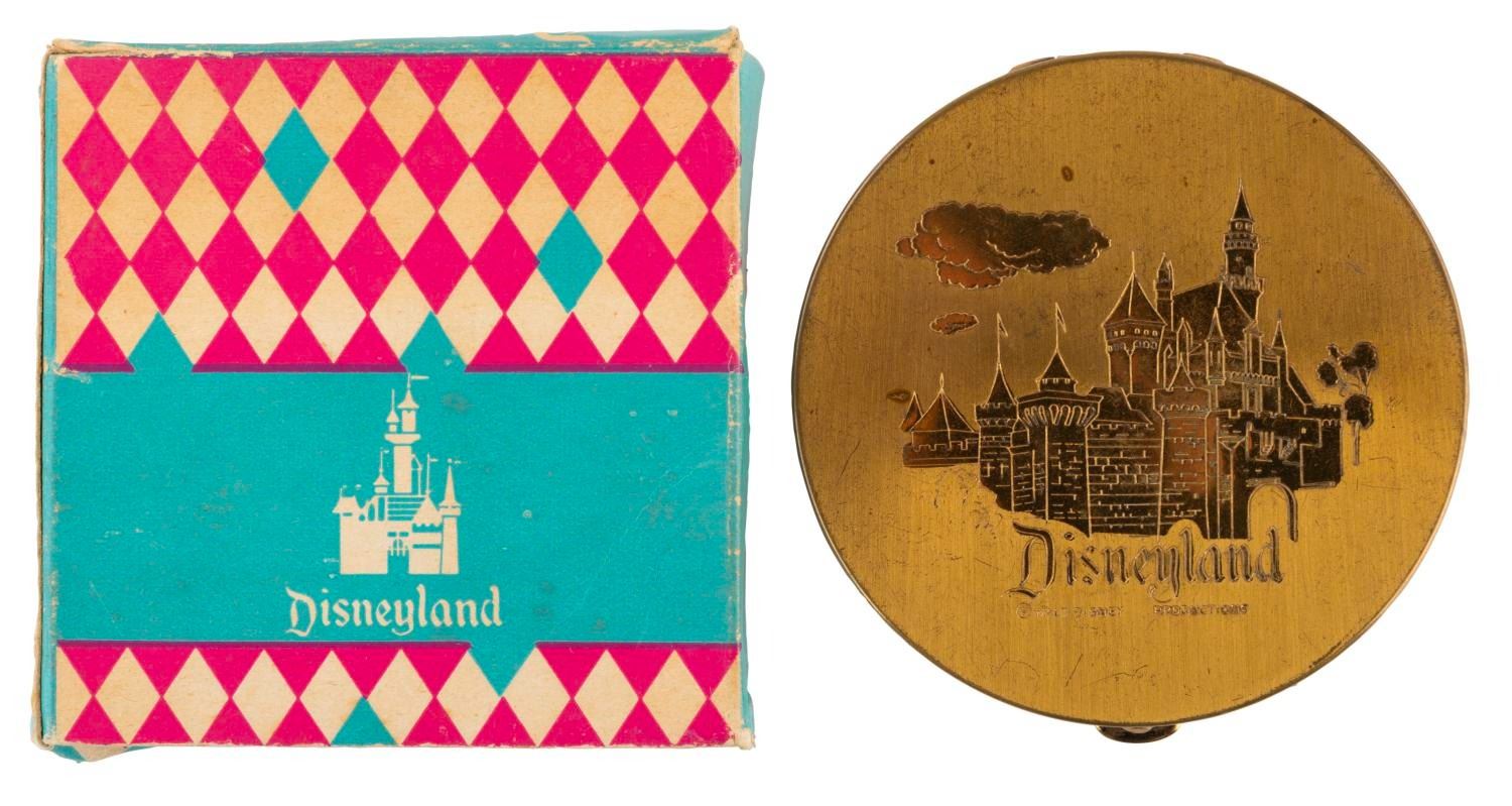 (Disneyland, 1955) A circular Disneyland souvenir compact featuring a gold relief of Sleeping Beauty Castle, with the original box. Measuring 3.5" in diameter, the compact is in fair condition with scratches, scuffs, oxidation, and wear, with its mirror missing and lid detached.
