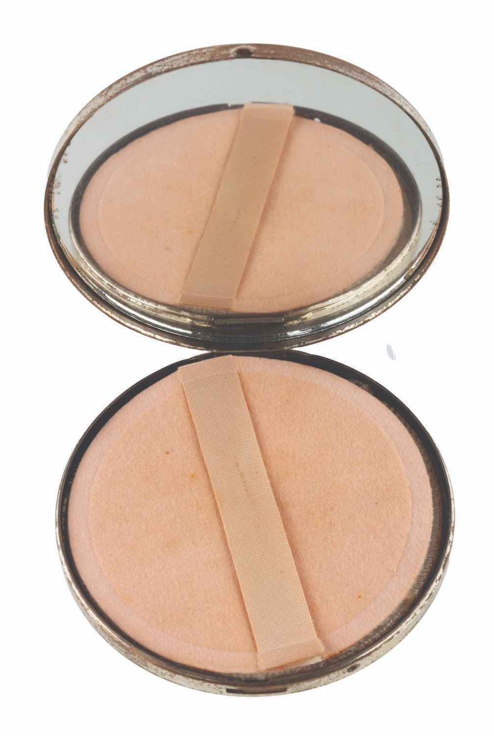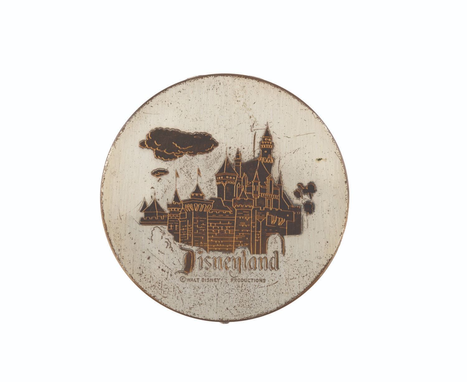 (Disneyland, 1955) A circular Disneyland souvenir compact featuring a gold relief of Sleeping Beauty Castle that includes the original powder puff and powder screen. Measuring 3.5" in diameter, the compact is in fair condition with heavy scratches, scuffs, dents, oxidation, edge wear and the locking release spring and button are missing.