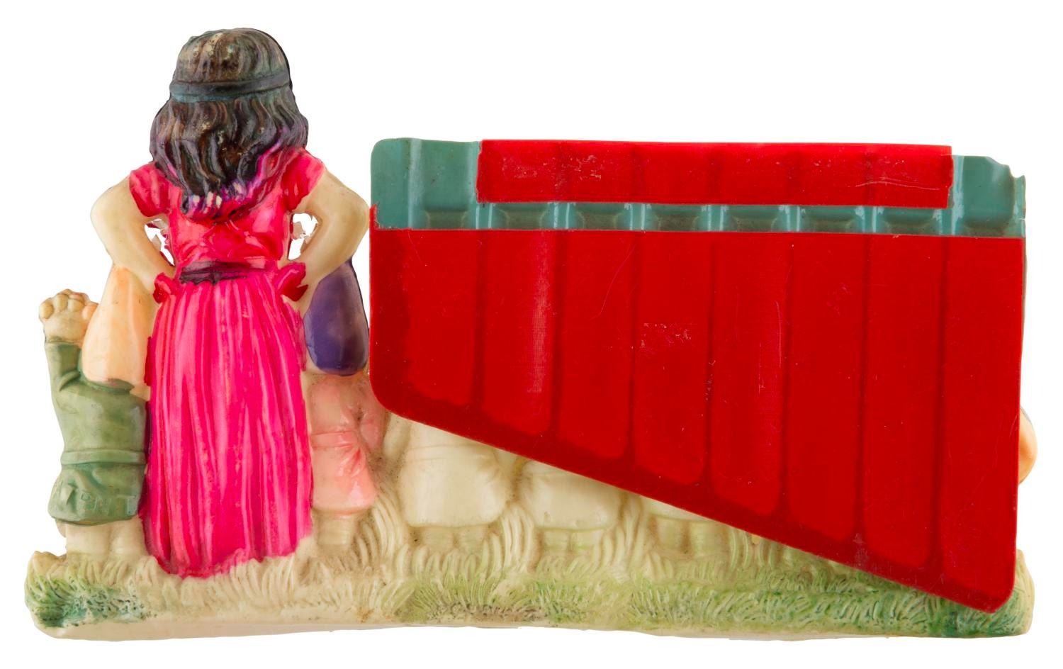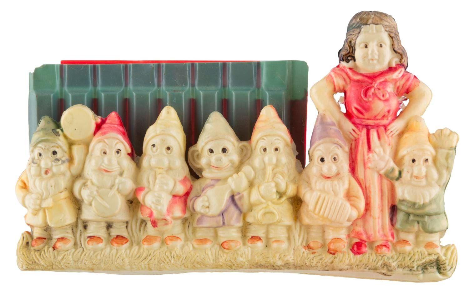 (Disney, 1930s) A “Snow White and the Seven Dwarfs” celluloid toy flute. Measuring 2.75"x 0.75"x4.75", the toy is in very good condition with some color fading and a small chip in the top left edge.