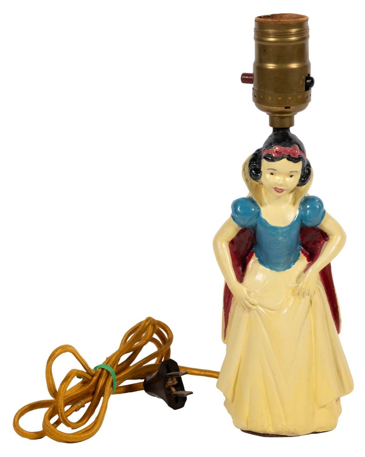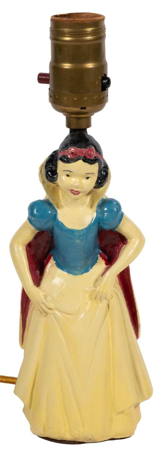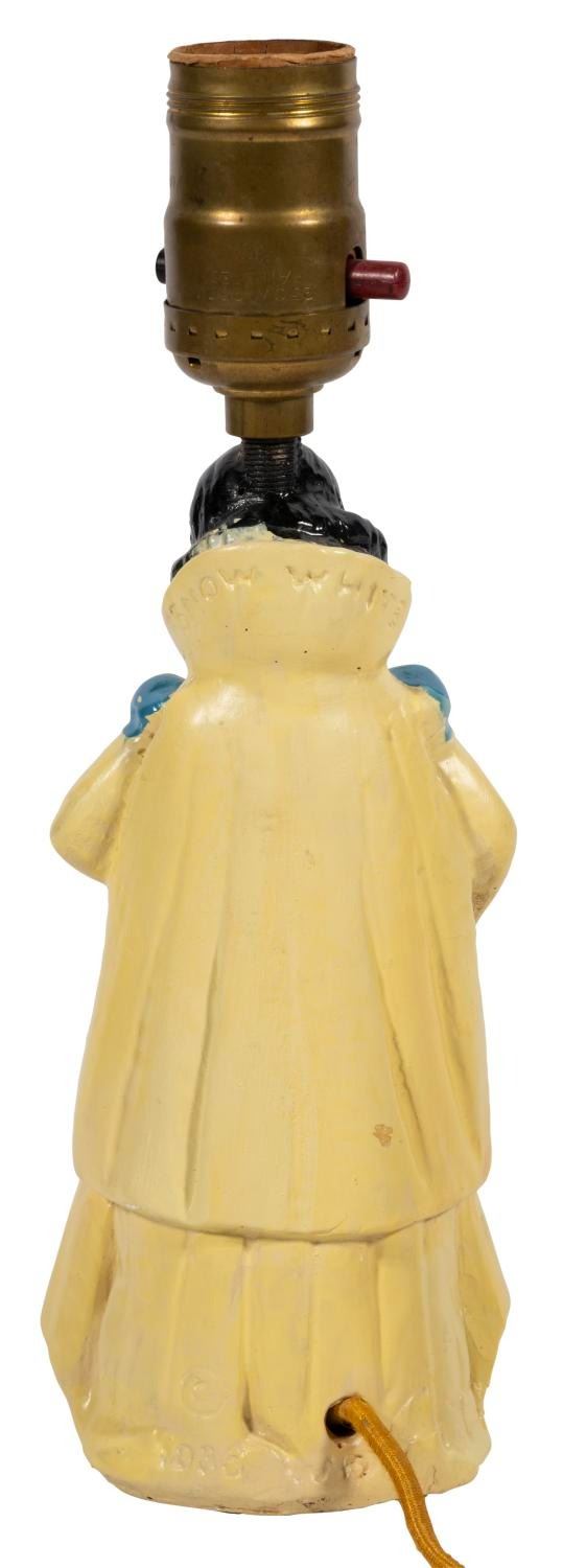 (La Mode Studios, 1938) A Modeware resin figural lamp of Snow White with a distinctive gold cloth insulated cord. Measuring 10" tall, the lamp is in very good working condition, with two small chips on the hair bow, yellowing, and light wear from age.