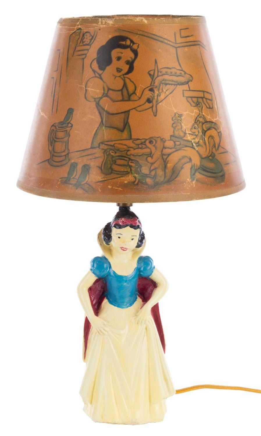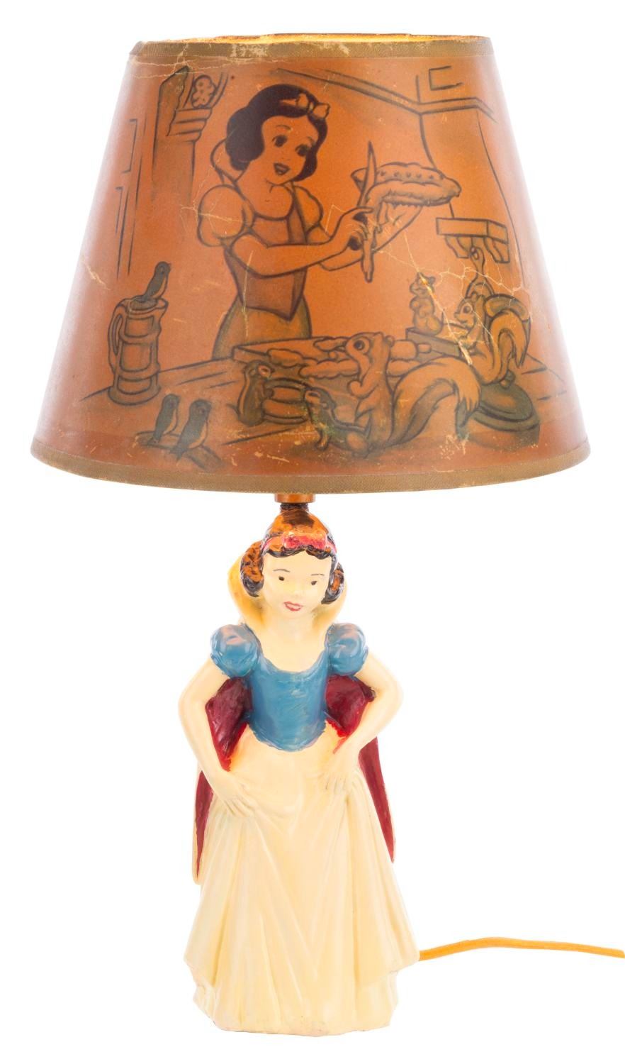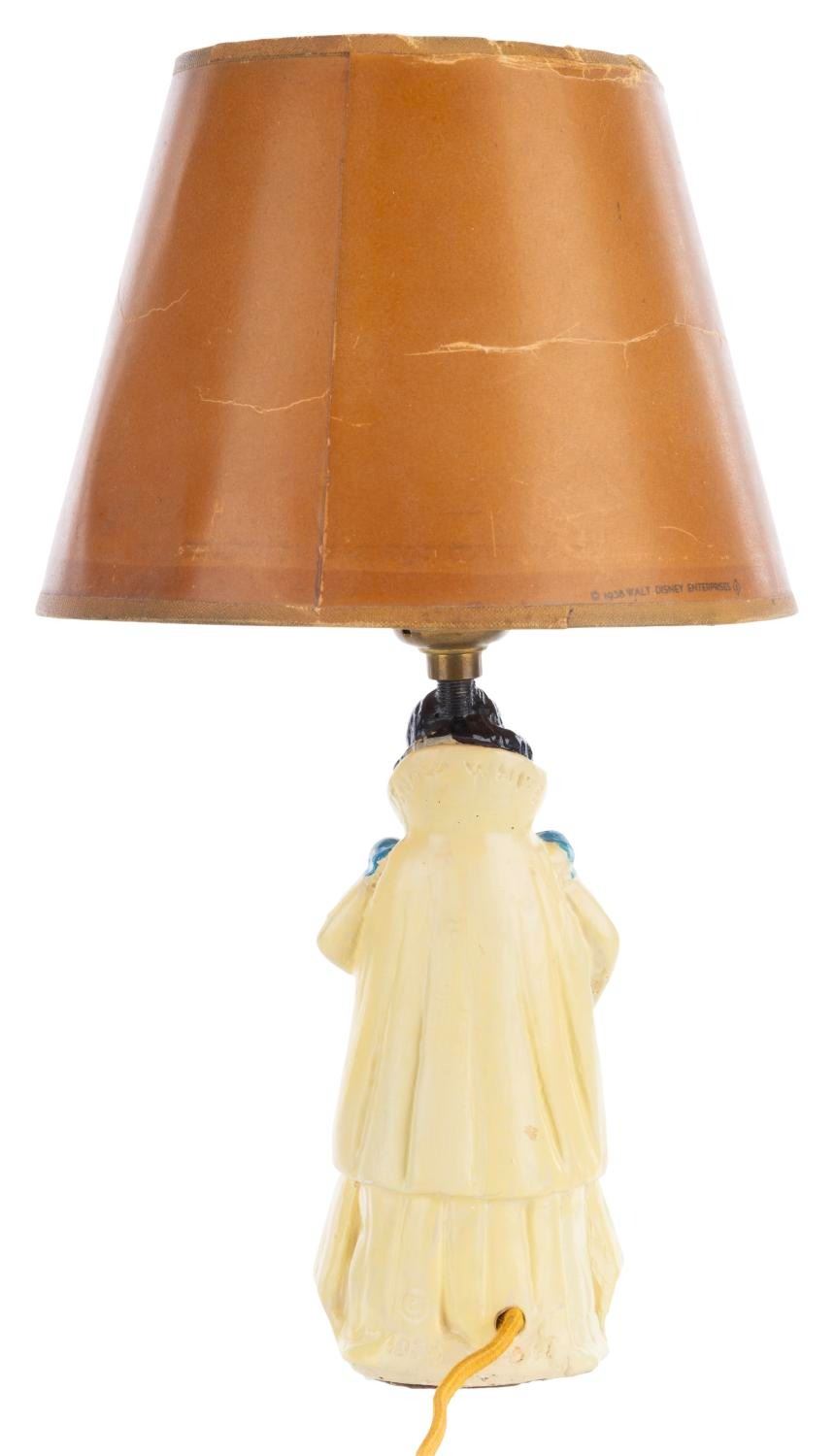 (La Mode Studios, 1938) A Modeware resin figural lamp of Snow White with a distinctive gold cloth insulated cord. Measuring 10" tall, the lamp is in very good working condition, with two small chips on the hair bow, yellowing, and light wear from age.