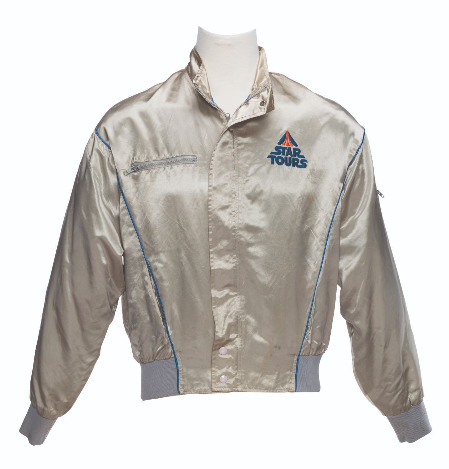 (Disneyland, 1986-1987) An early silver satin jacket from the Star Tours attraction in Tomorrowland. The jacket features an embroidered small Star Tours logo on the front left chest and a large logo on the back. Labeled a size XL, the jacket is in fair condition with stains, small tears, and wear throughout.