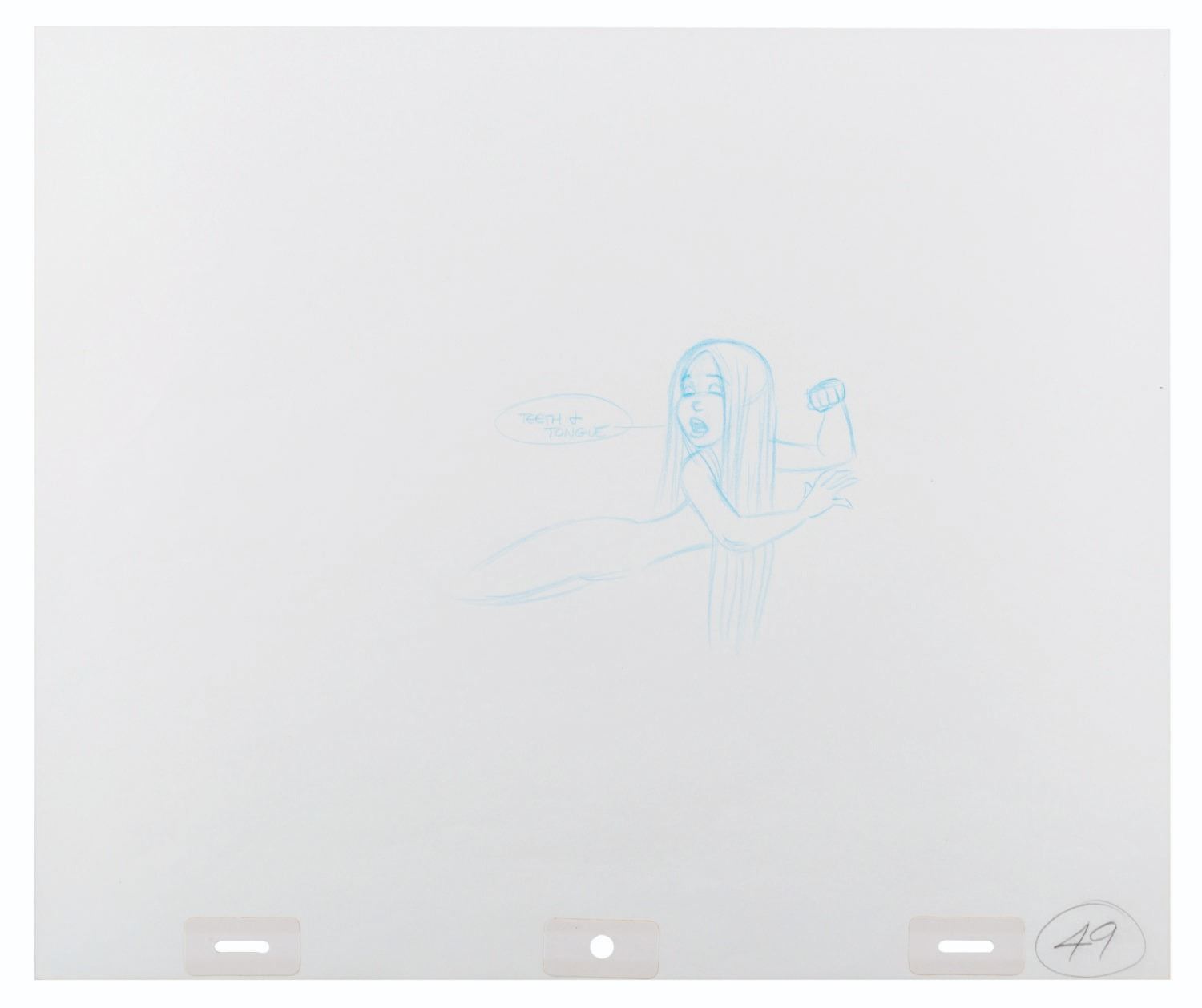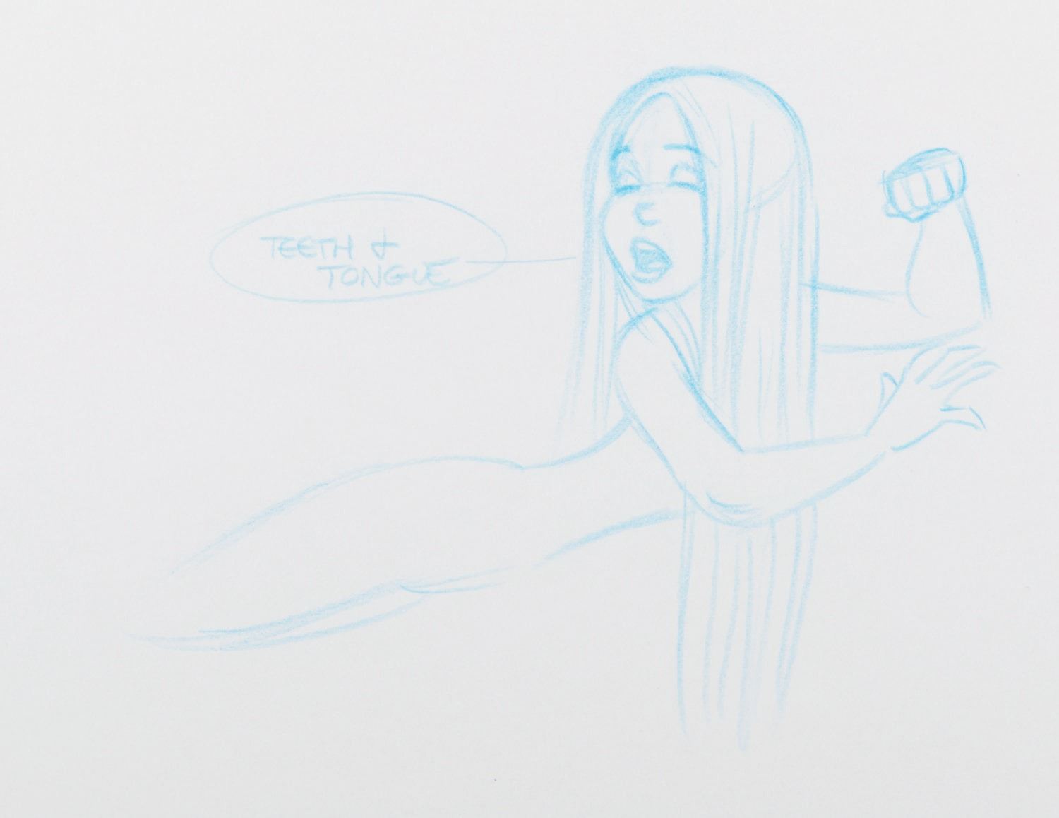 (Disney, 1989) An original drawing of Ariel from early in the development of"The Little Mermaid." The art was accomplished in colored pencil by Disney Legend Mark Henn, with callouts on the page for her teeth and tongue. Ariel measures 3.5" x 4" on 10.5" x 12.5" animation paper. The drawing is in very good condition with minor wear from production use.