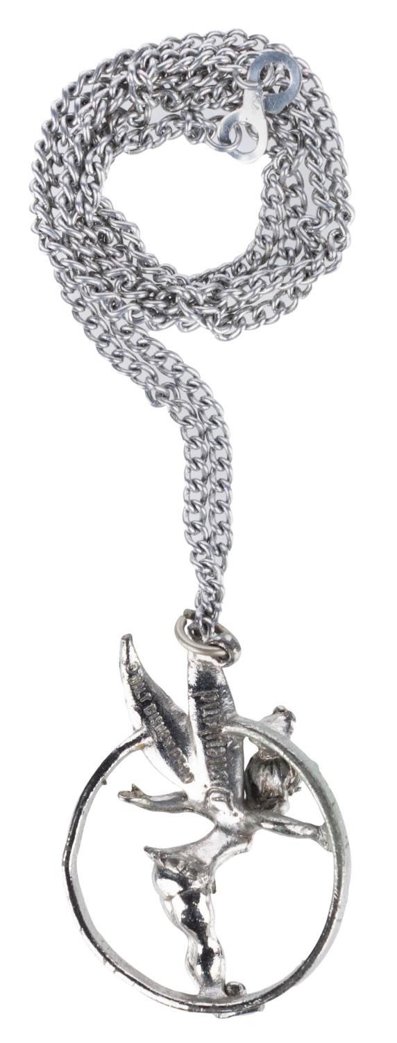(Disneyland, 1950s-60s) An early pewter pendant Tinker Bell souvenir necklace. Measuring 12.5” long with the chain and 1.25” in diameter, the necklace is in very good condition with light scratches, oxidation, and wear.