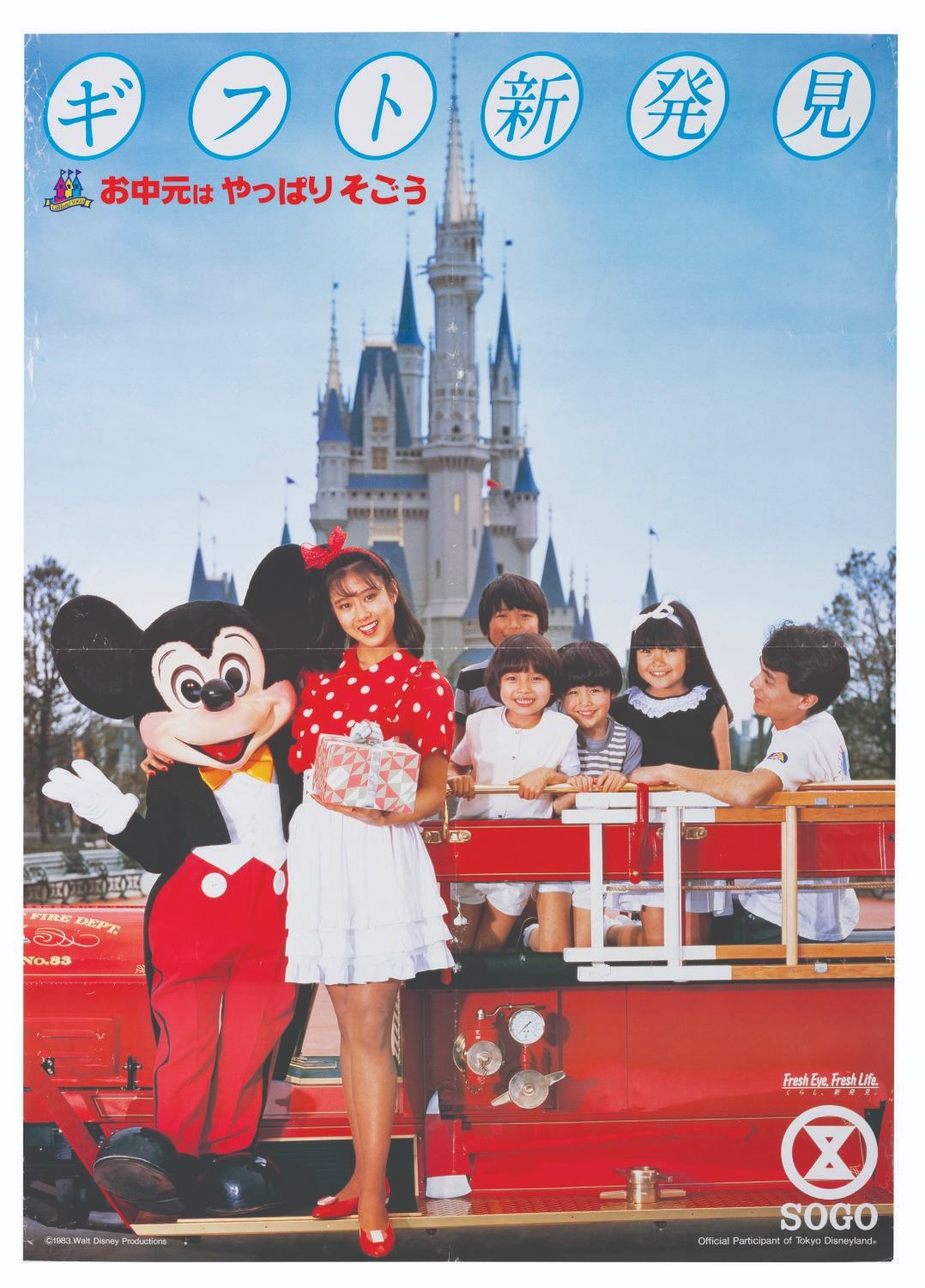 (Tokyo Disneyland, 1983) An early poster from participant sponsor Giftland SOGO at Tokyo Disneyland, featuring Mickey Mouse before Cinderella’s castle. Measuring 28.5” x 40.5”, the poster is in fair condition with two horizontal folds, heavy wear to the left edge, and three small holes in the center spire of the castle.