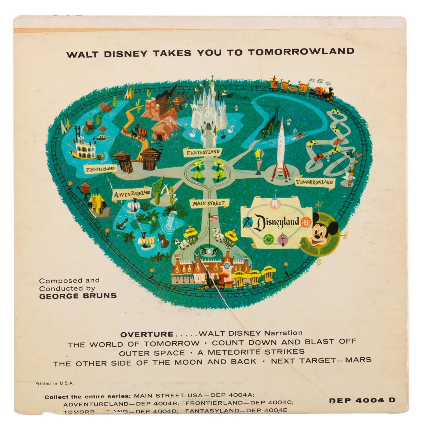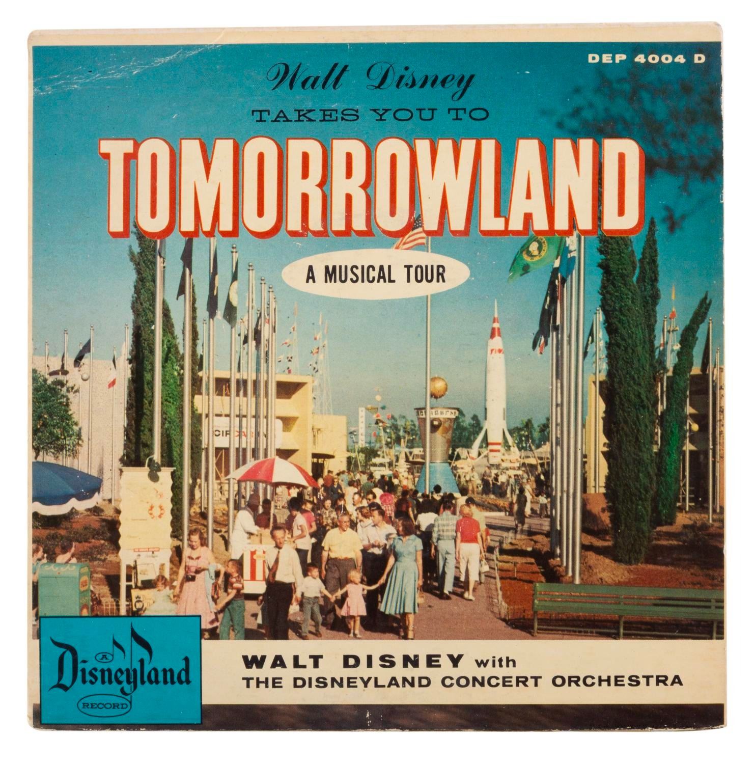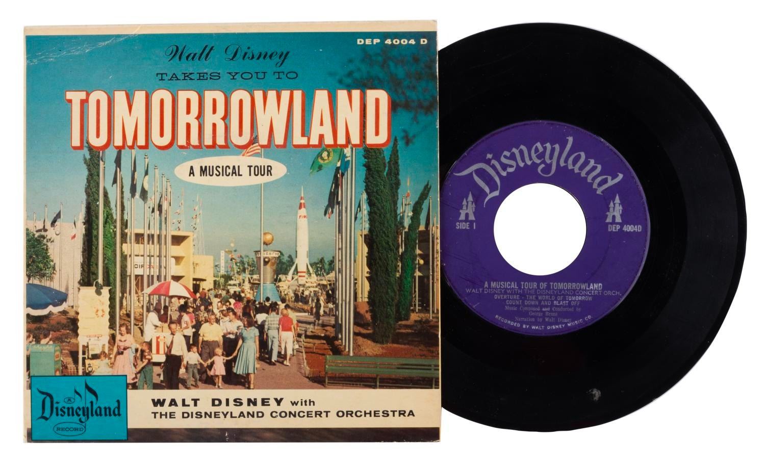 (Disneyland, 1956) A Walt Disney Takes You To Tomorrowland: A Musical Tour record composed and conducted by George Burns and narrated by Walt Disney himself. Measuring 7” in diameter, the record is in good condition with scuffing and scratching and edge wear and splitting to the seams of the 7” x 7” sleeve.