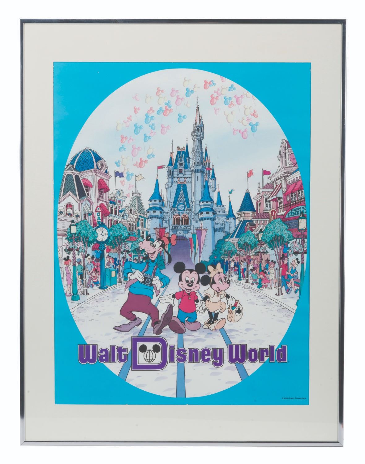 (Walt Disney World, 1980s) An early Walt Disney World poster depicting Mickey, Minnie, and Goofy walking on Main Street before Cinderella's Castle. This was for sale as a souvenir to guests at Walt Disney World in the 1980s, and may date earlier. Measuring 23.5" x 17.5" in a 29.25" x 22.25" single matte frame, the frame and poster are in very good condition.