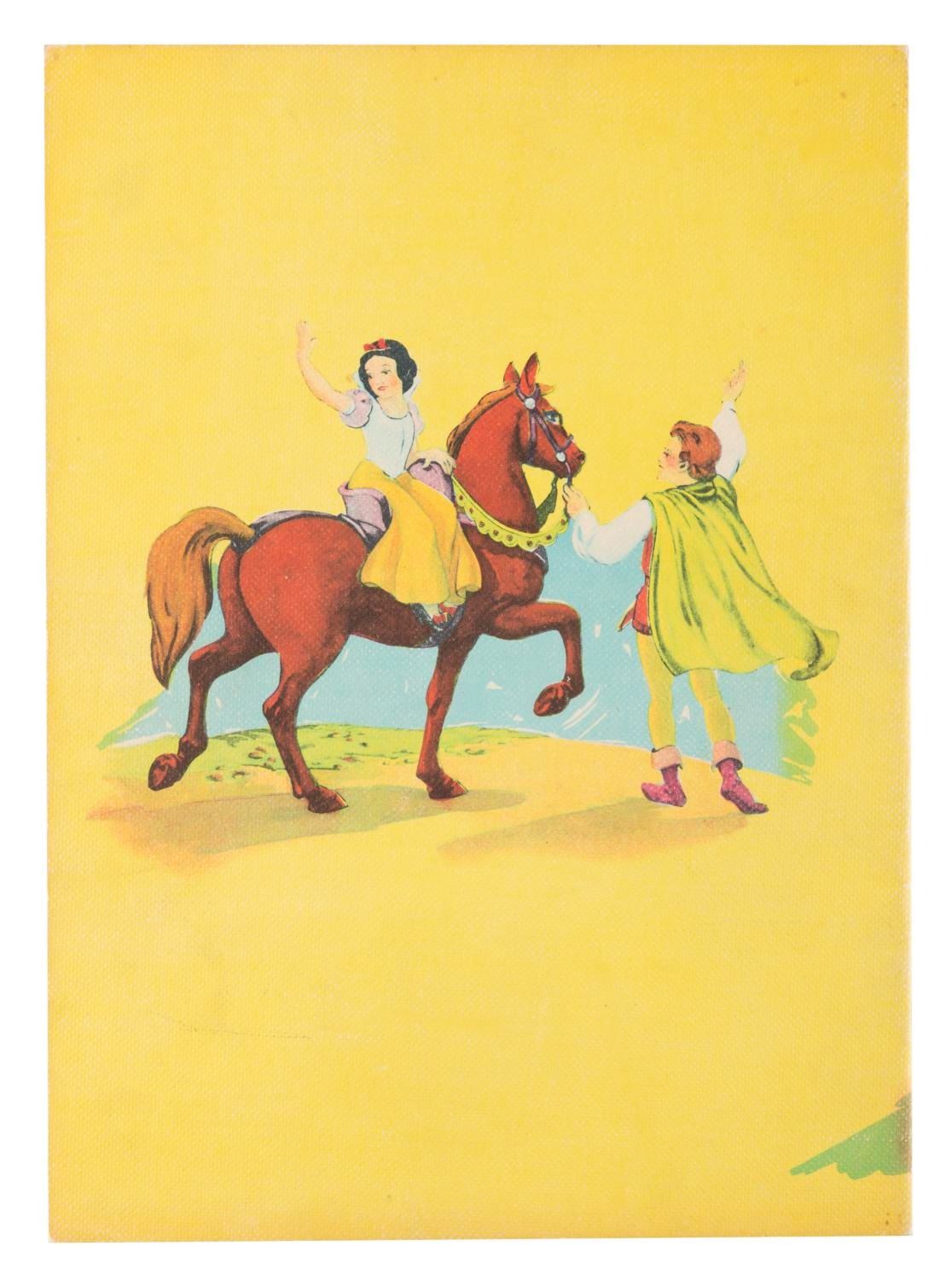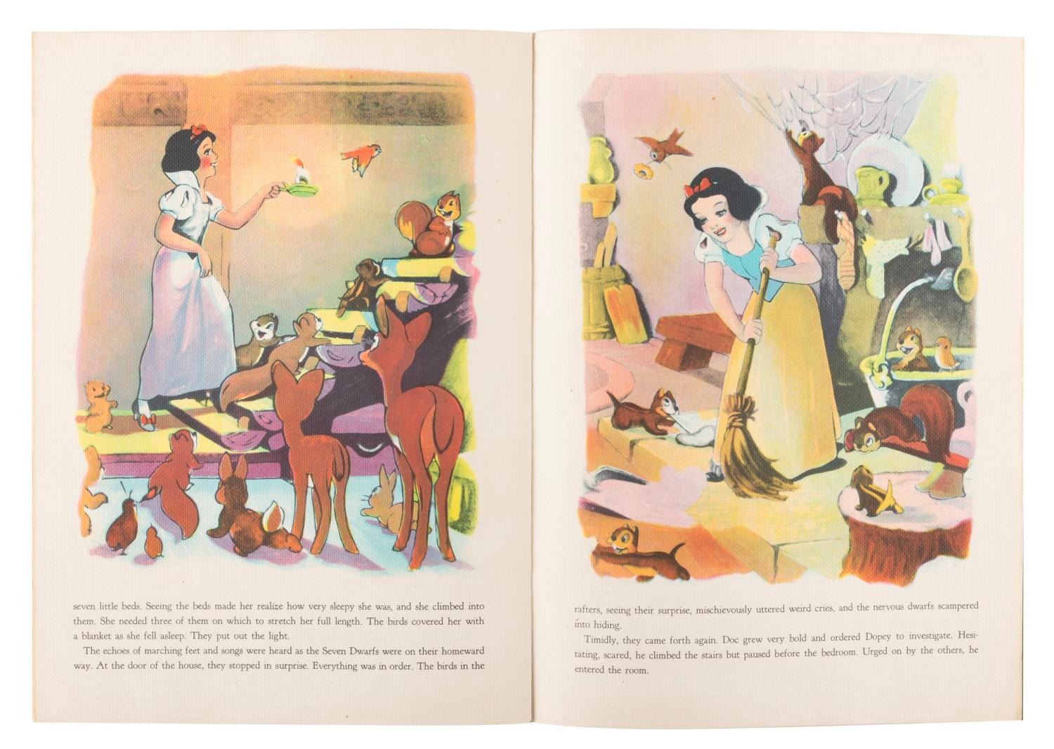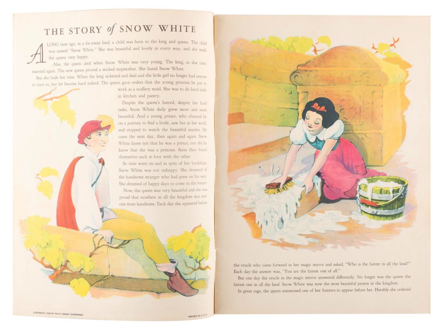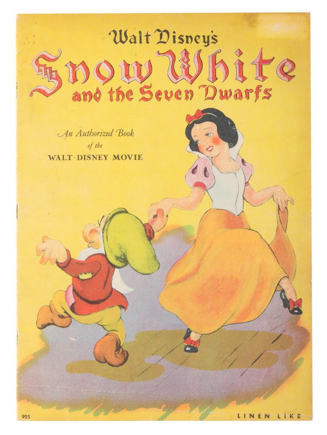 (Disney, 1938) A Walt Disney’s “Snow White and the Seven Dwarfs" book on linen-like paper. Measuring 9.5" x 13", the book is in fair condition with long scratches, spotting, wear, and discoloration from age.