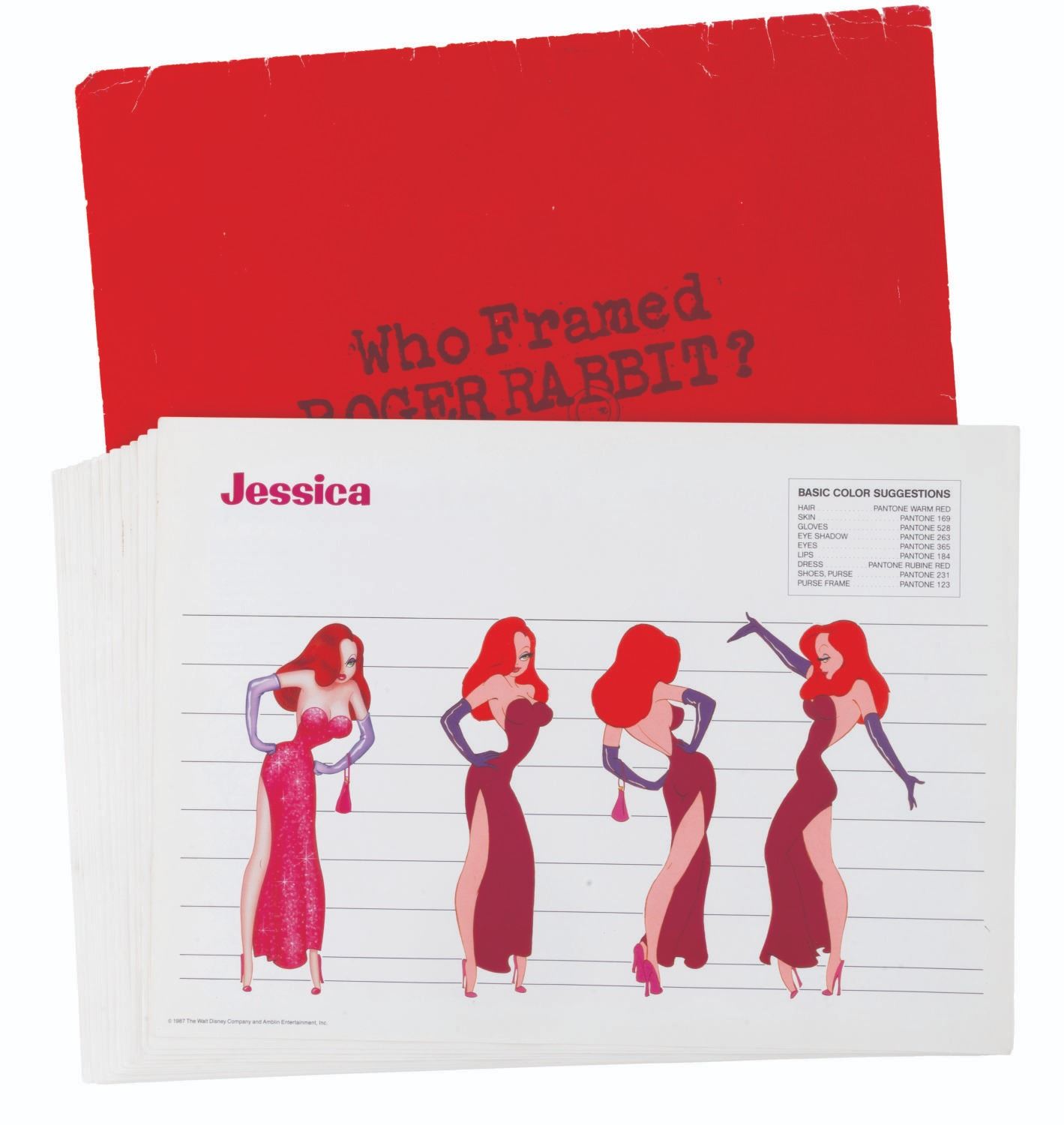 (Disney, 1987) An early style guide for “Who Framed Roger Rabbit.” Included are 17 unbound pages of color guides featuring the film’s toon stars and illustrated versions of the human actors. Since the film was still in production, the guide differs from the final product, with changes including Benny as a purple car with a gold tooth and an abandoned early logo with handcuffs and a question mark at the end. Measuring 11” x 15.25” in its 11.5” x 15.25” folder, the pages are in good condition with light edge wear, creases, and a missing Roger Rabbit color guide page, while the folder is in fair condition with heavy wear and creases.