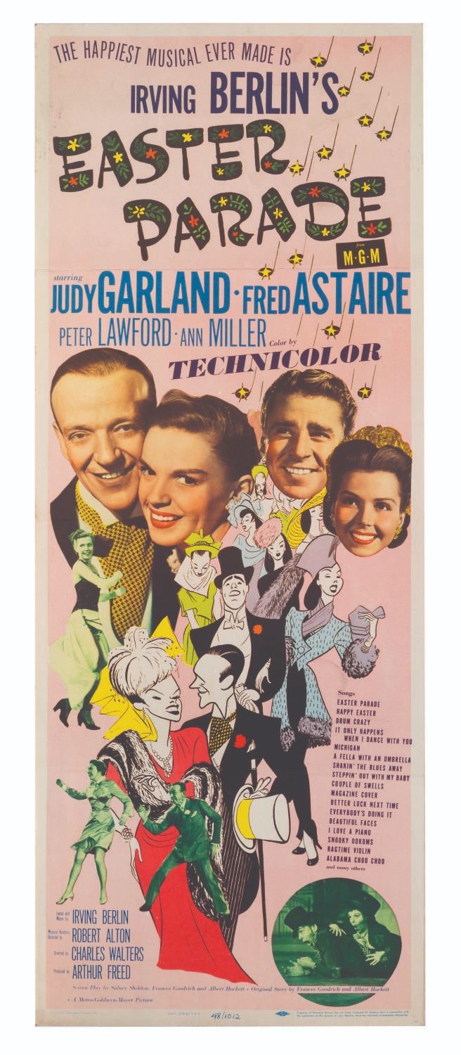 (MGM, 1948) An insert poster for the holiday classic “Easter Parade,” starring Judy Garland and Fred Astaire. Measuring 14” x 36”, the poster displays in good condition with spots of discoloration from age, horizontal folds from storage, stains, staple holes from display, scuffs, and edge wear.