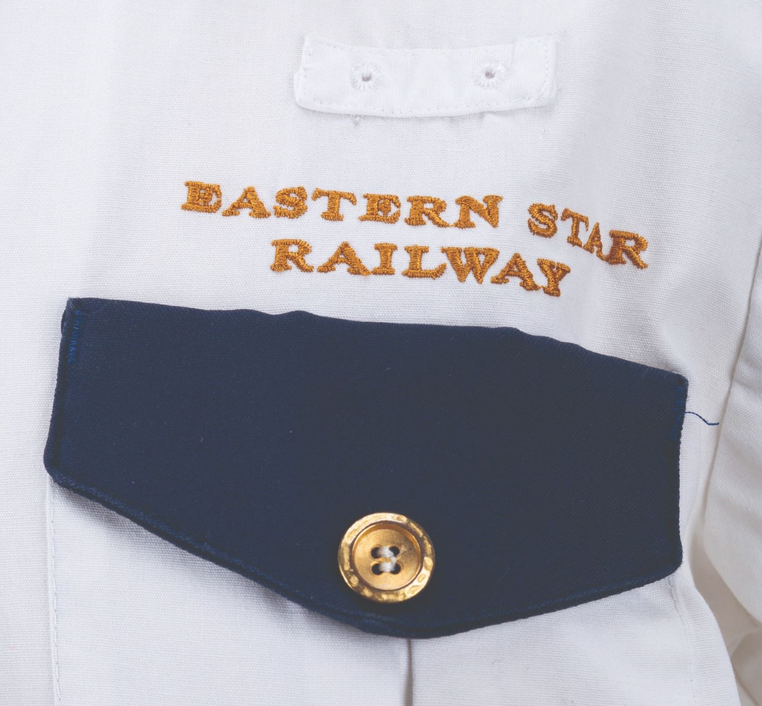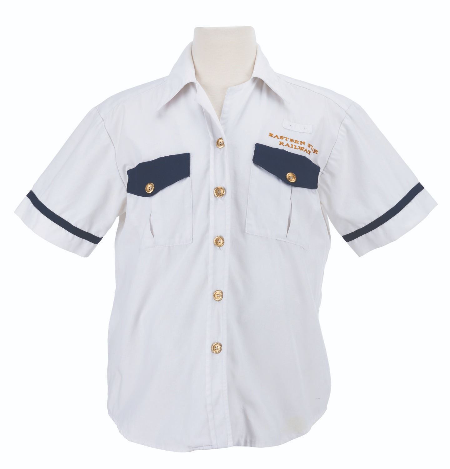 (Disney’s Animal Kingdom, 1998-2000s) A uniform shirt worn by Cast Members working the Eastern Star Railway, the fictitious company behind the Wildlife Express Train at Disney’s Animal Kingdom. Labeled a size M, the shirt is in good condition with stains and light wear from Park use.