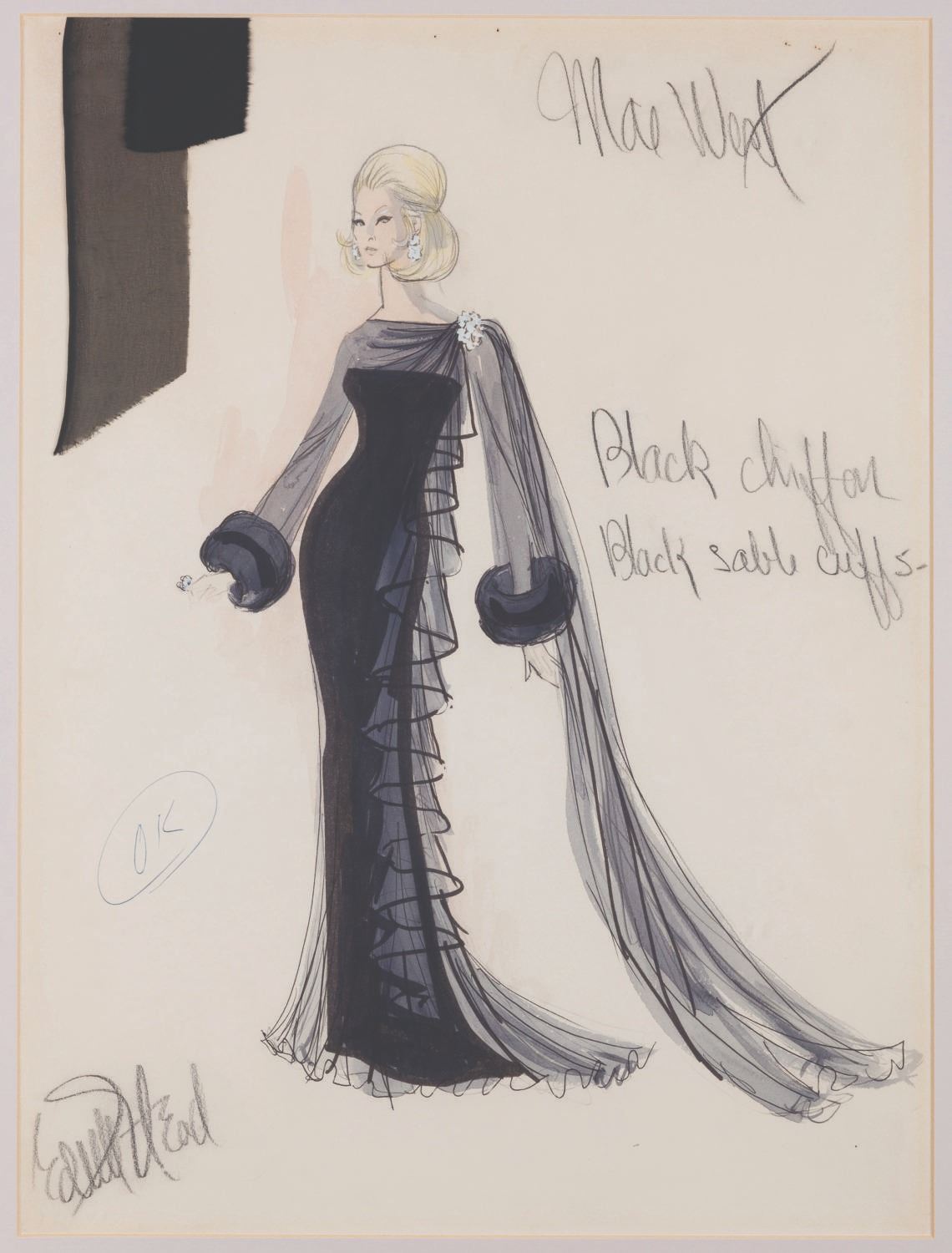 (20th Century Fox, 1970) An Edith Head costume design for Mae West in “Myra Breckinridge.” Black chiffon and black sable cuffs adorn West in this design from the Hollywood legend. Head still holds the record for most Oscar wins by a woman, having taken home the trophy for Best Costume Design eight times. Head signed the piece in the bottom left corner. Measuring 14.75” x 19.75” on a 19.75” x 24.75” matte with 2.25” and 7” fabric swatches included, this art displays in very good condition with light scuffs and pinholes.