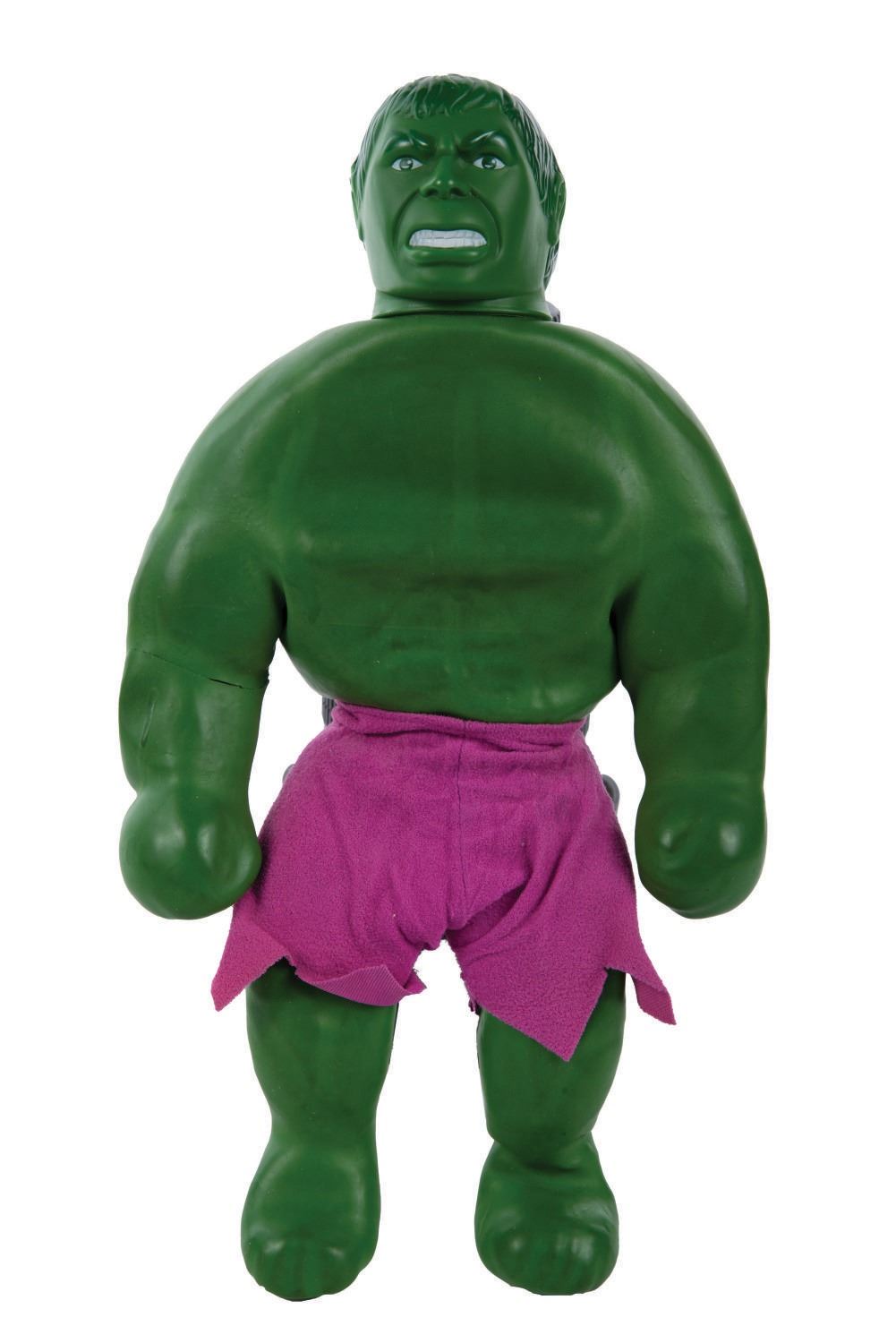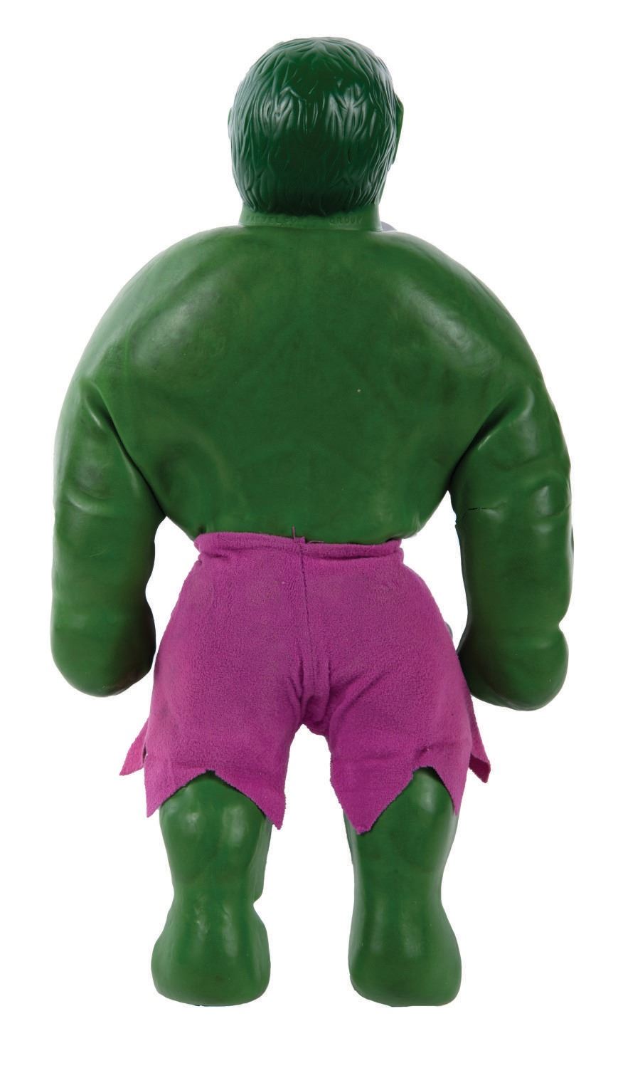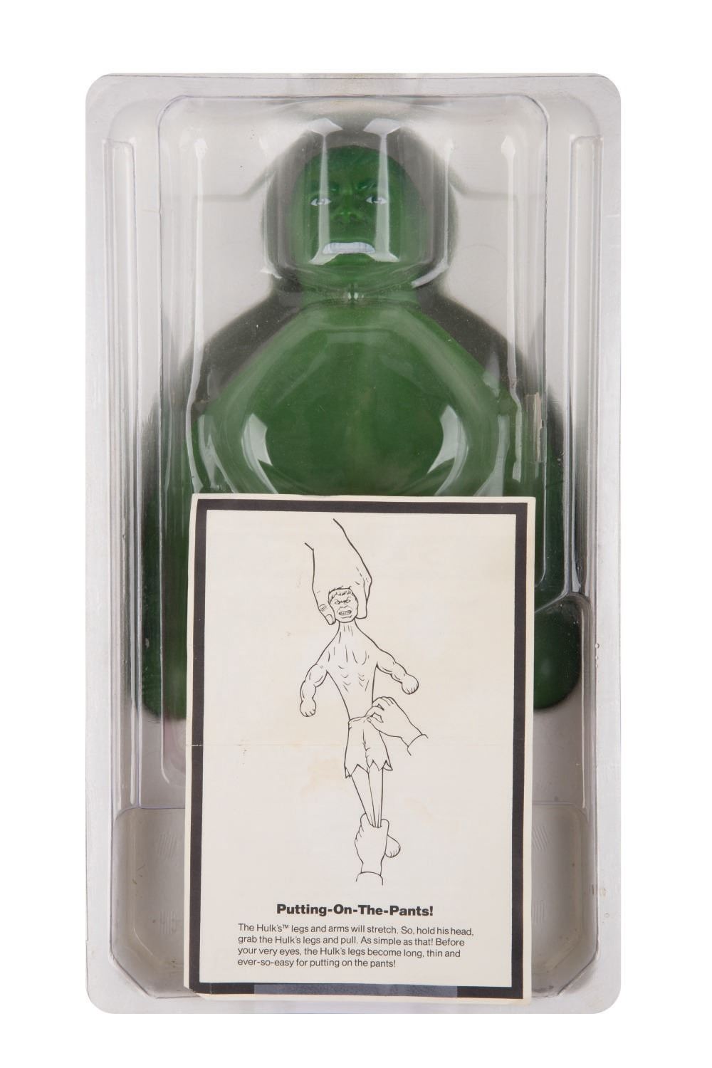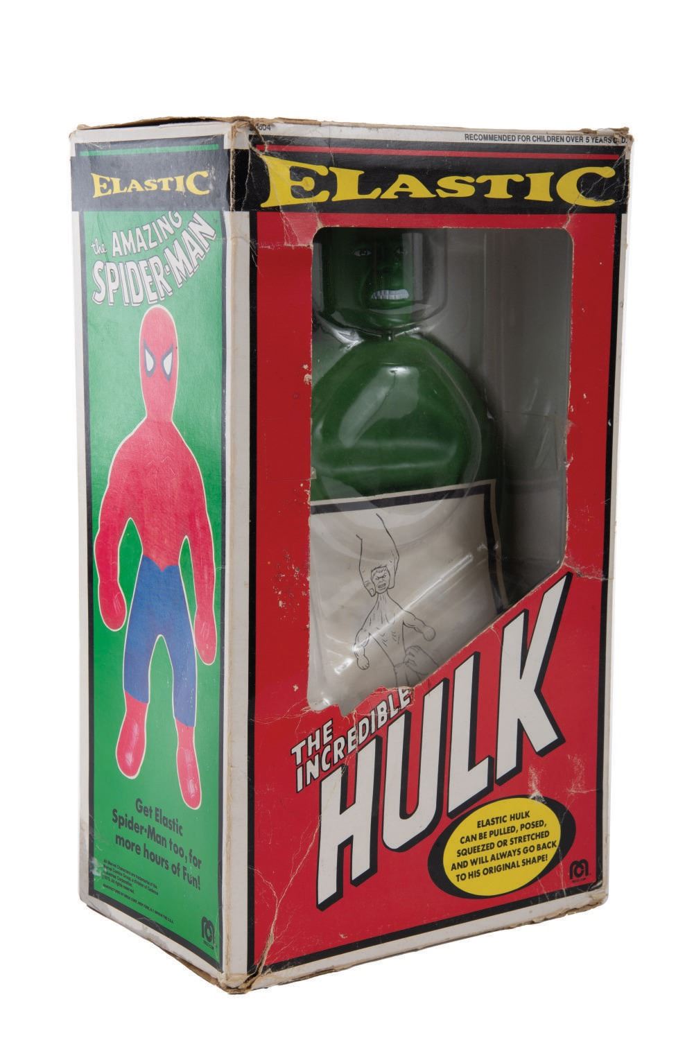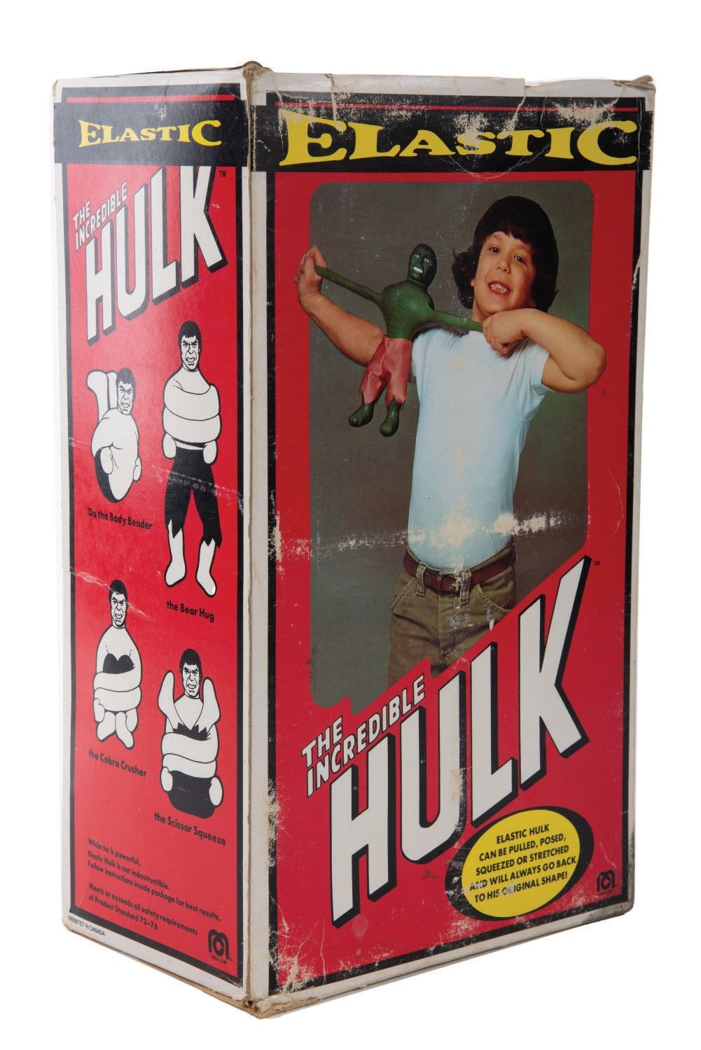 (Marvel/Mego, 1979) An extremely rare Elastic The Incredible Hulk & box by Mego. As Mego's share of the toy market waned in the late 1970's, they built on their Superhero line with new Elastic Heroes including Superman, Batman, Hulk, and (most appropriately) Plastic Man. Kenner sued Mego, asserting the Elastic Heroes infringed on the patent for their popular Stretch Armstrong toy. Following the lawsuit, the last two figures of the Elastic Hero line, Plastic Man and the Hulk, were produced in extremely short runs. The ultra-rare Elastic Hulk has been named as the "Holy Grail" of both Hulk collectibles Stretch toys and is considered one of the hardest to find of all toys. This Elastic Hulk comes complete with box, original styrofoam and plastic overlay, and "Putting-On- Pants" instructions. Measuring 12.5" tall, the figure is in very good condition, with typical hardening to the fill, a slight crack on the right elbow, and exhibiting convex chest depression to latex. Measuring 14.5" tall and 8.5"x5.5", the box displays in very good condition despite creases and wear throughout. The styrofoam, overlay, and instructions are all in fine condition.