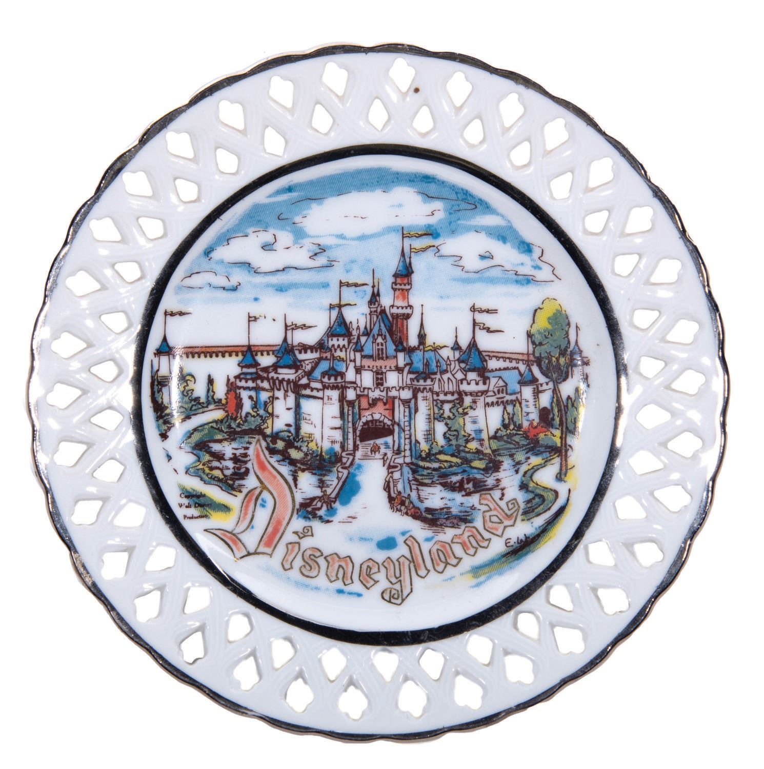 (Disneyland, 1955) An ornate vintage Disneyland souvenir lace plate created by Eleanore Welborn Art Productions. Hand selected by Walt Disney as the first official ceramic supplier to the park prior to its opening, many of their original souvenir designs were based on Imagineering concept art as the actual attractions had yet to be built. The plate with silver-tone border accents is marked with maker's information on the reverse. Measuring 6.25" in diameter, the plate is in fine condition.