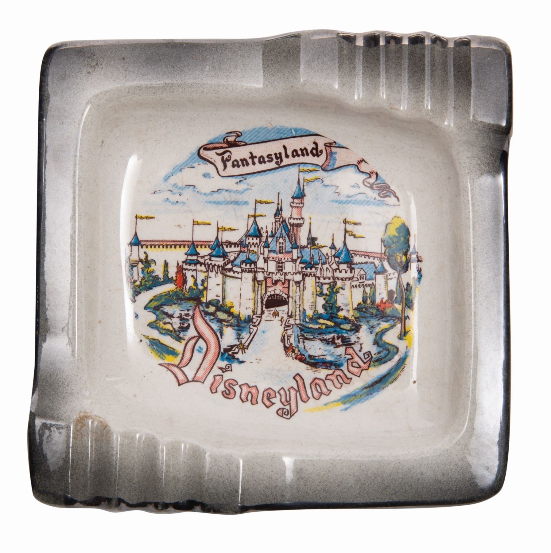 (Disneyland, 1955) A large Disneyland souvenir ashtray manufactured by Eleanore Welborn. The entryway to Fantasyland and Sleeping Beauty Castle are beautifully represented on this early souvenir of Disneyland. The glazed ceramic ashtray measures 6.25"x6.25" and is in very good condition with minor crazing throughout.
