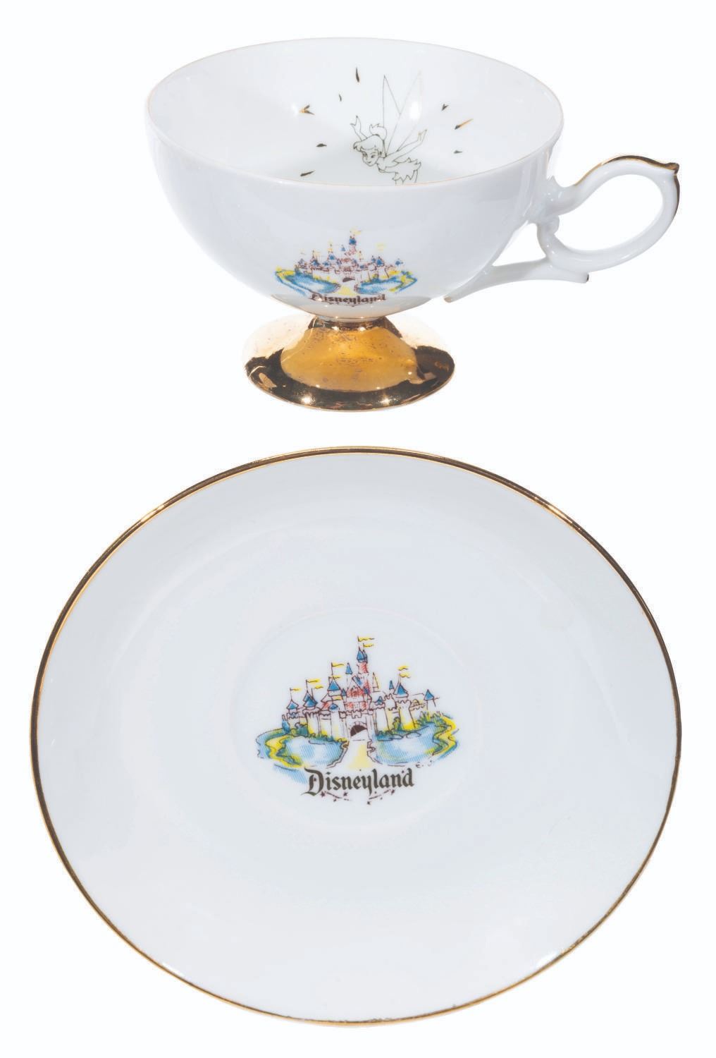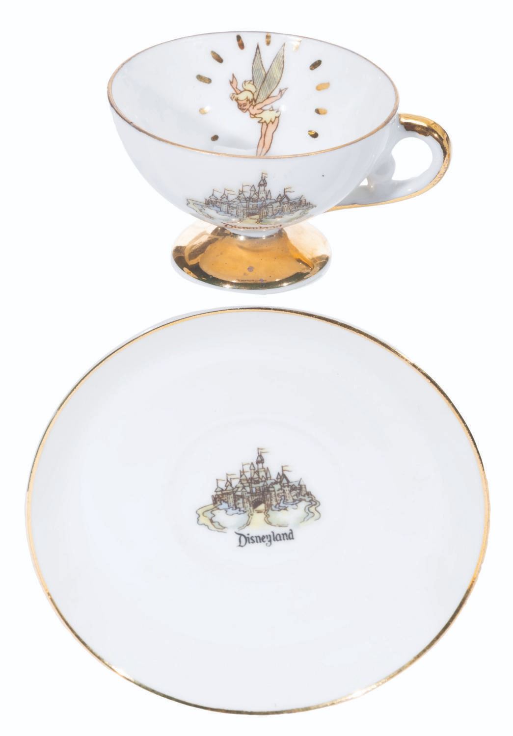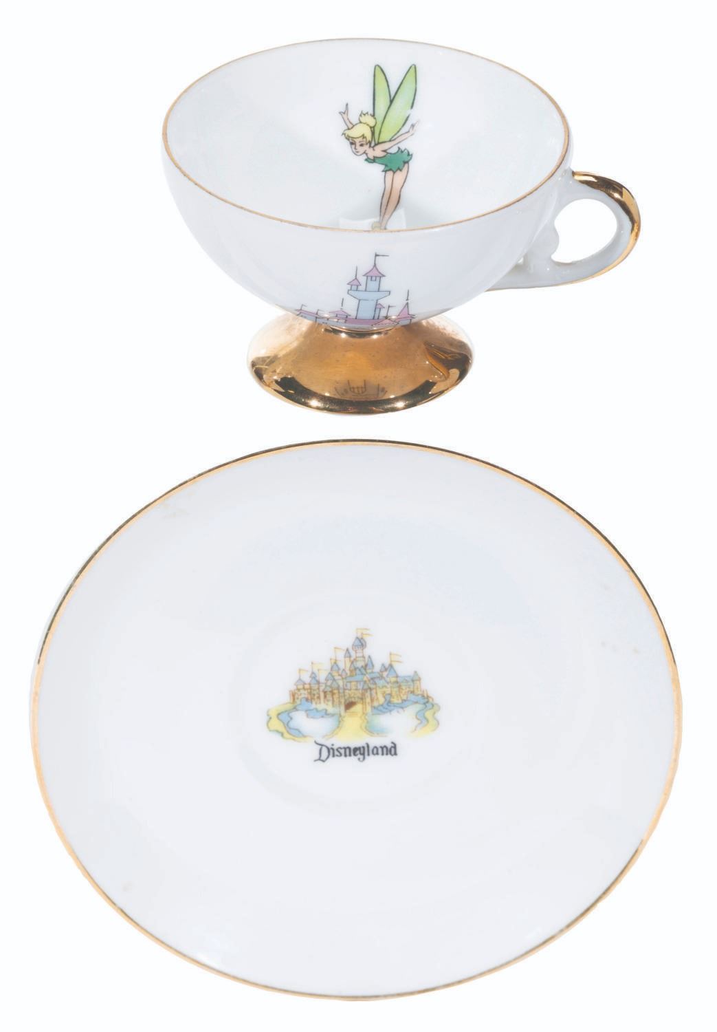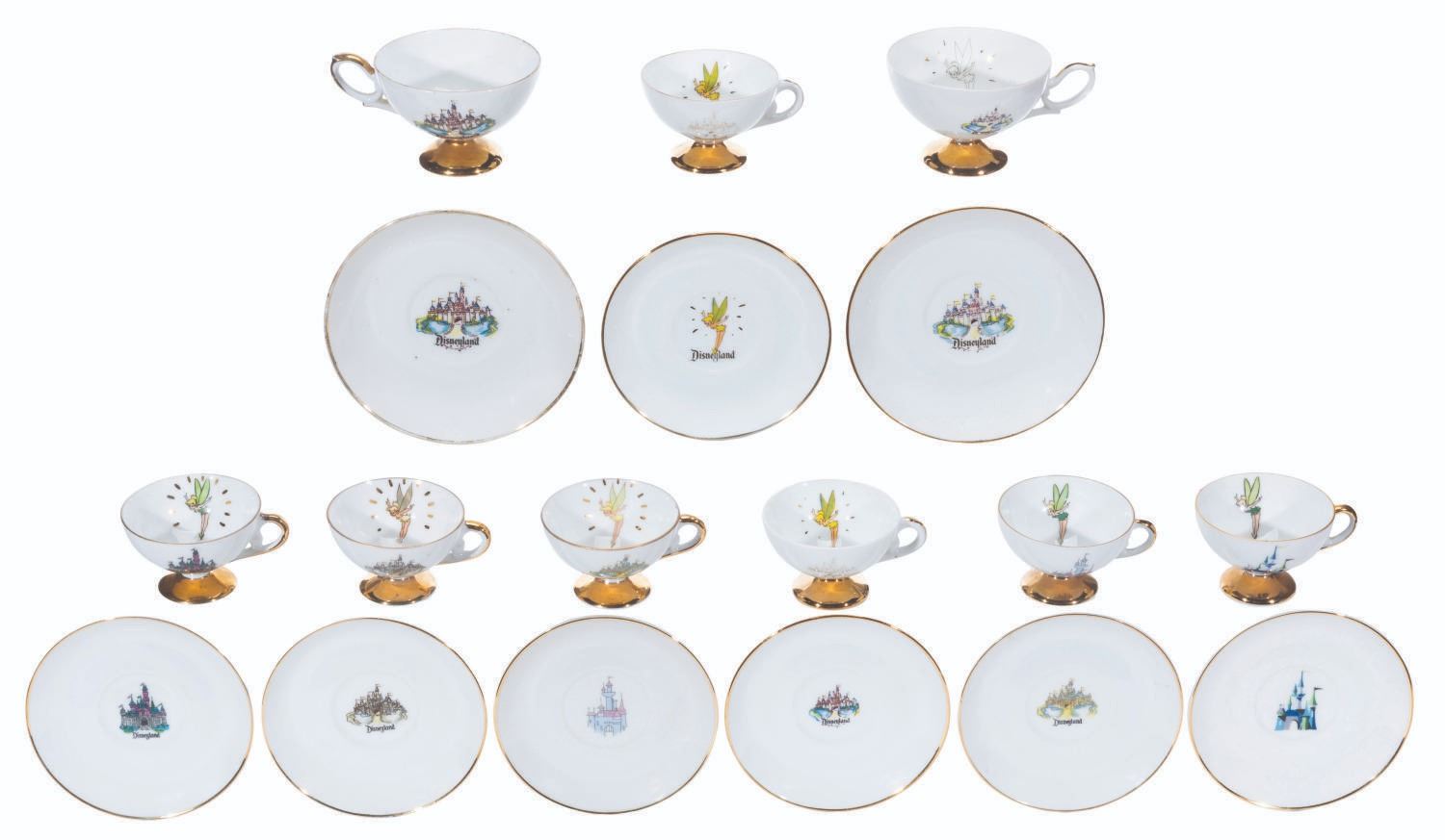 (Disneyland, 1950s-60s) A collection of nine teacups and saucers from the early days of Disneyland. These souvenirs feature Tinker Bell and Sleeping Beauty Castle and were created by Eleanore Welborn, the top name in early Disney ceramics. The teacups range in size from 2.75” in diameter and 2” tall to 3.25” in diameter and 2.25” tall, while the saucers range from 4.5” to 5” in diameter, all in good to very good condition with light paint loss, stains, and wear from age.