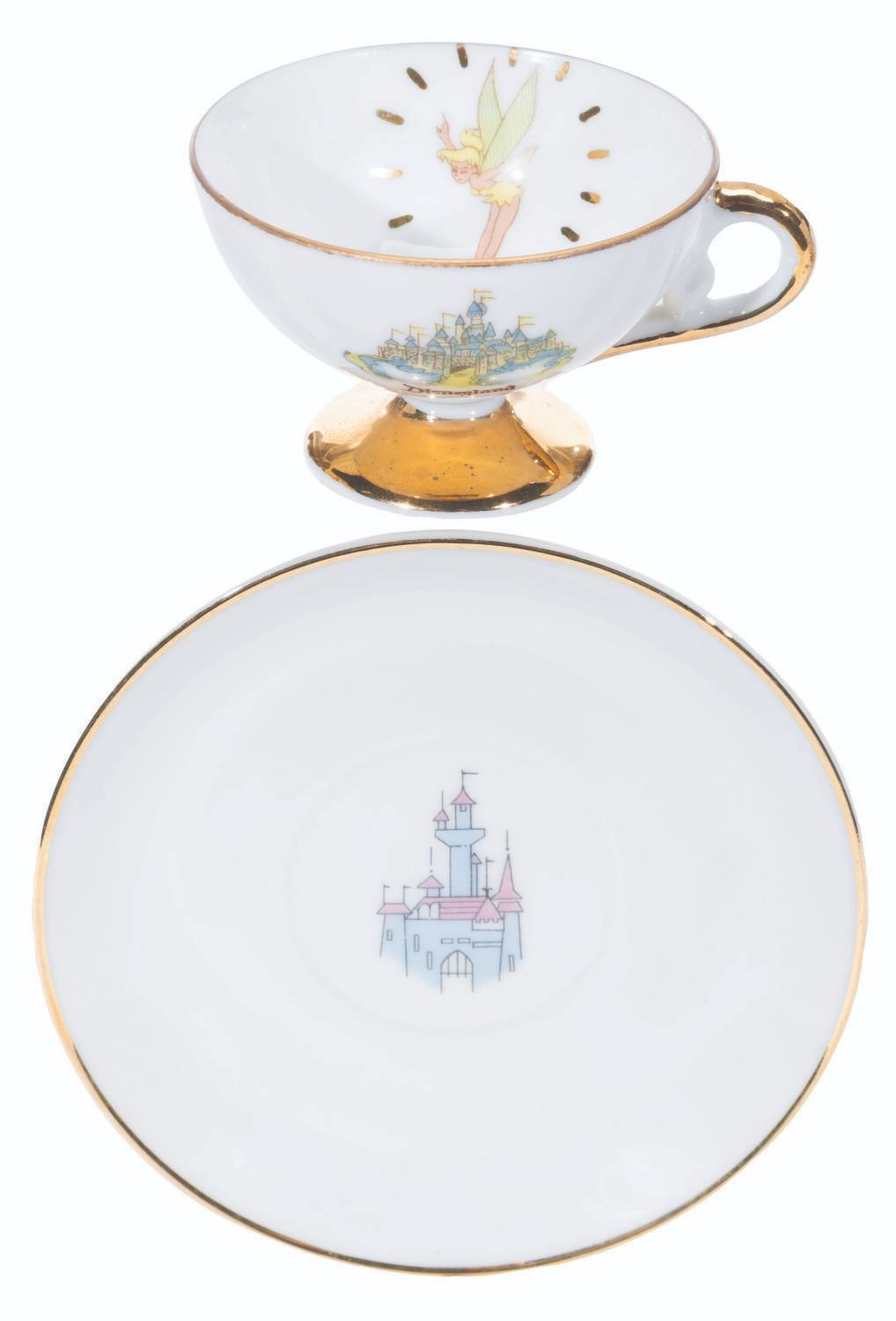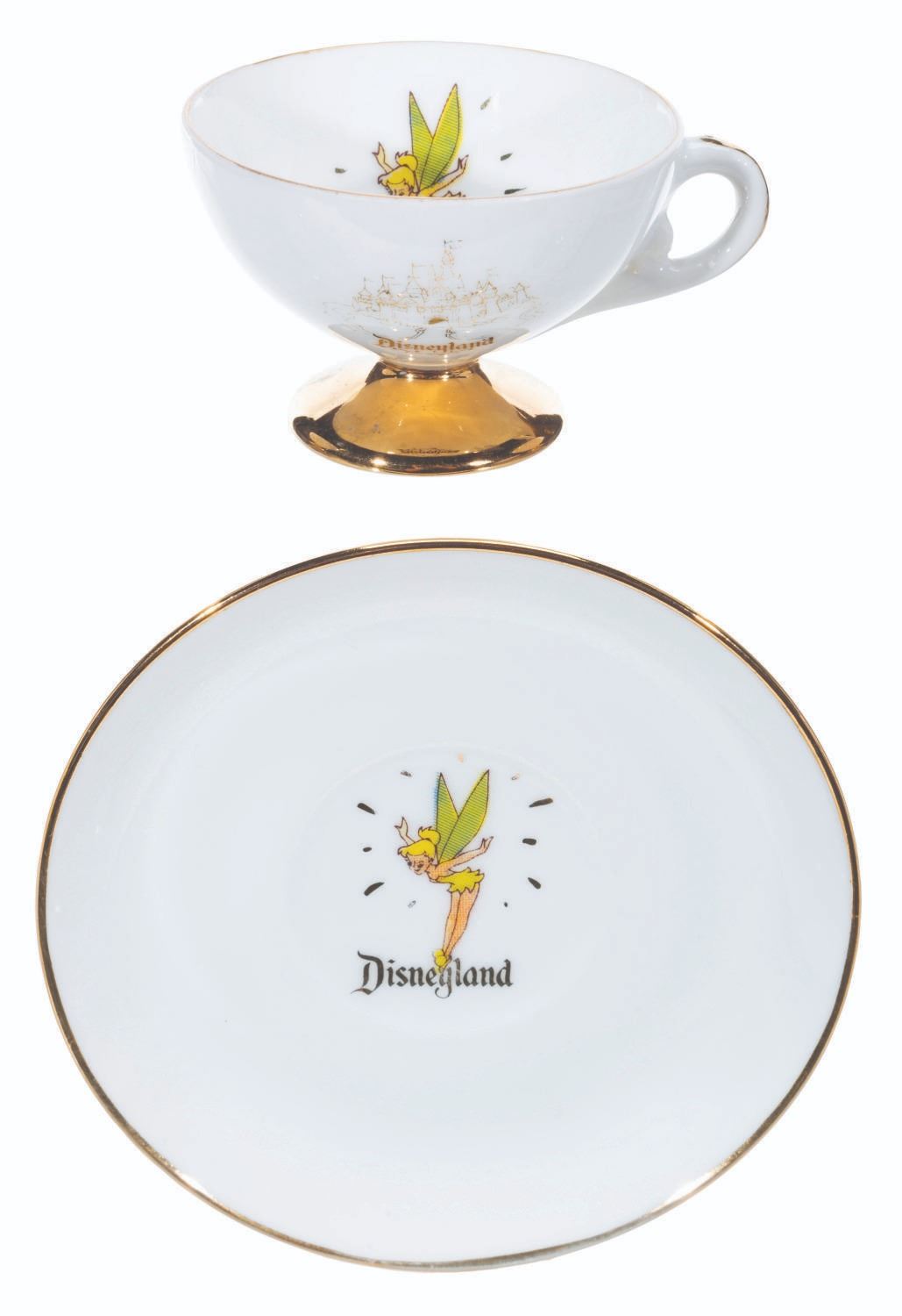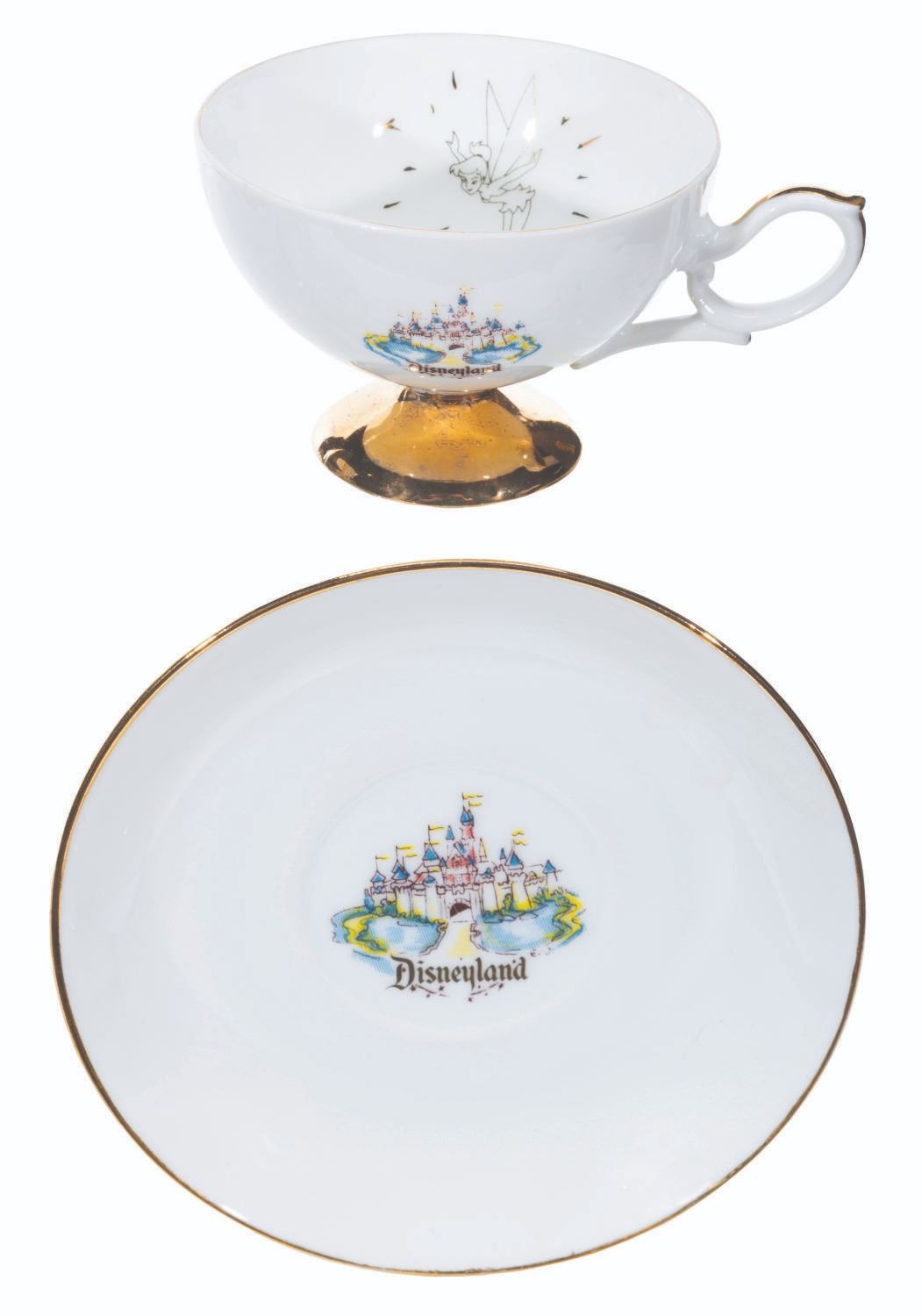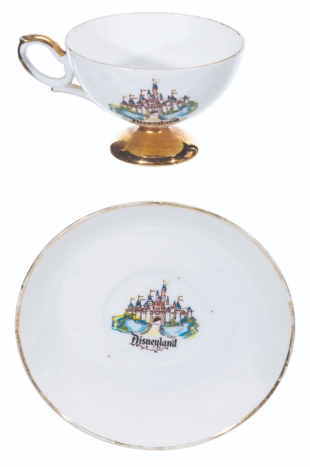 (Disneyland, 1950s-60s) A collection of nine teacups and saucers from the early days of Disneyland. These souvenirs feature Tinker Bell and Sleeping Beauty Castle and were created by Eleanore Welborn, the top name in early Disney ceramics. The teacups range in size from 2.75” in diameter and 2” tall to 3.25” in diameter and 2.25” tall, while the saucers range from 4.5” to 5” in diameter, all in good to very good condition with light paint loss, stains, and wear from age.