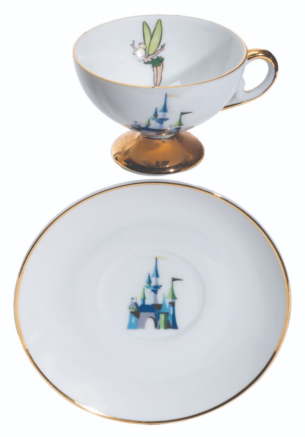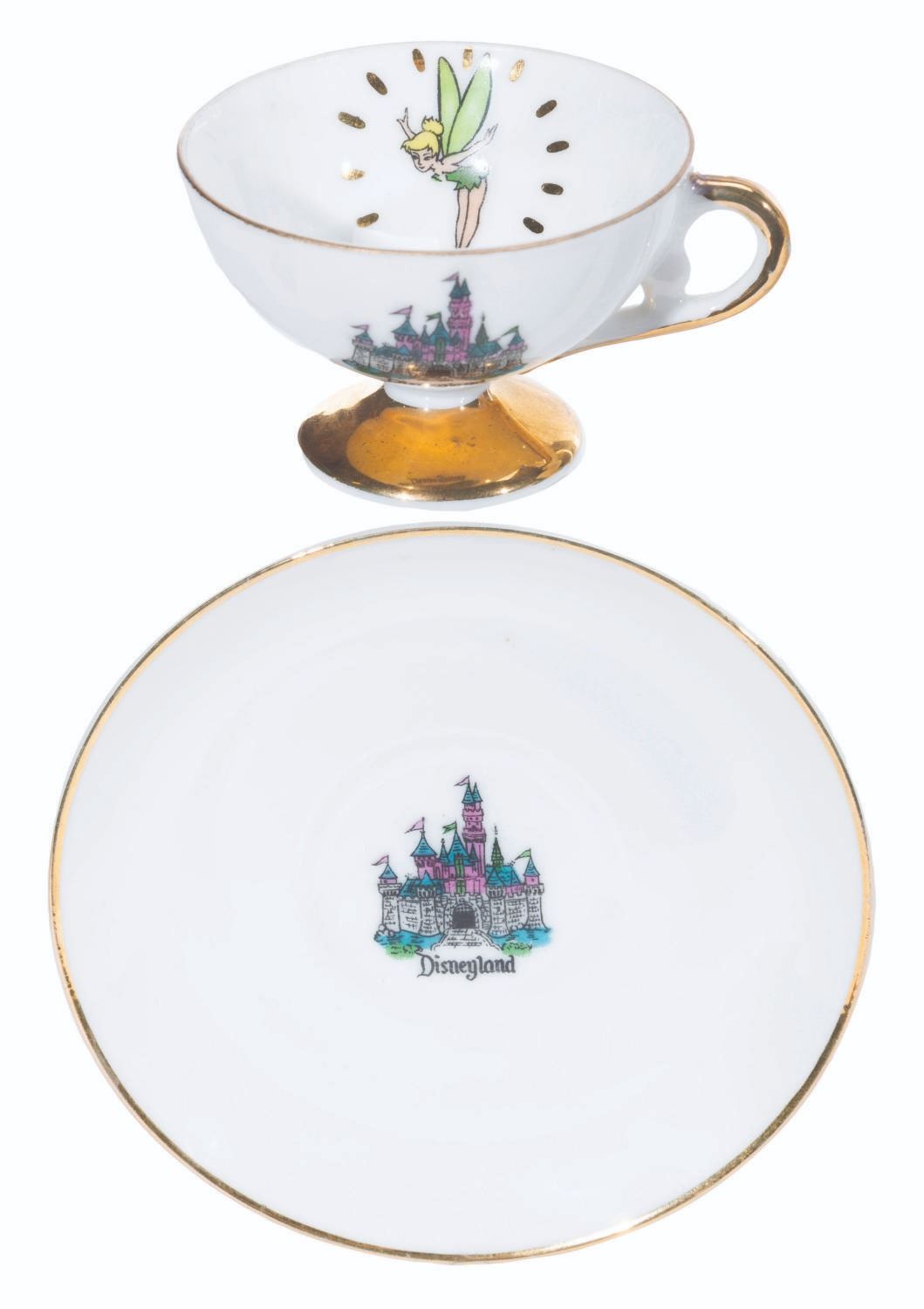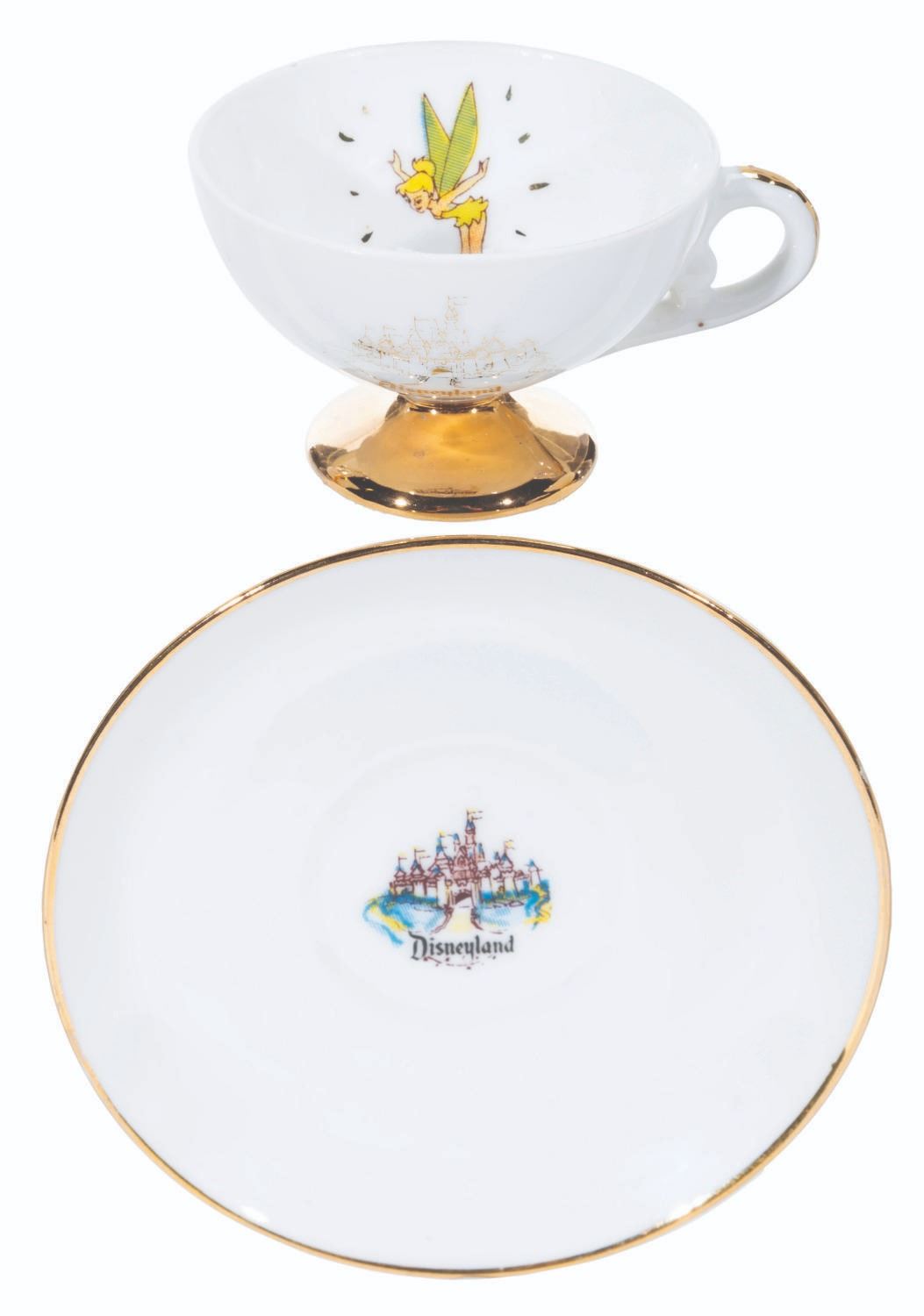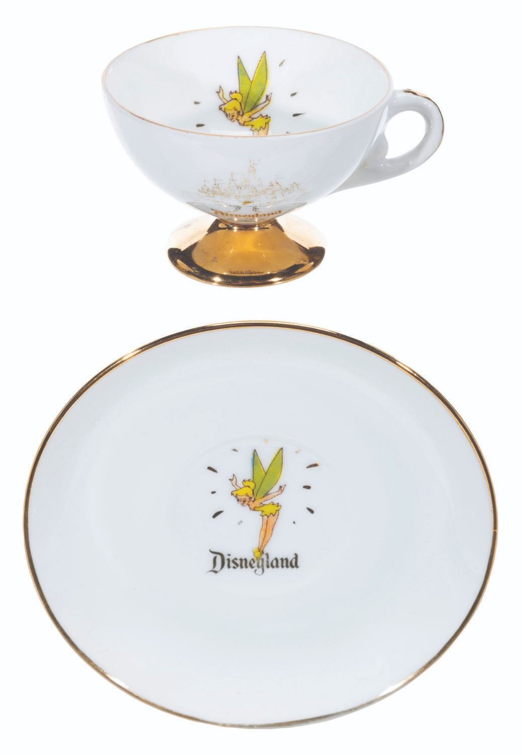 (Disneyland, 1950s-60s) A collection of nine teacups and saucers from the early days of Disneyland. These souvenirs feature Tinker Bell and Sleeping Beauty Castle and were created by Eleanore Welborn, the top name in early Disney ceramics. The teacups range in size from 2.75” in diameter and 2” tall to 3.25” in diameter and 2.25” tall, while the saucers range from 4.5” to 5” in diameter, all in good to very good condition with light paint loss, stains, and wear from age.