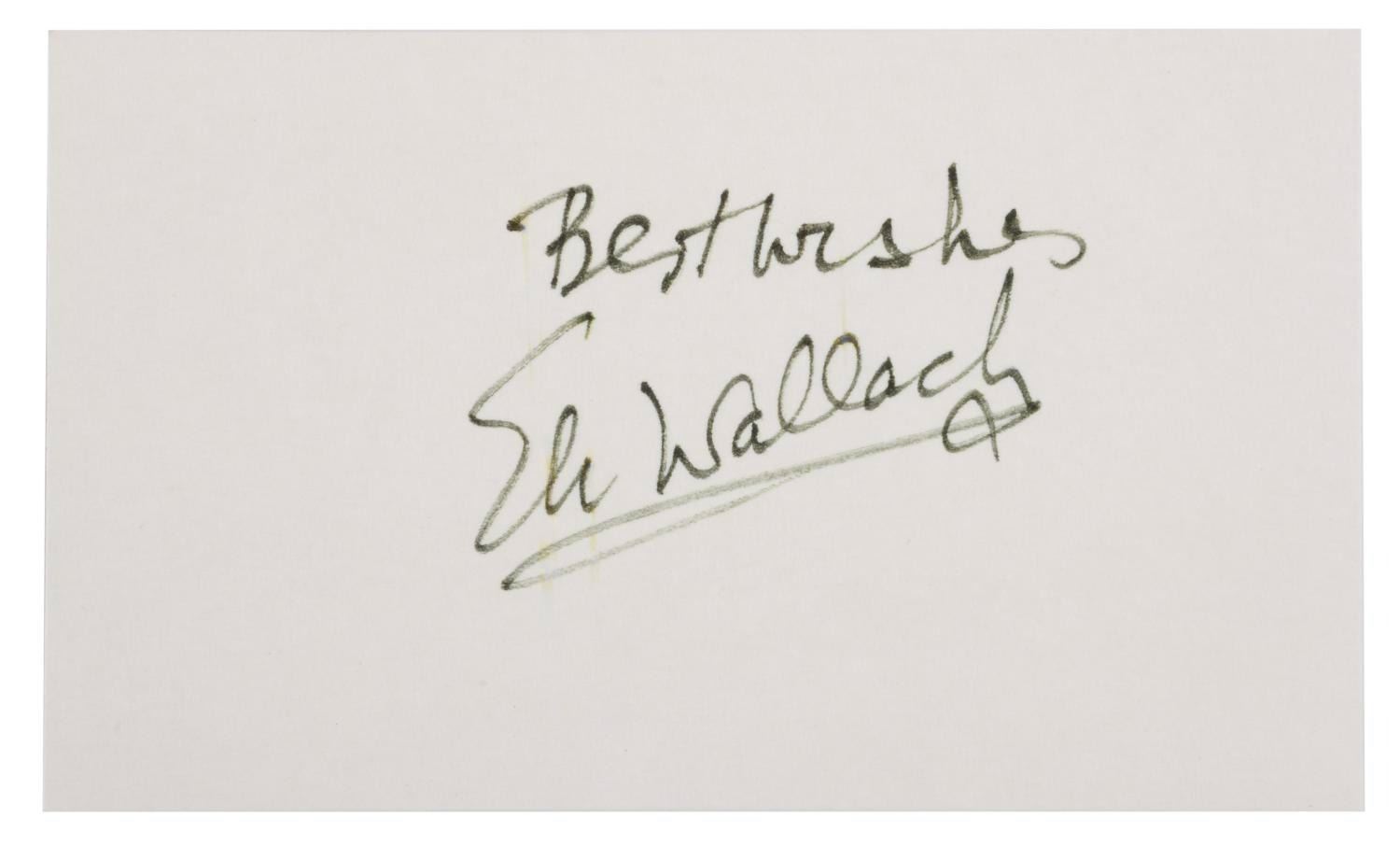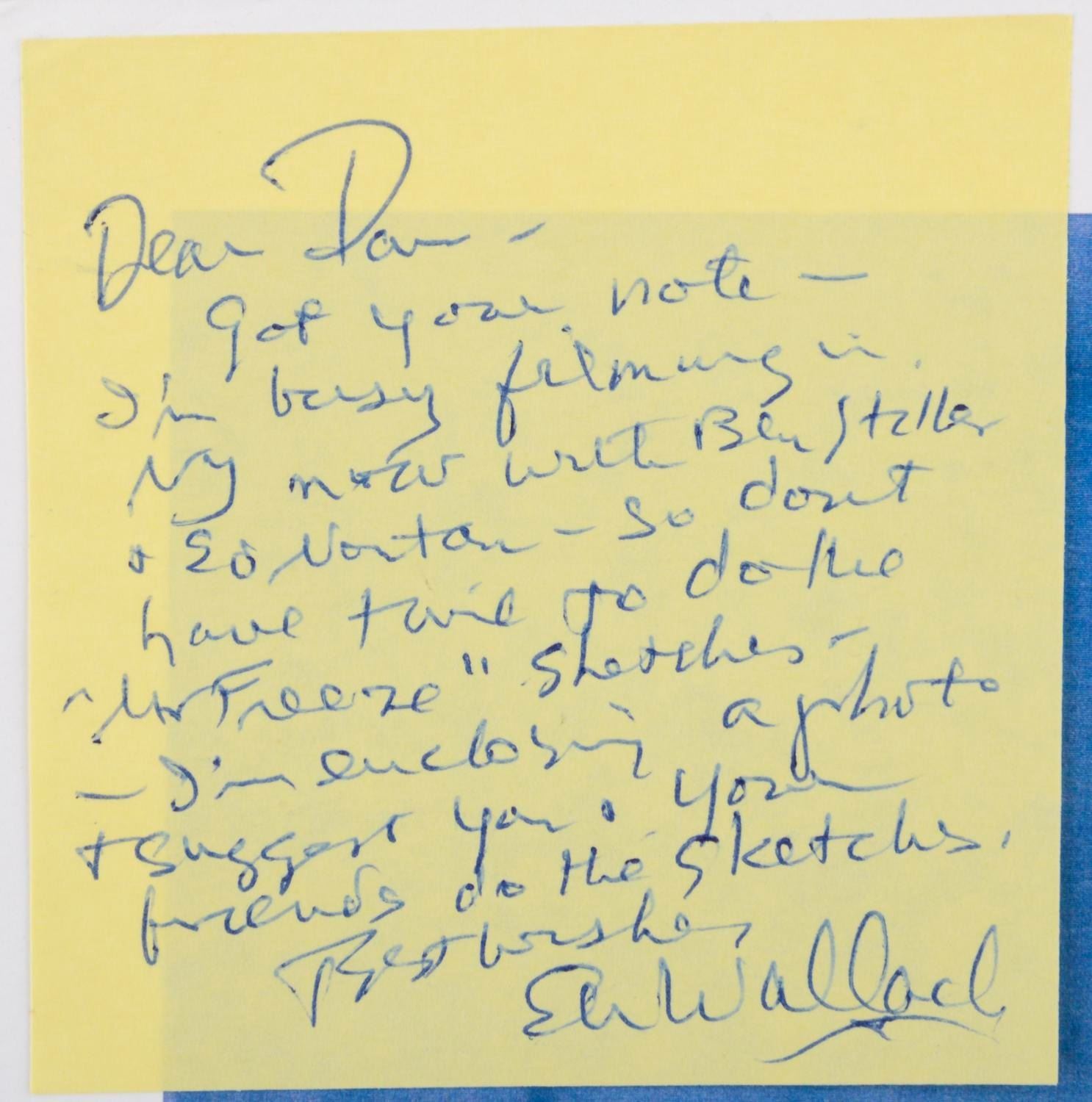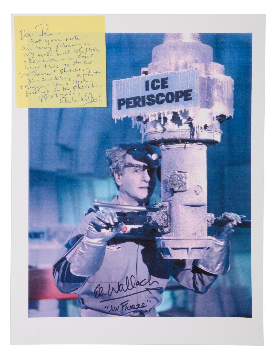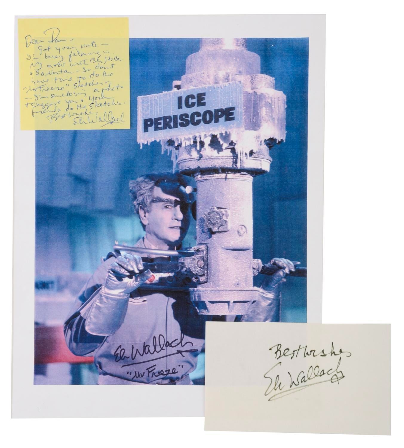 (Wallach, 1990s-2000s) A signed publicity photo of Eli Wallach as Mr. Freeze in the 1960s "Batman" television series. The inkjet print also includes a signed notecard and a signed Post-It personal note. Measuring 8.5" x 11", the photo is in fine condition.