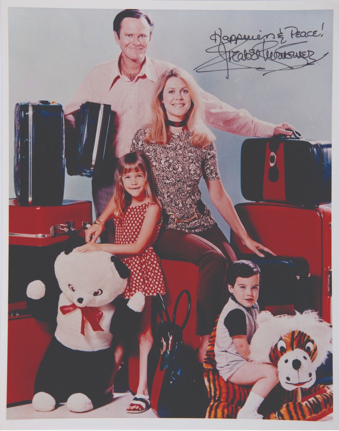 (Elizabeth Montgomery, 1980s-1990s) A publicity photo from Bewitched signed by lead actor Elizabeth Montgomery. Montgomery appears in her iconic role of Samantha Stephens, with the family cast from the final season of the show. Measuring 8"x10", the photo with autograph is in very good condition.